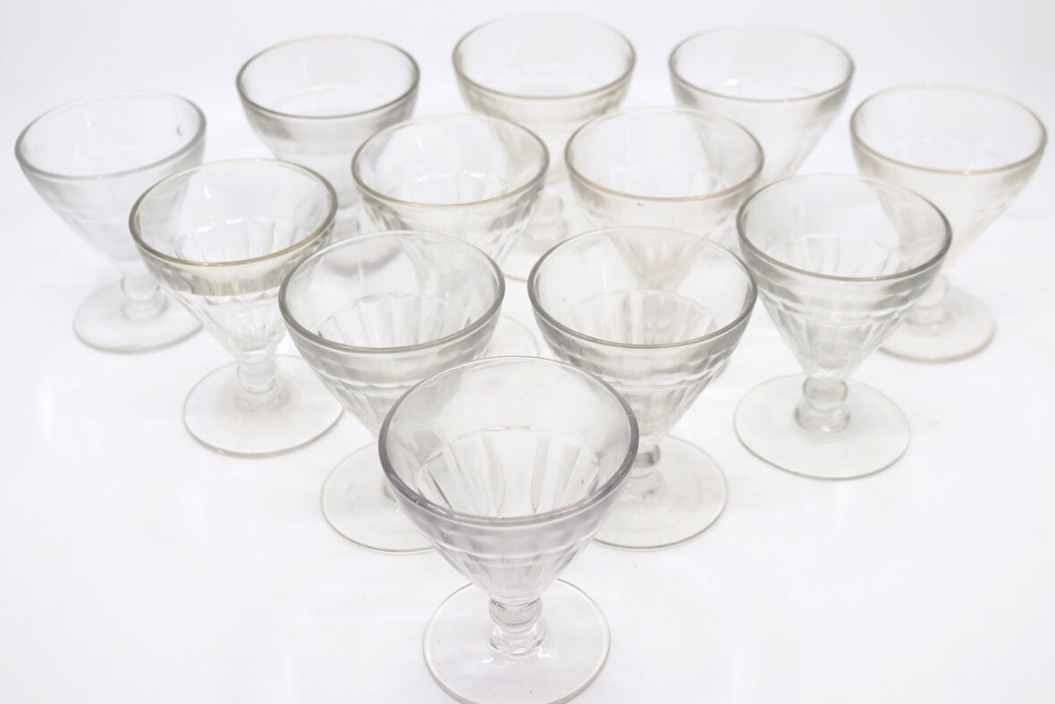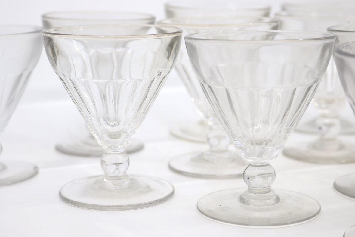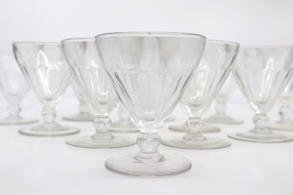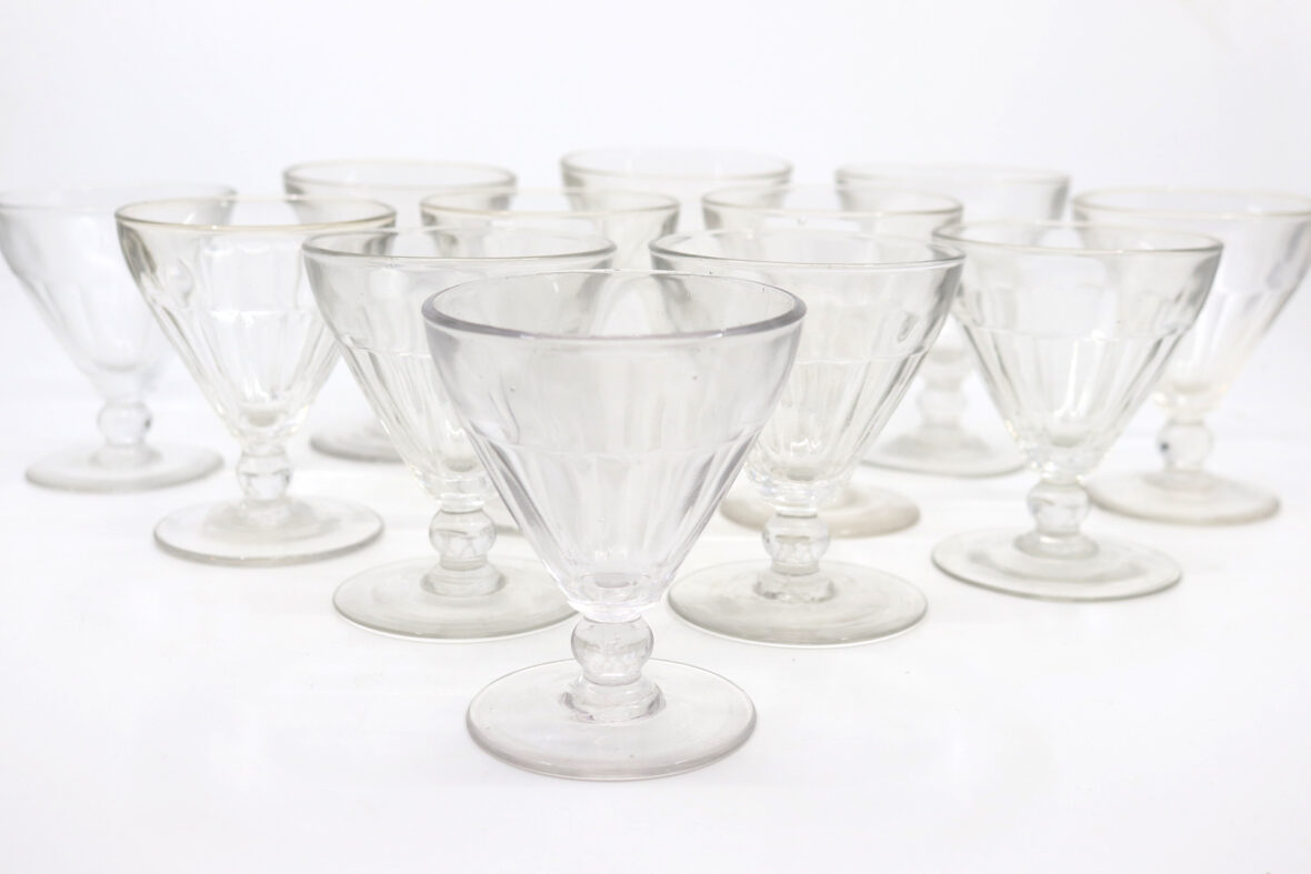 12 verres à vin en verre pressé et moulé (un éclat). Haut. : 9,6 cm