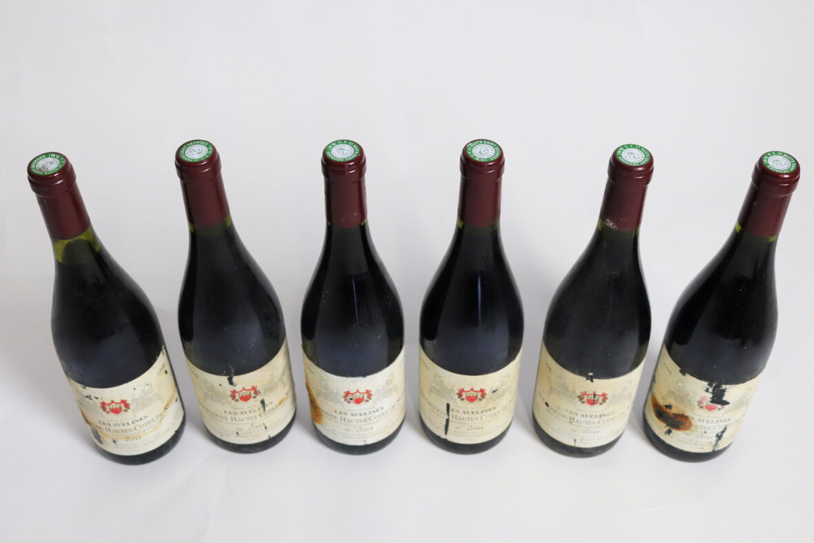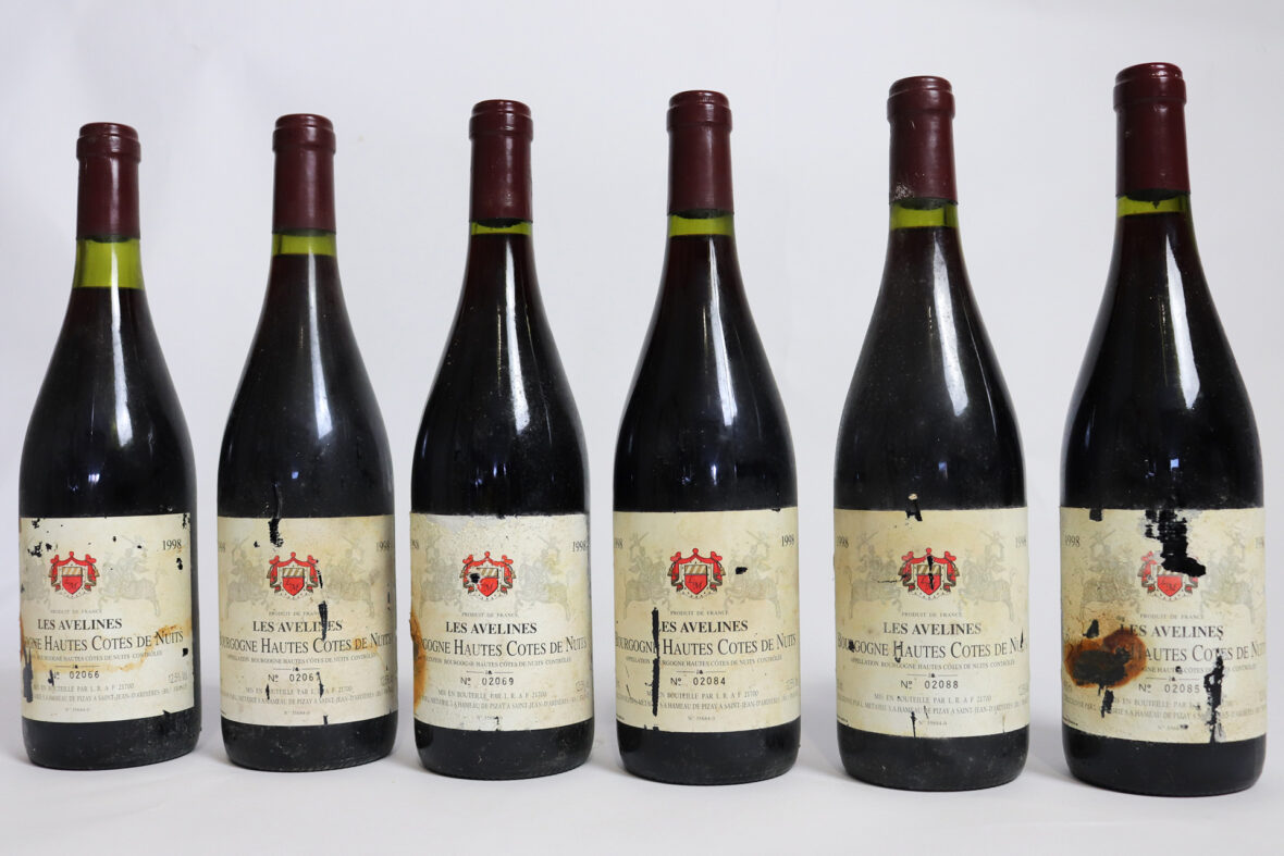 6 bouteilles Bourgogne Hautes Cotes de Nuits Les Avelines, 1998 (5 bouteilles moins de 2 cm et 1 bouteille entre 2 et 4 cm).