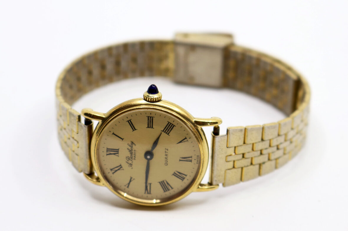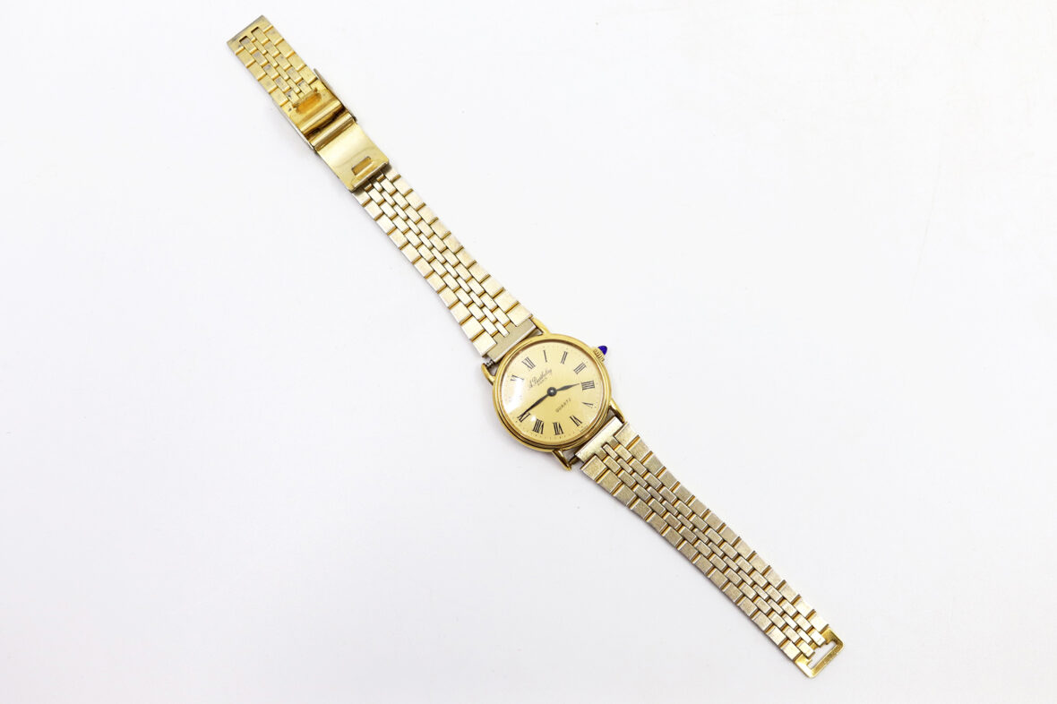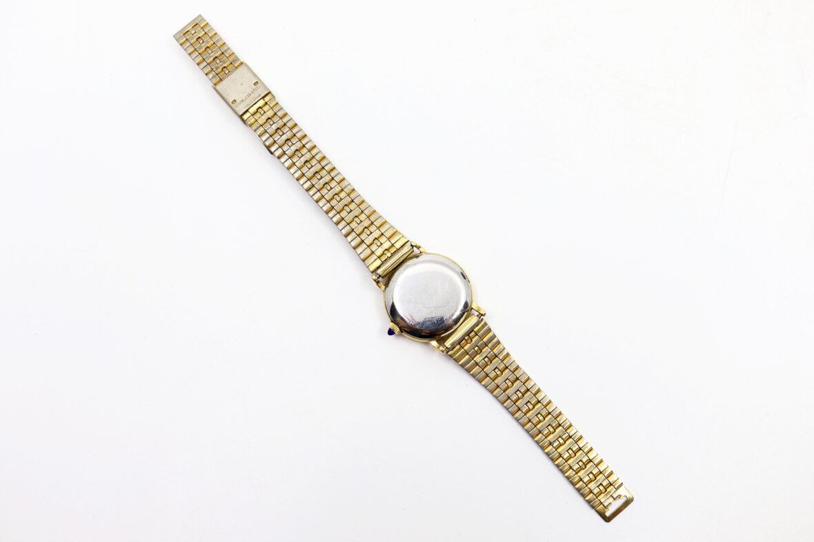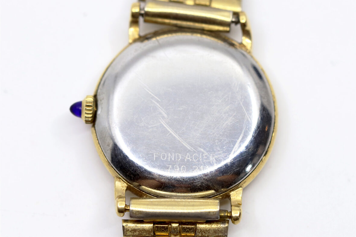 Montre bracelet de dame en acier doré. Le boîtier rond à cadran doré et index à chiffres romains. Signée.