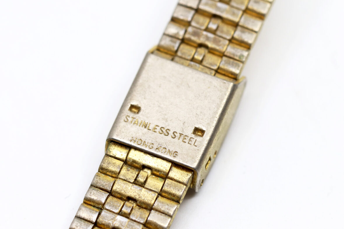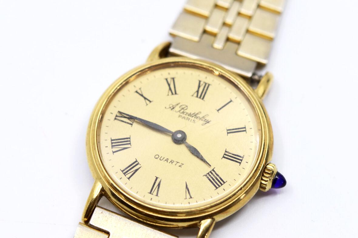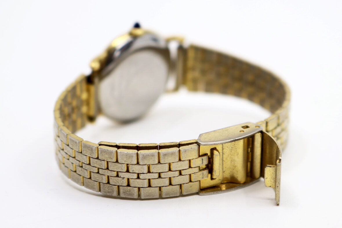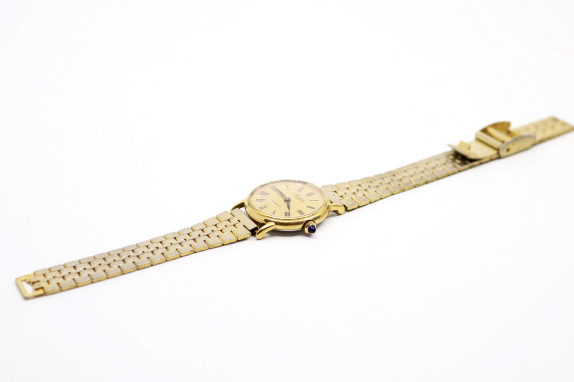 Montre bracelet de dame en acier doré. Le boîtier rond à cadran doré et index à chiffres romains. Signée.