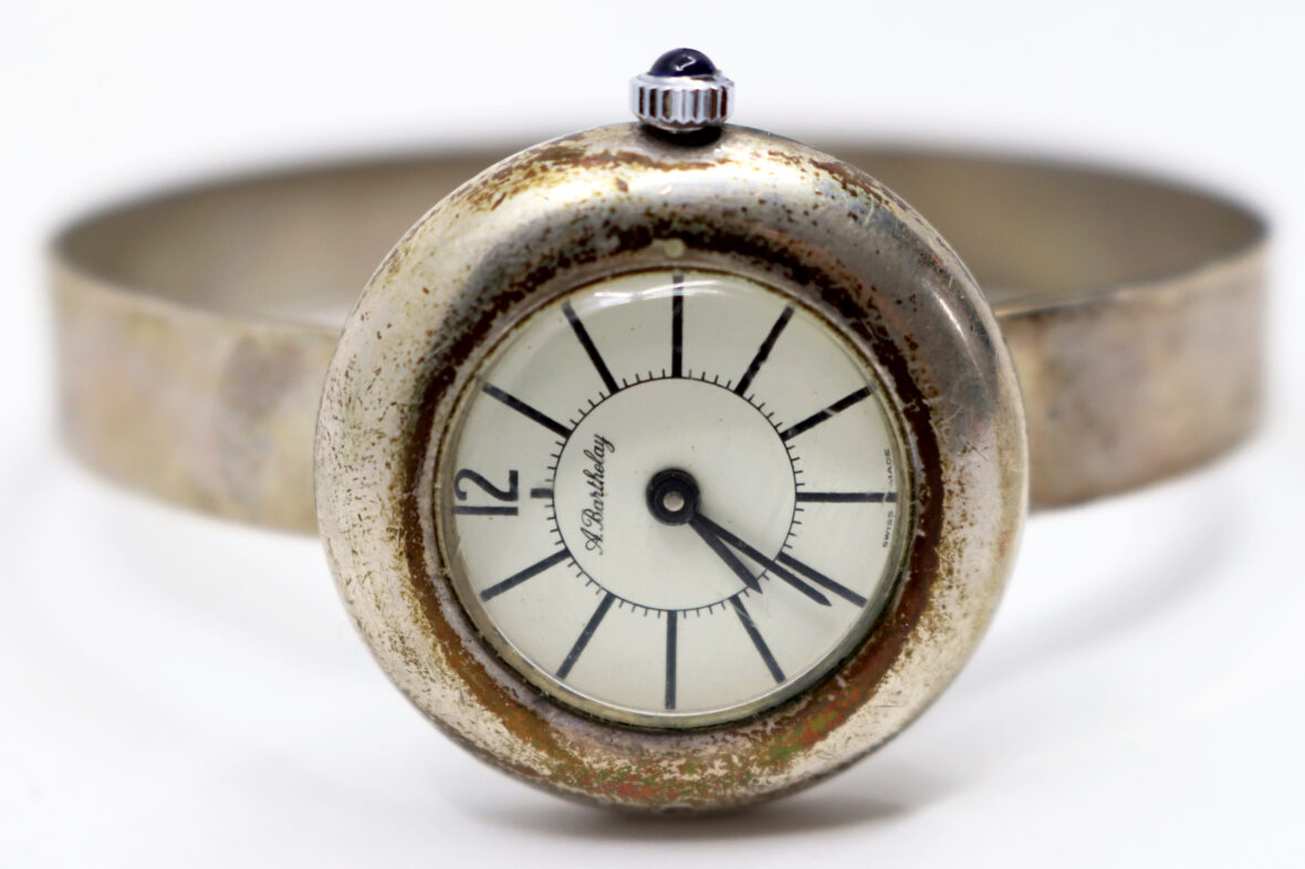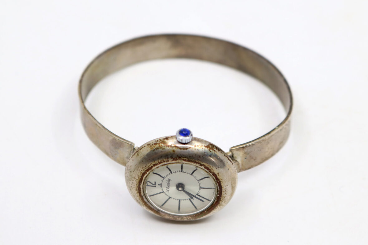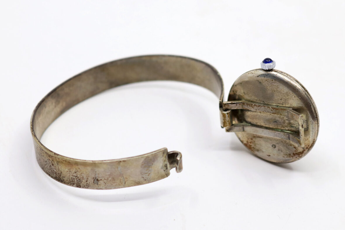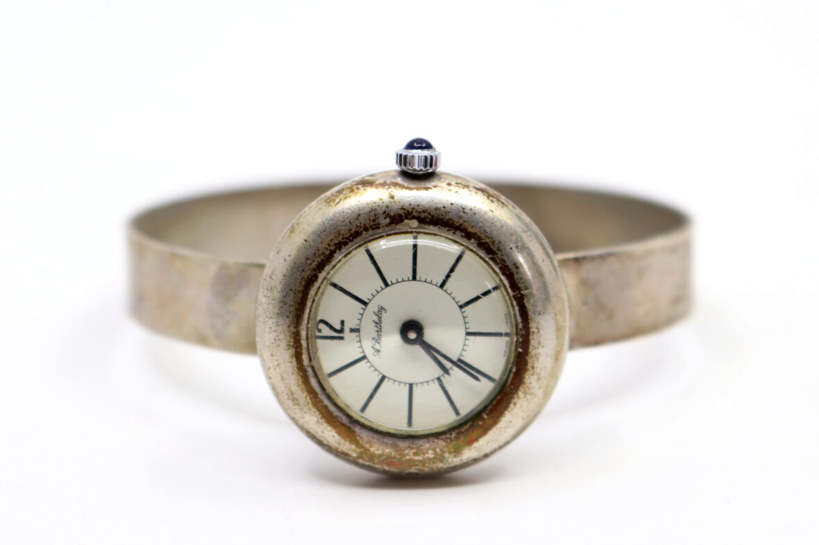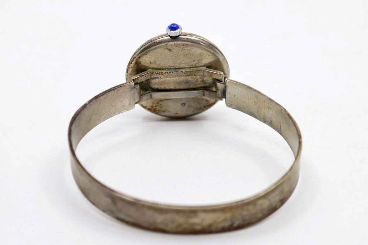 Montre bracelet de dame en argent 800. Le boîtier rond à cadran émaillé blanc et index bâtons. Signée.