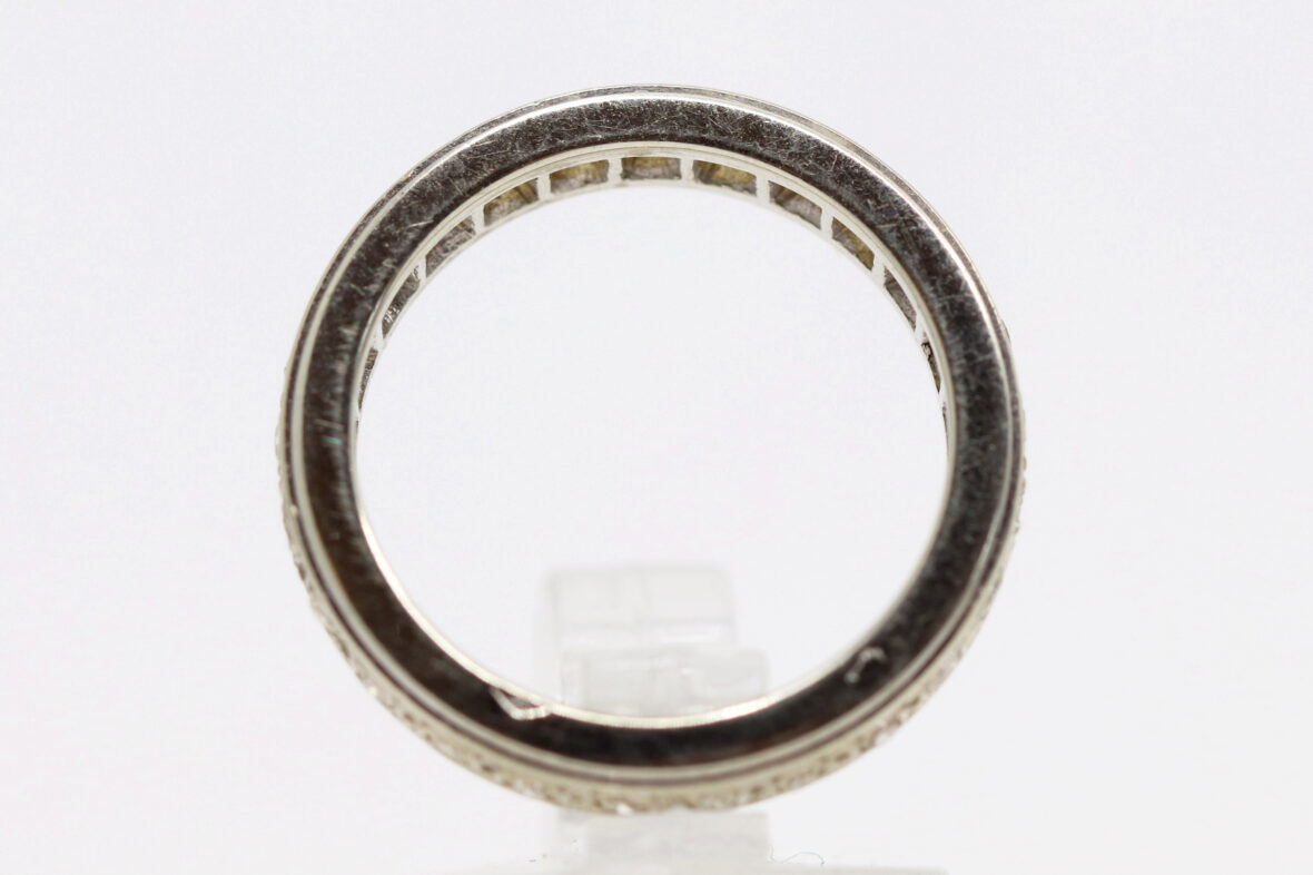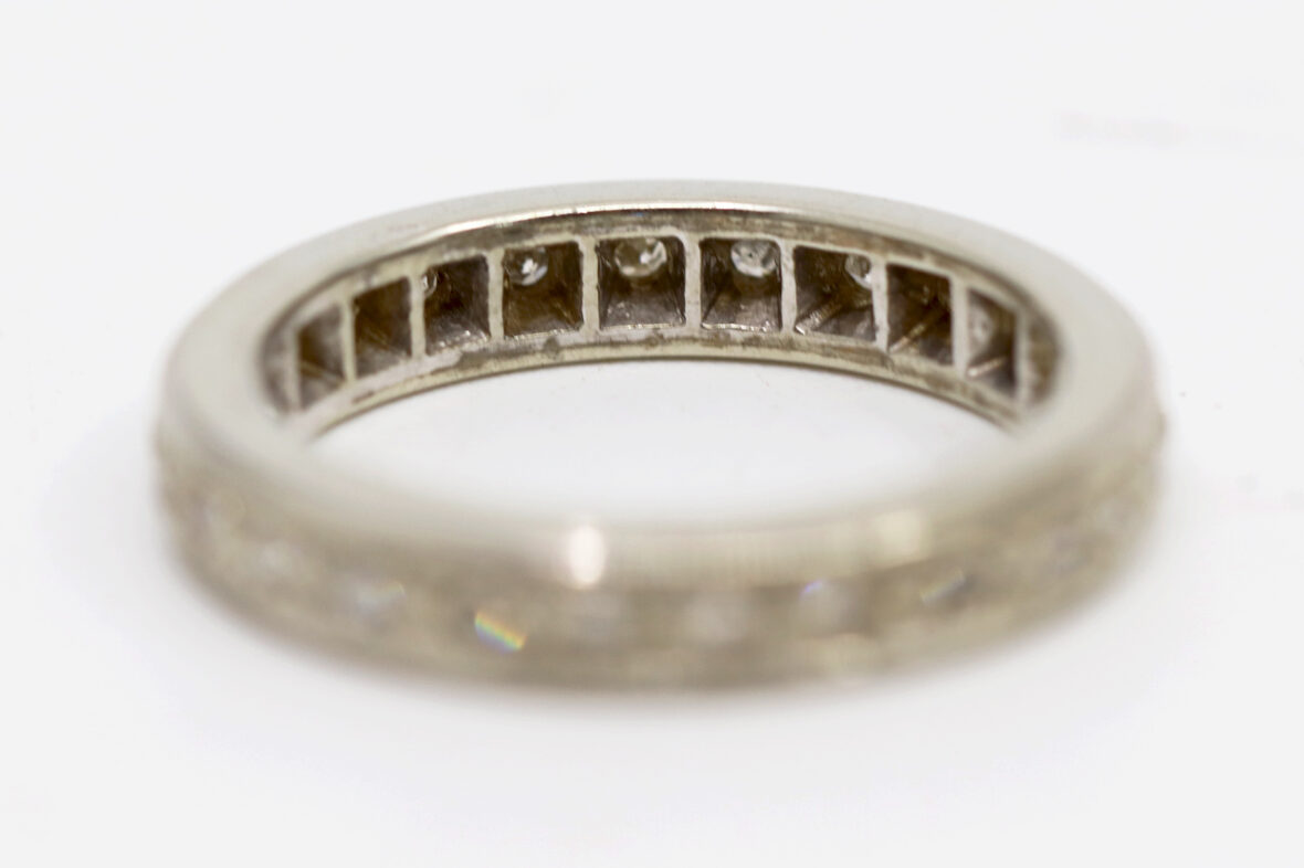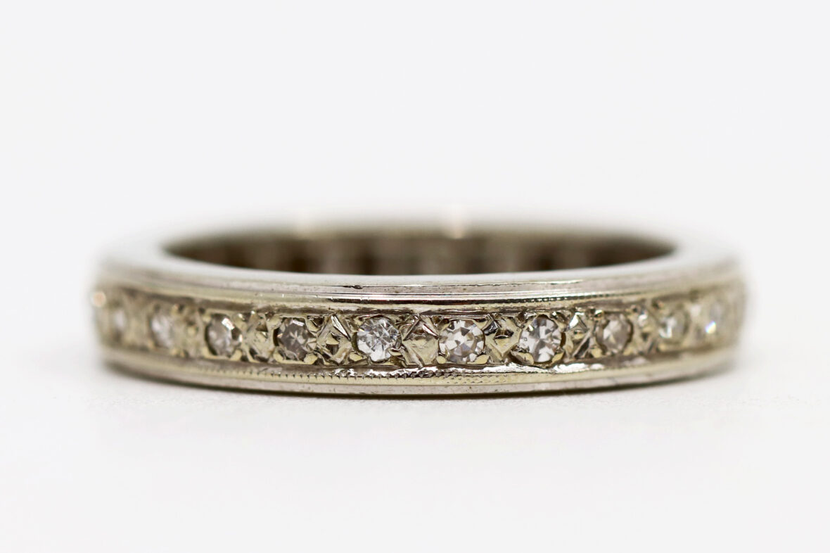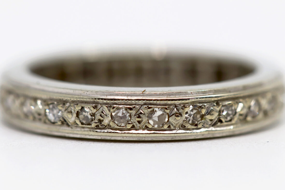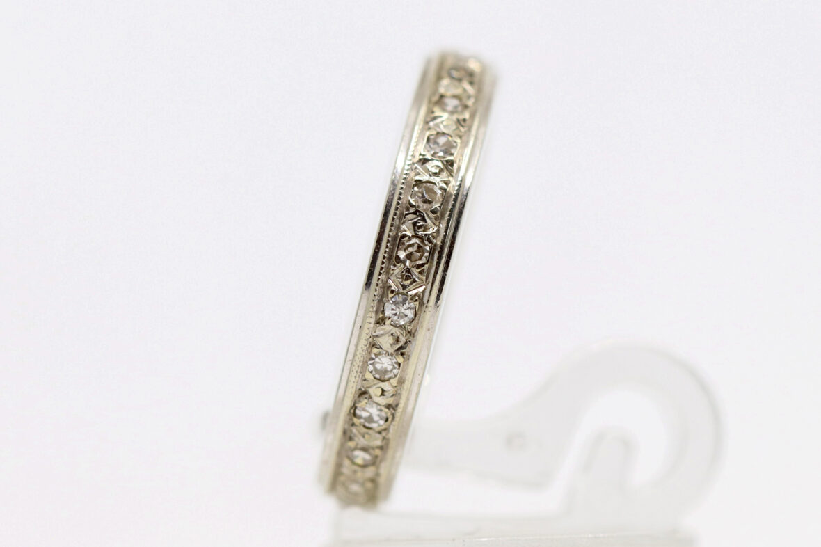 Alliance américaine en or gris sertie de petits diamants. TDD : 48