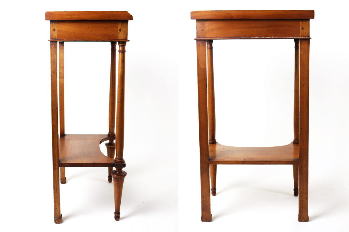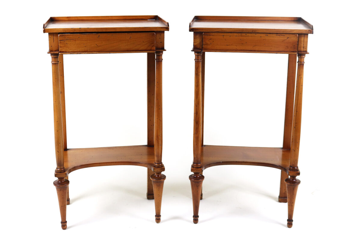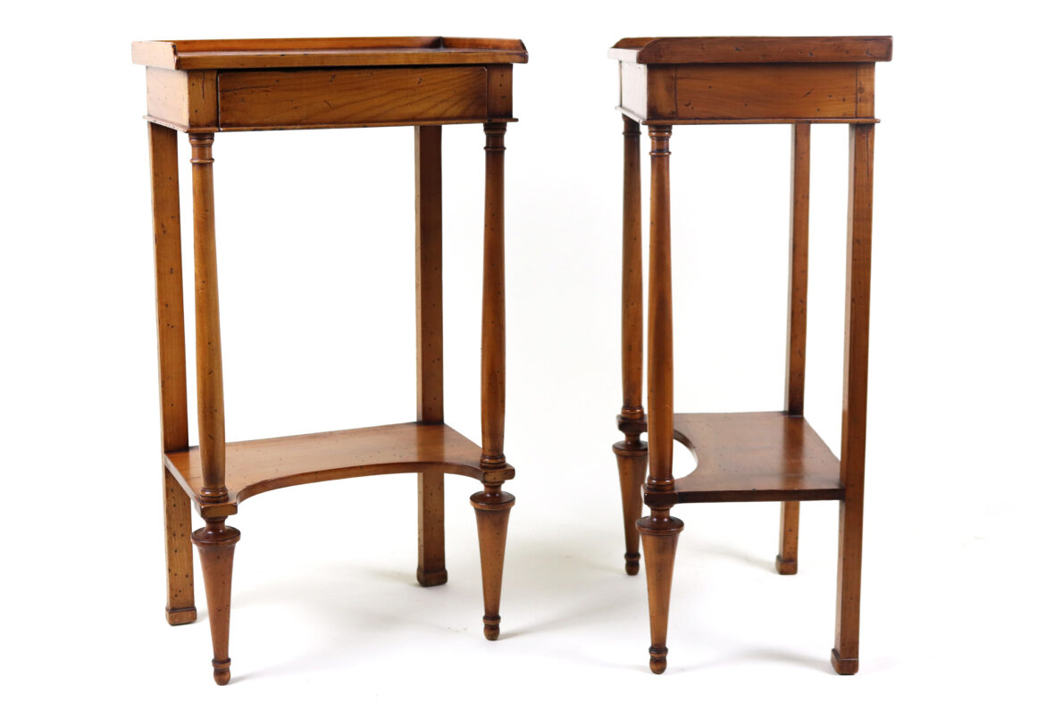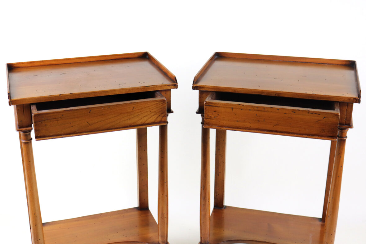 Paire de chevets en bois et placage de bois de style Directoire, ouvrant par un tiroir en ceinture. Le piètement réuni par un plateau d’entretoise. Marque à la Salamandre sous le plateau d’entretoise.