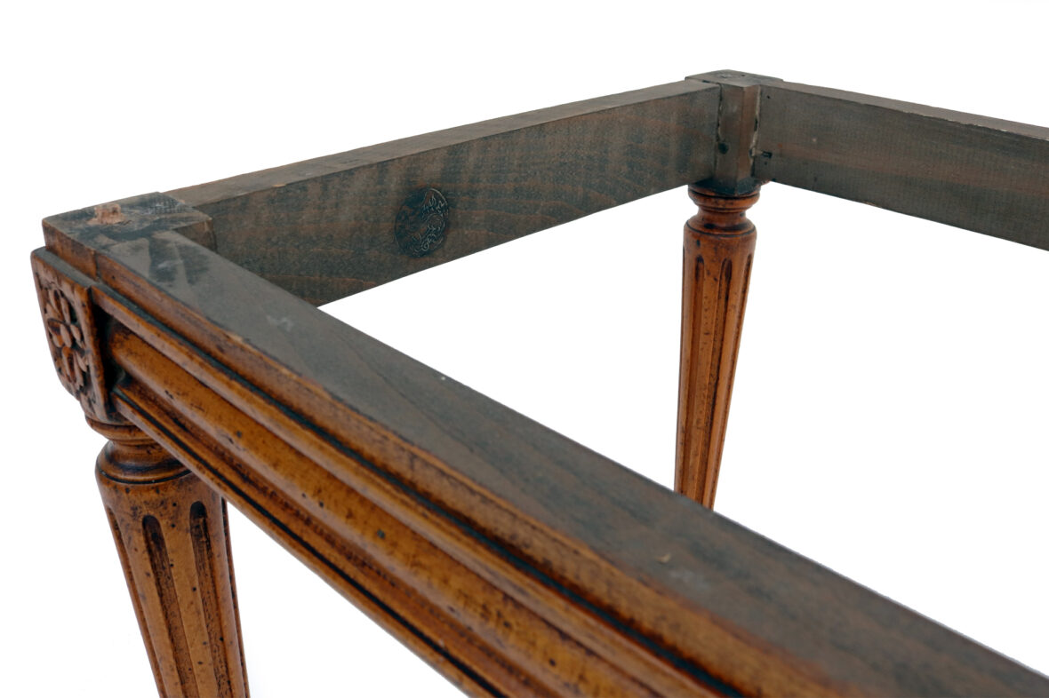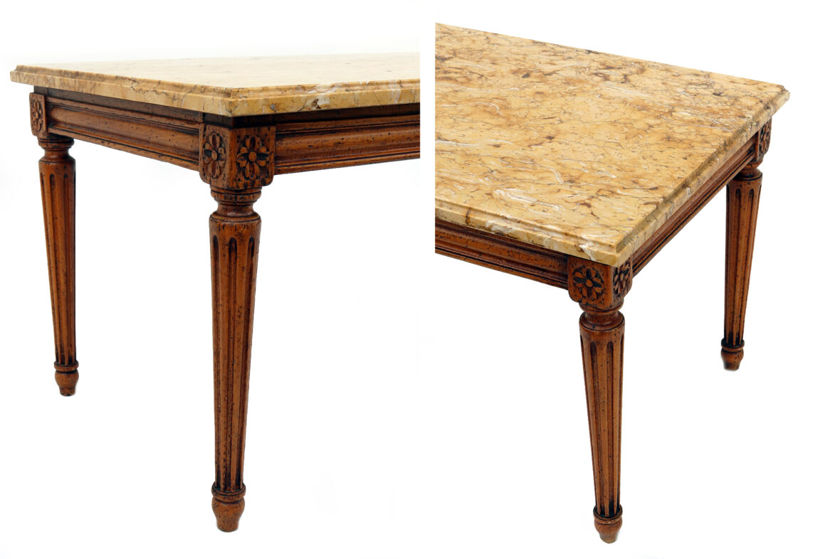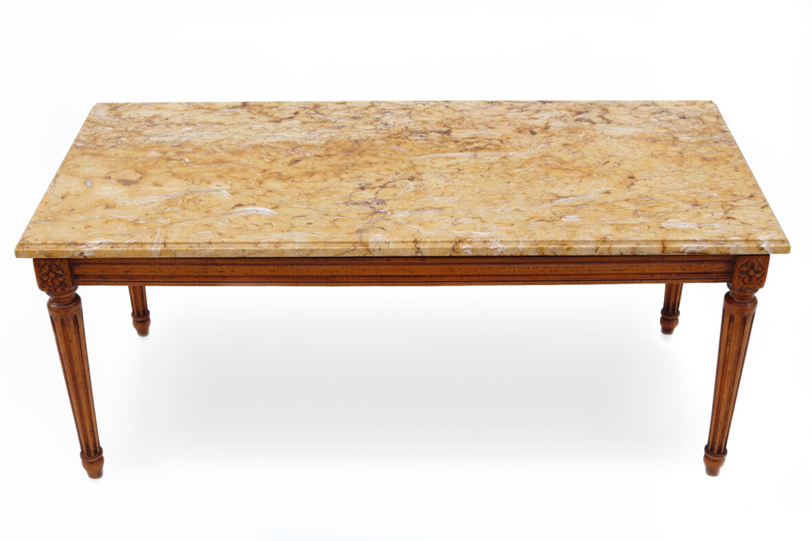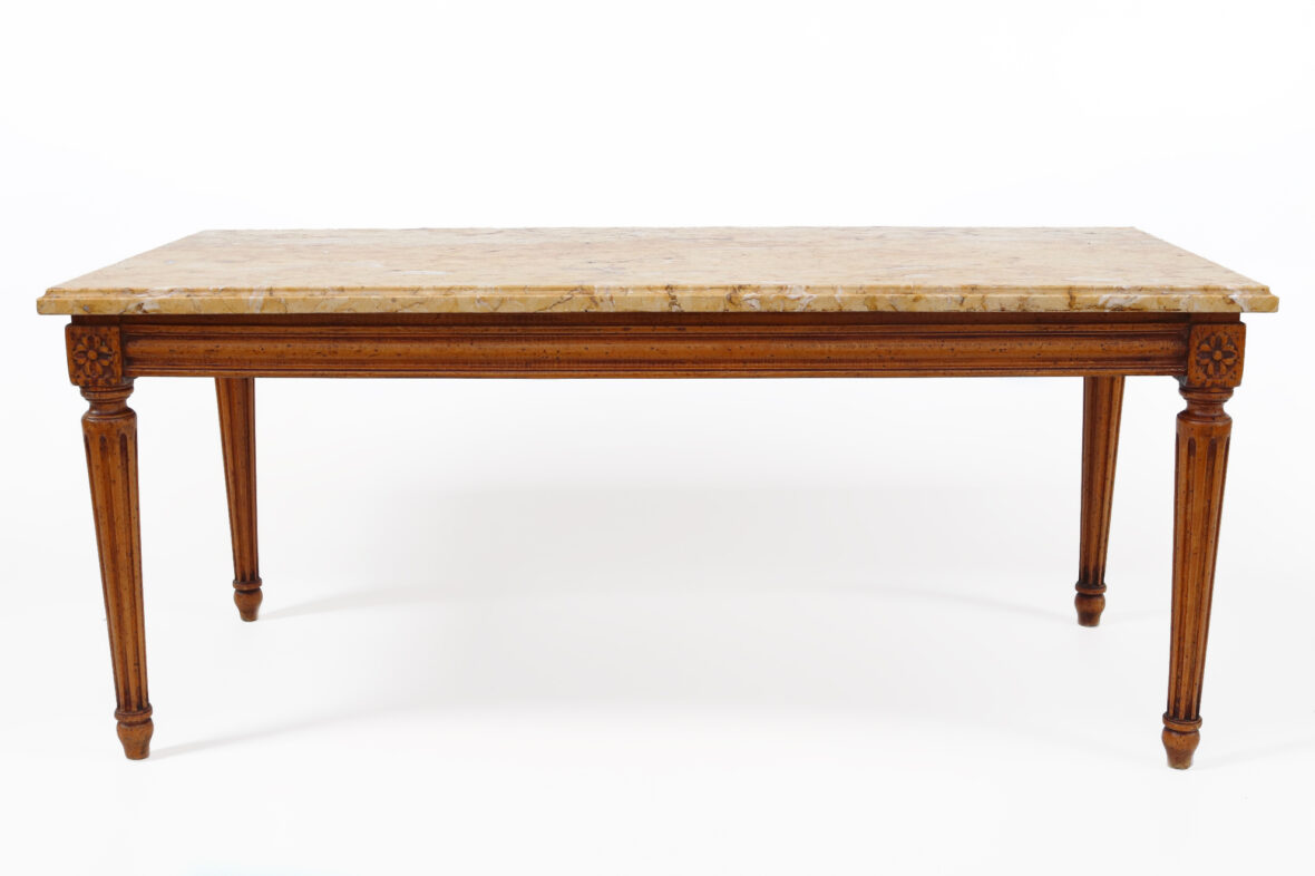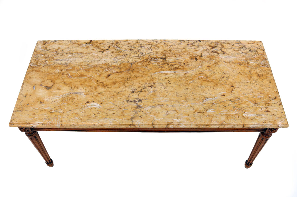 Table basse de style Louis XVI en bois sculpté et mouluré, les quatre pieds fuselés et cannelés, le plateau de marbre jaune de Sienne.