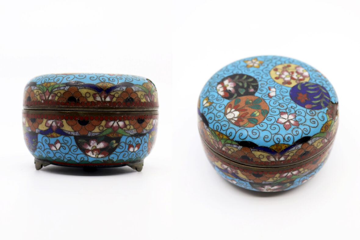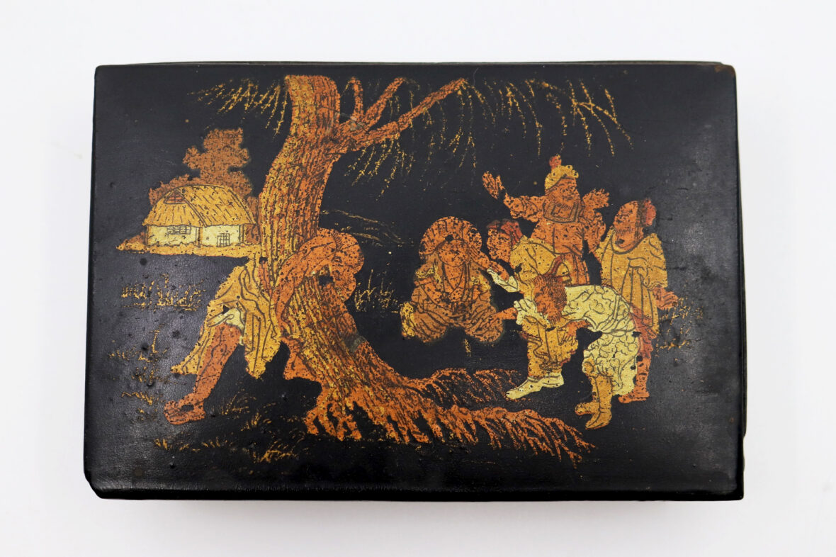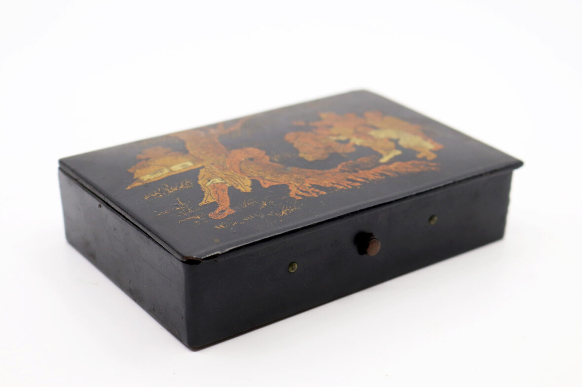 On y joint une petite boite en bois peinte à décor de scène animée.