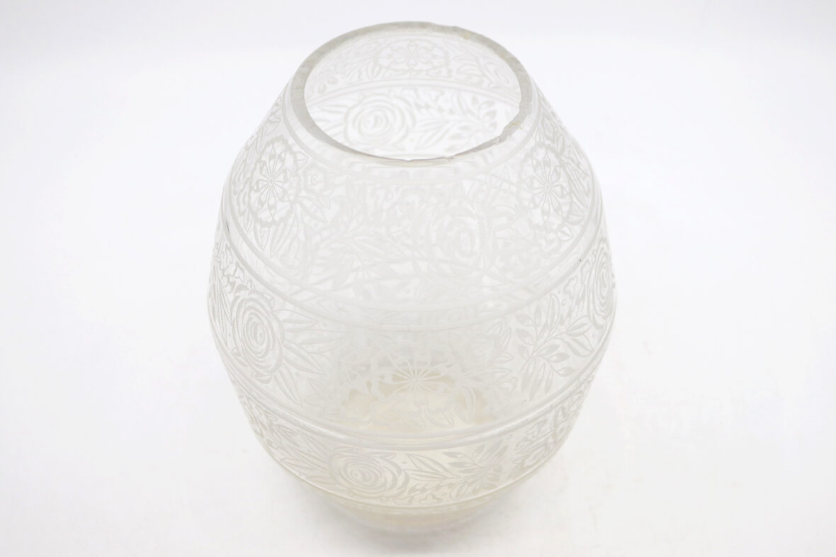Vase tonneau en cristal translucide à fin décor gravé de fleurs stylisées.