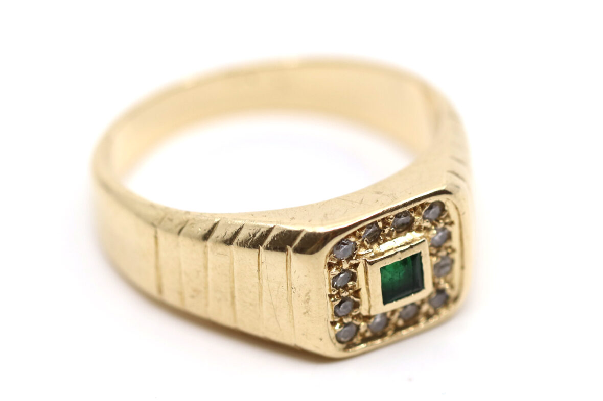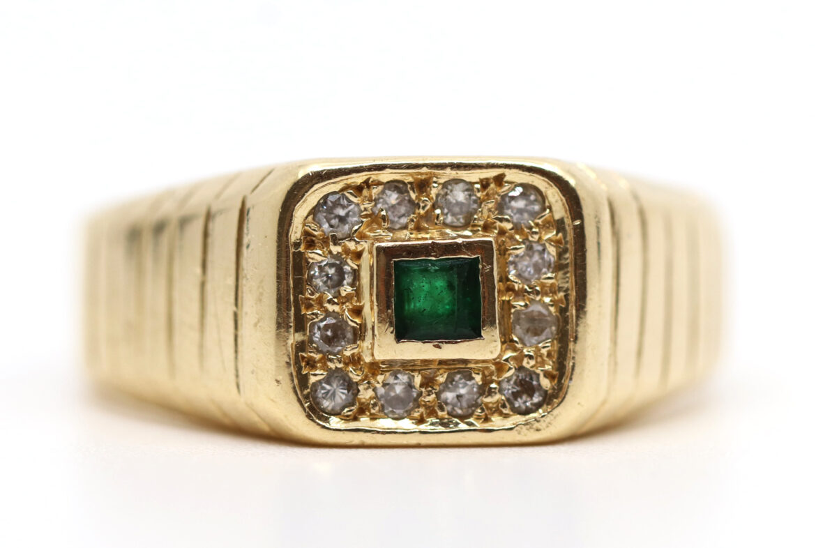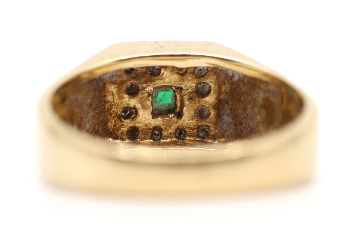 Bague chevalière en or jaune ornée au centre d’une petite émeraude taillée en carré et ceinte de petites roses.