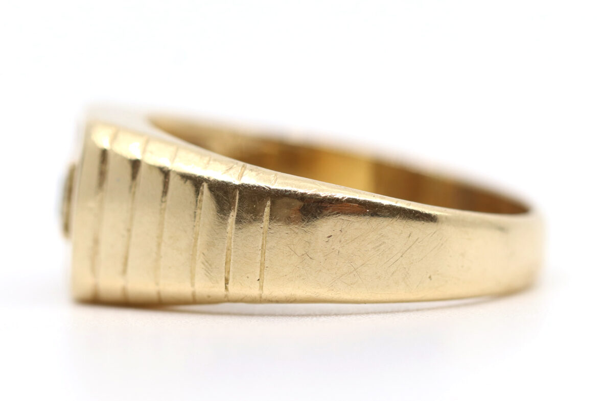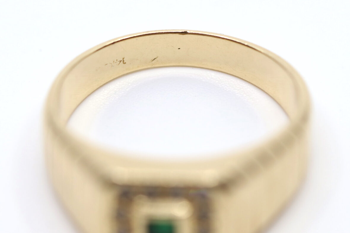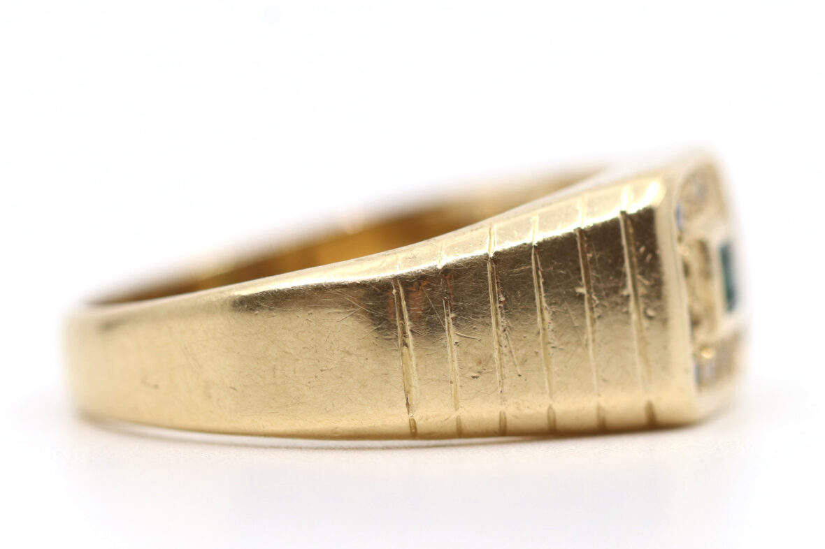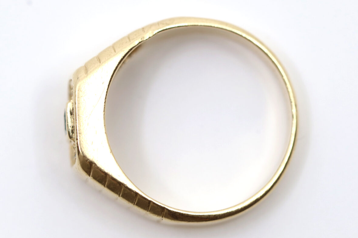 Bague chevalière en or jaune ornée au centre d’une petite émeraude taillée en carré et ceinte de petites roses.