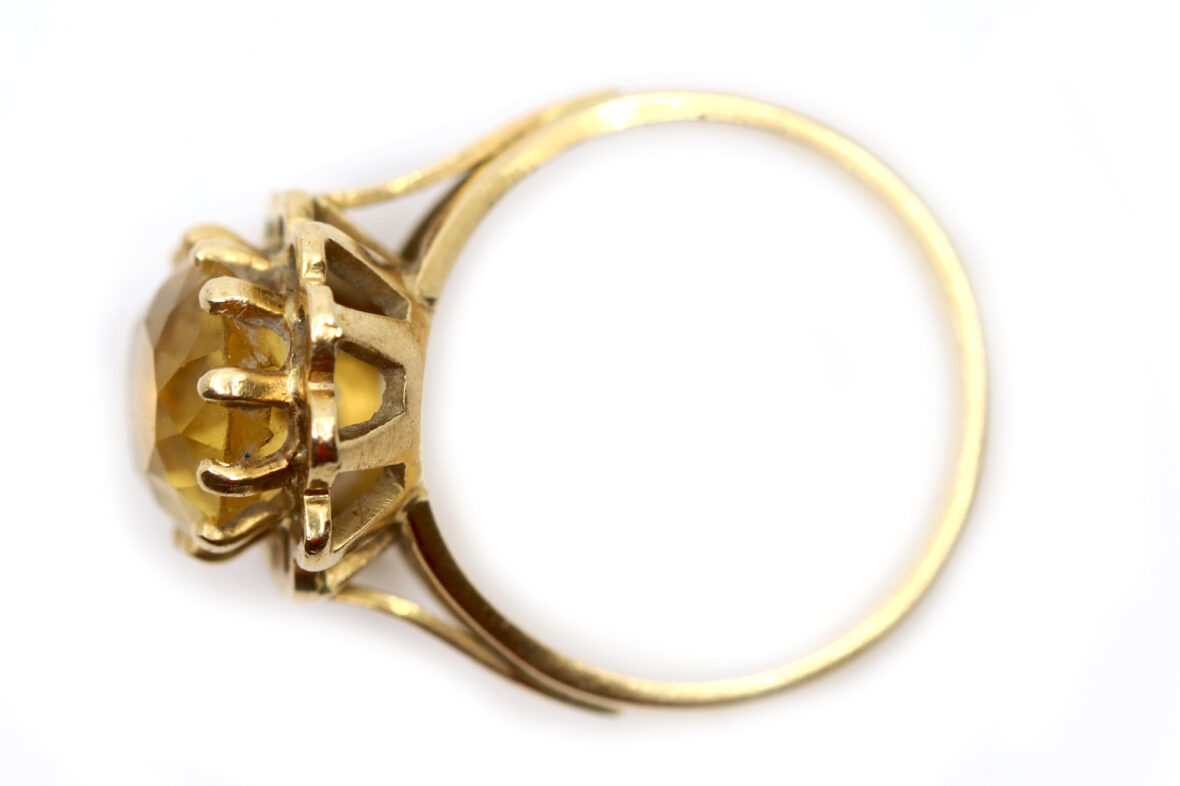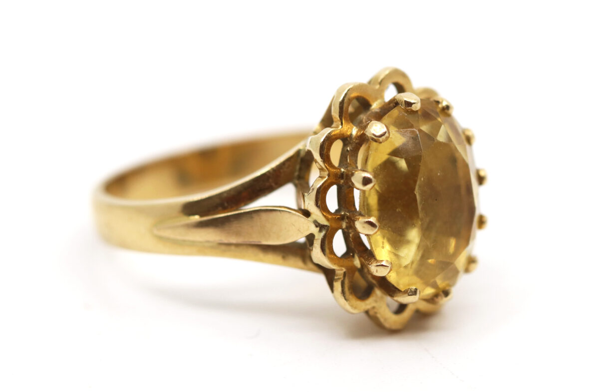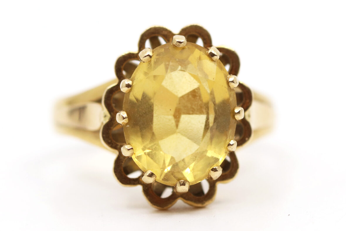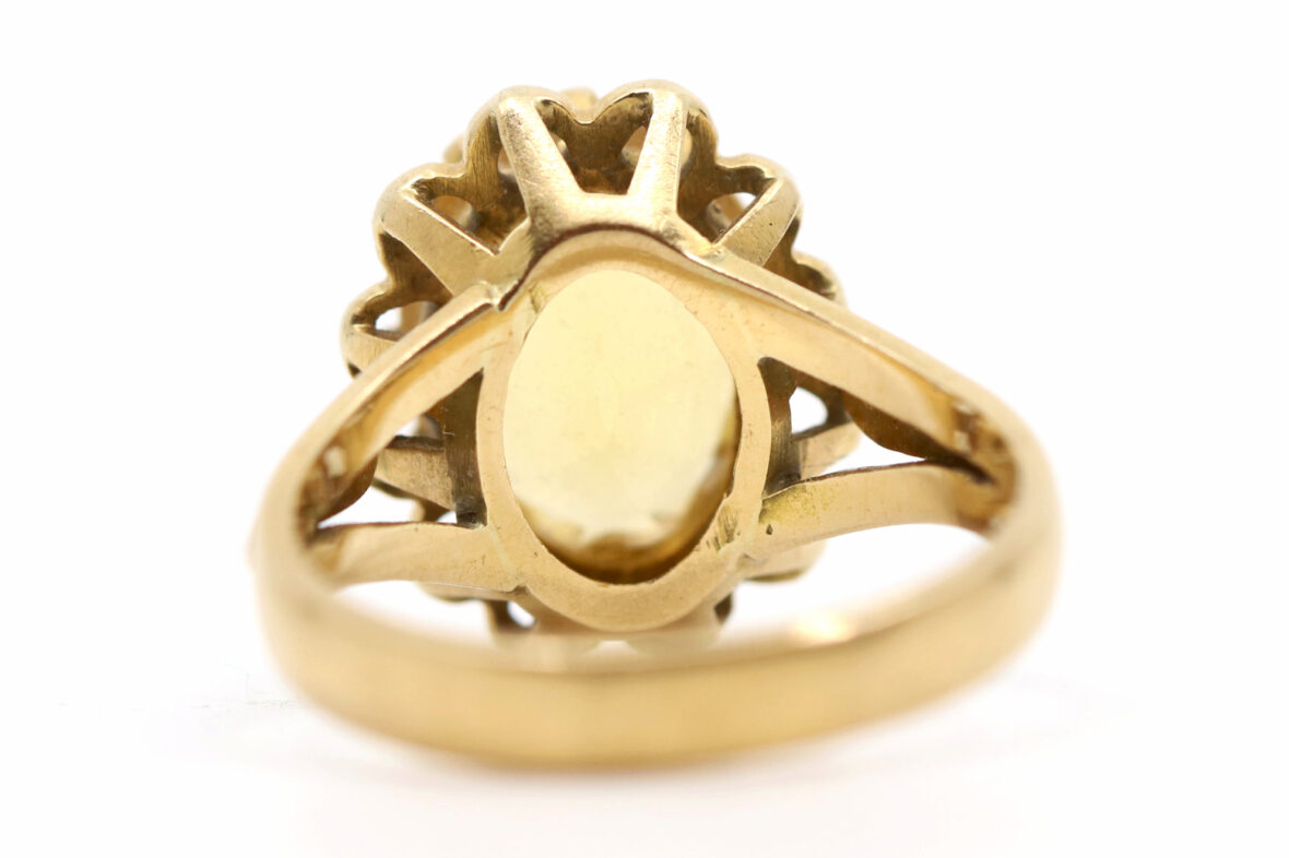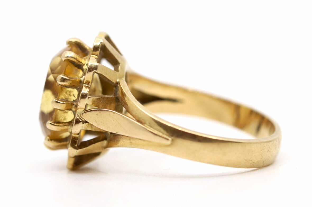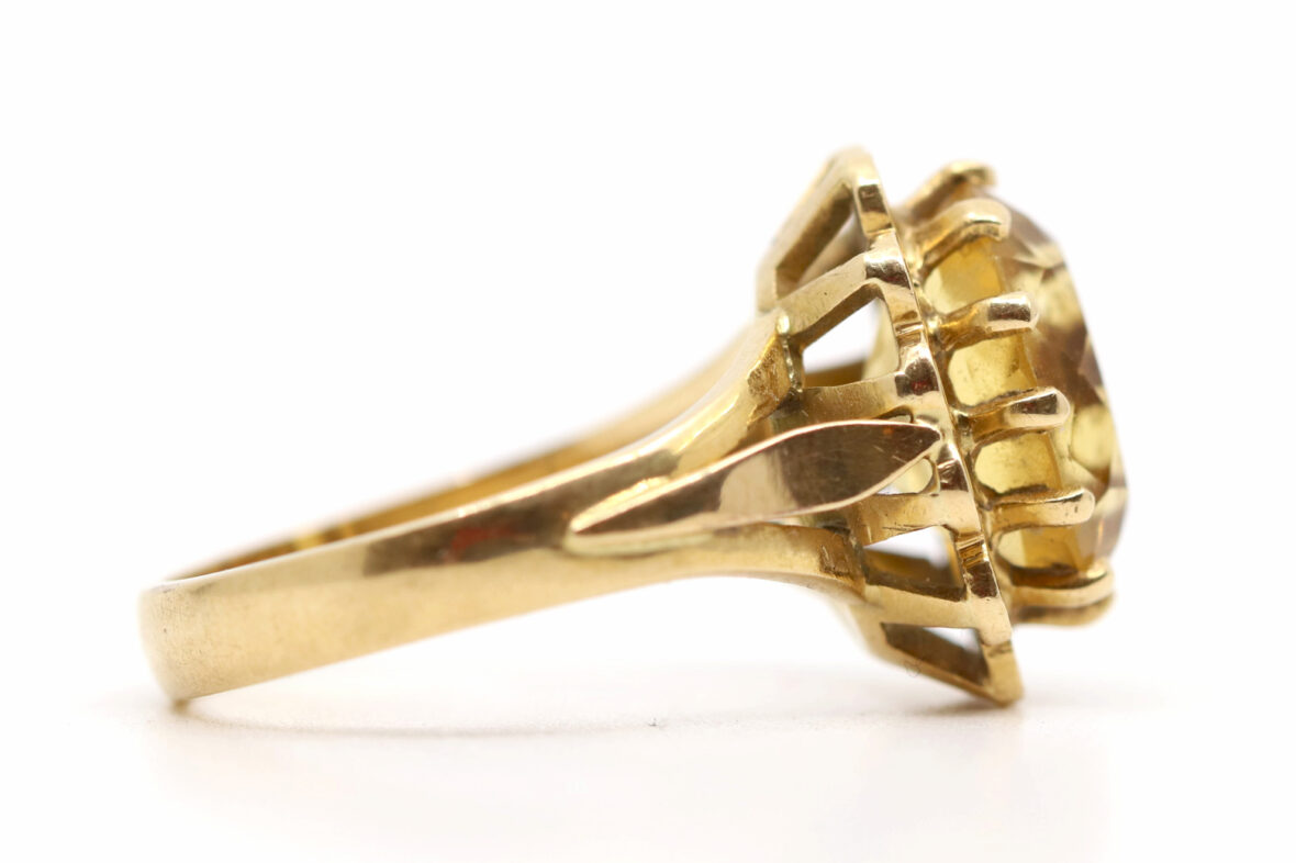Bague de type marguerite en or jaune ornée d’une importante citrine de taille ovale.