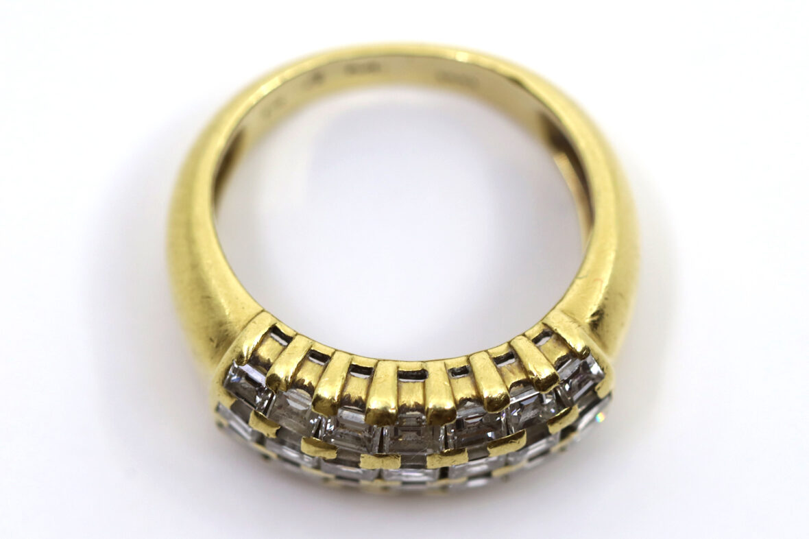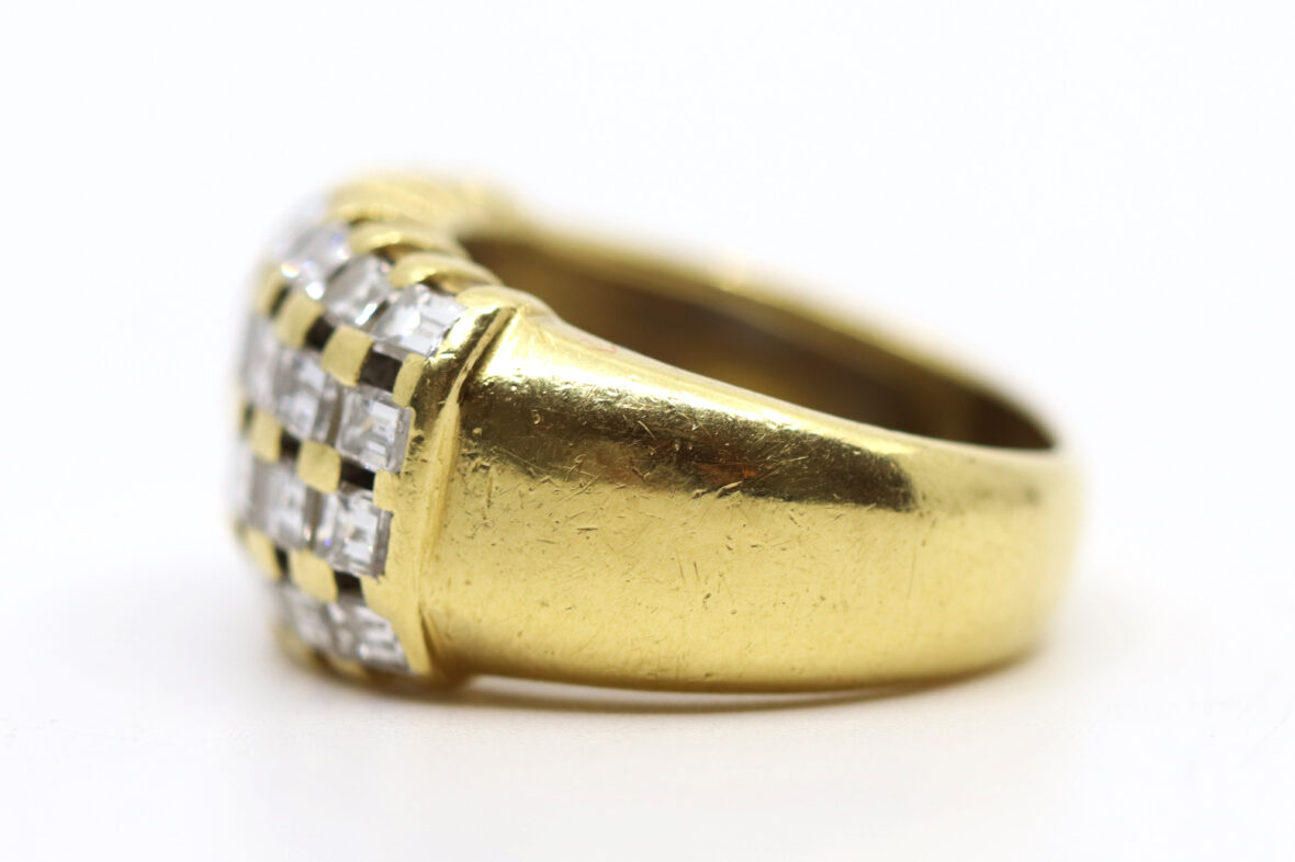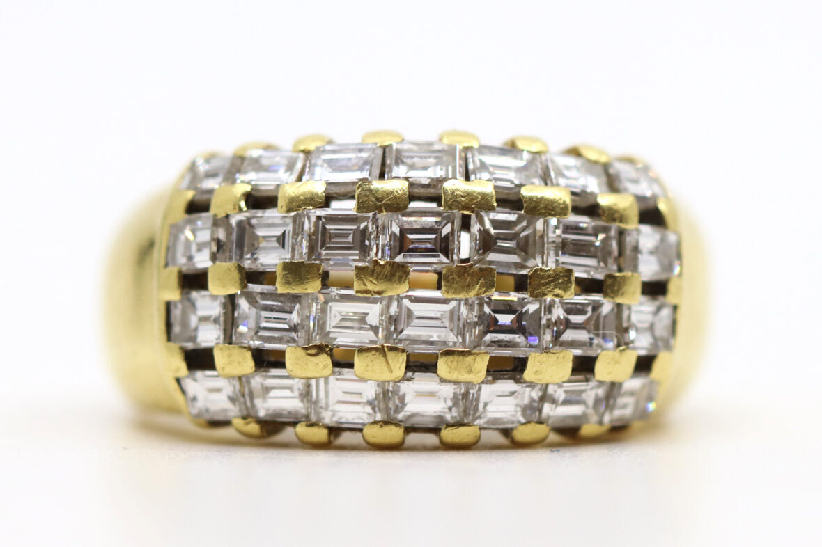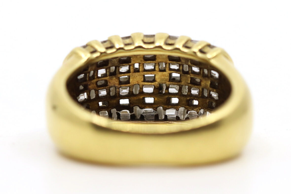 Bague dôme en or jaune à pavage de diamants baguettes. Poids : 7,6 g
