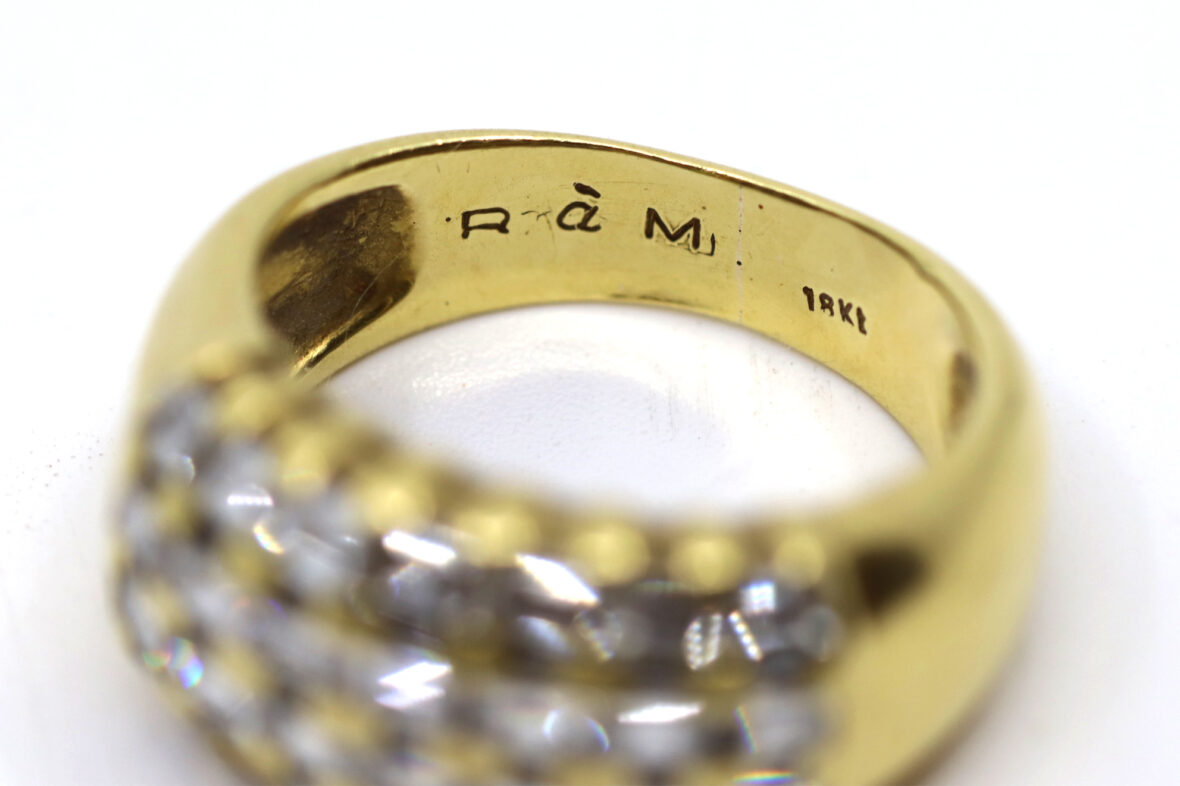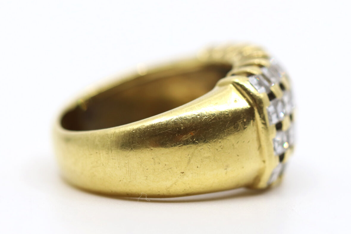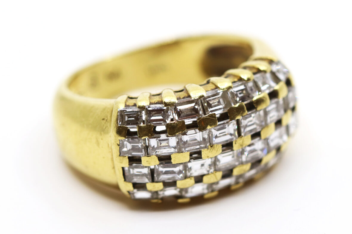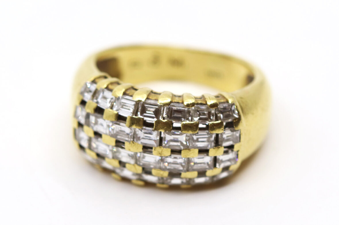 Bague dôme en or jaune à pavage de diamants baguettes. Poids : 7,6 g