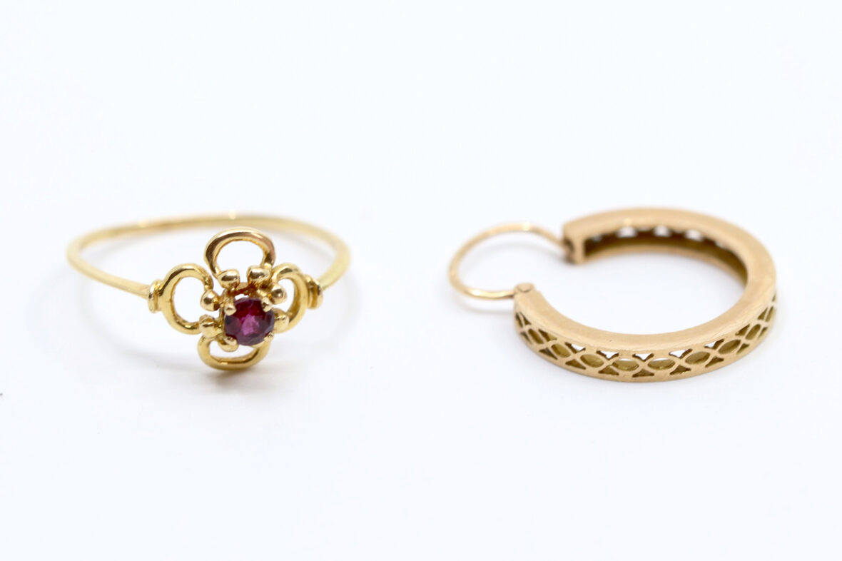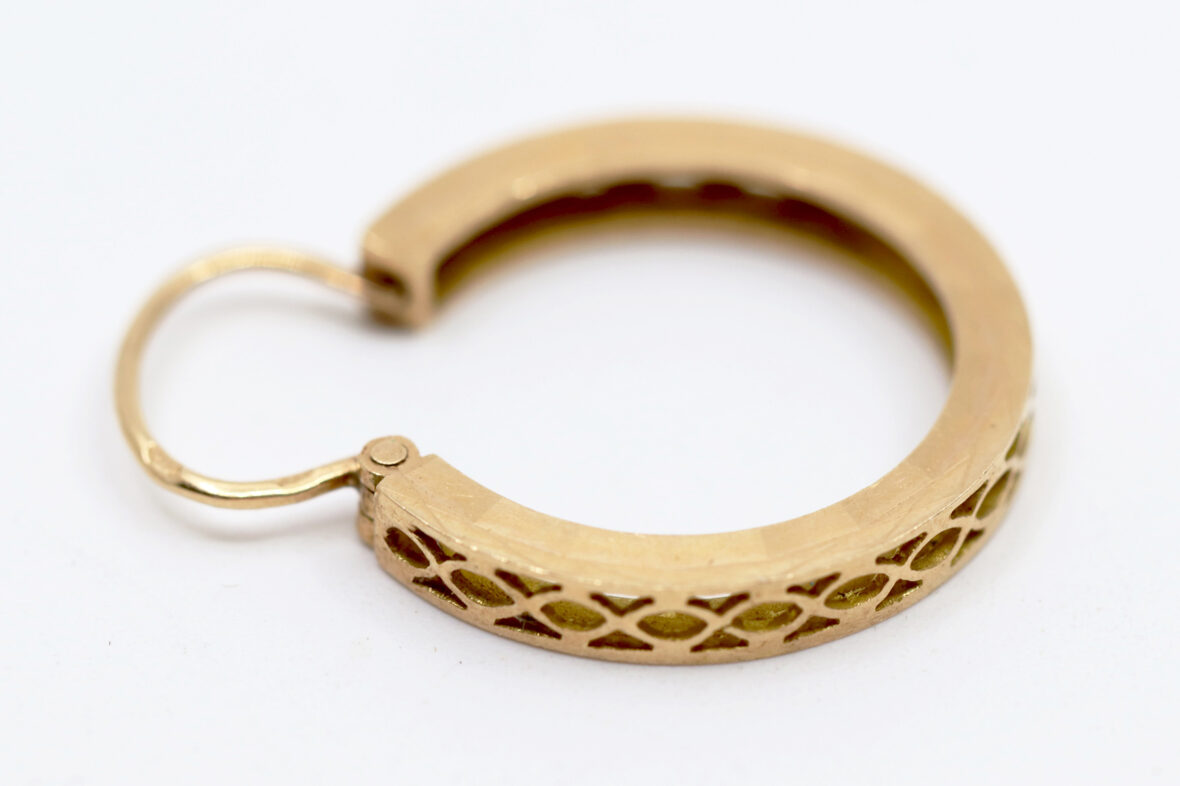 On y joint une boucle d’oreille créole en or jaune à décor filigrané.