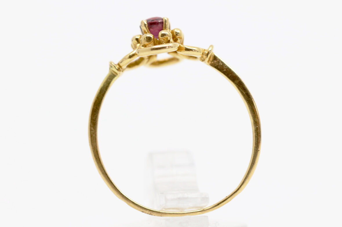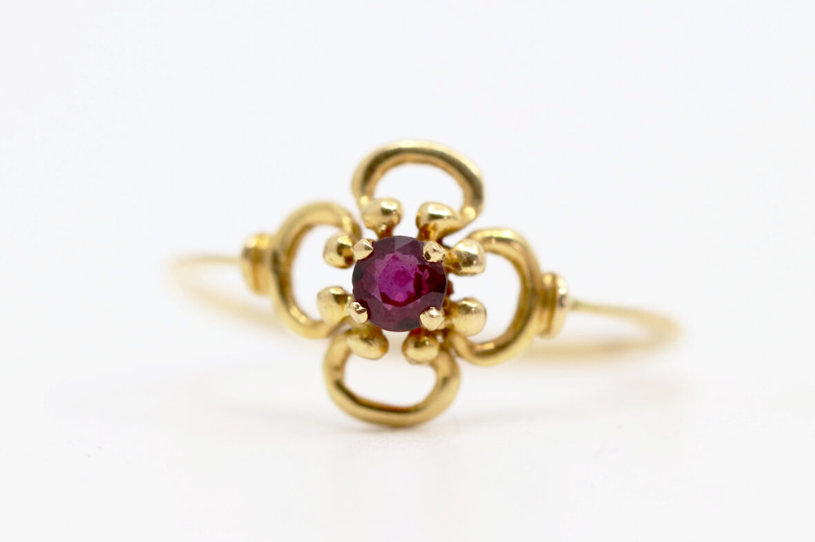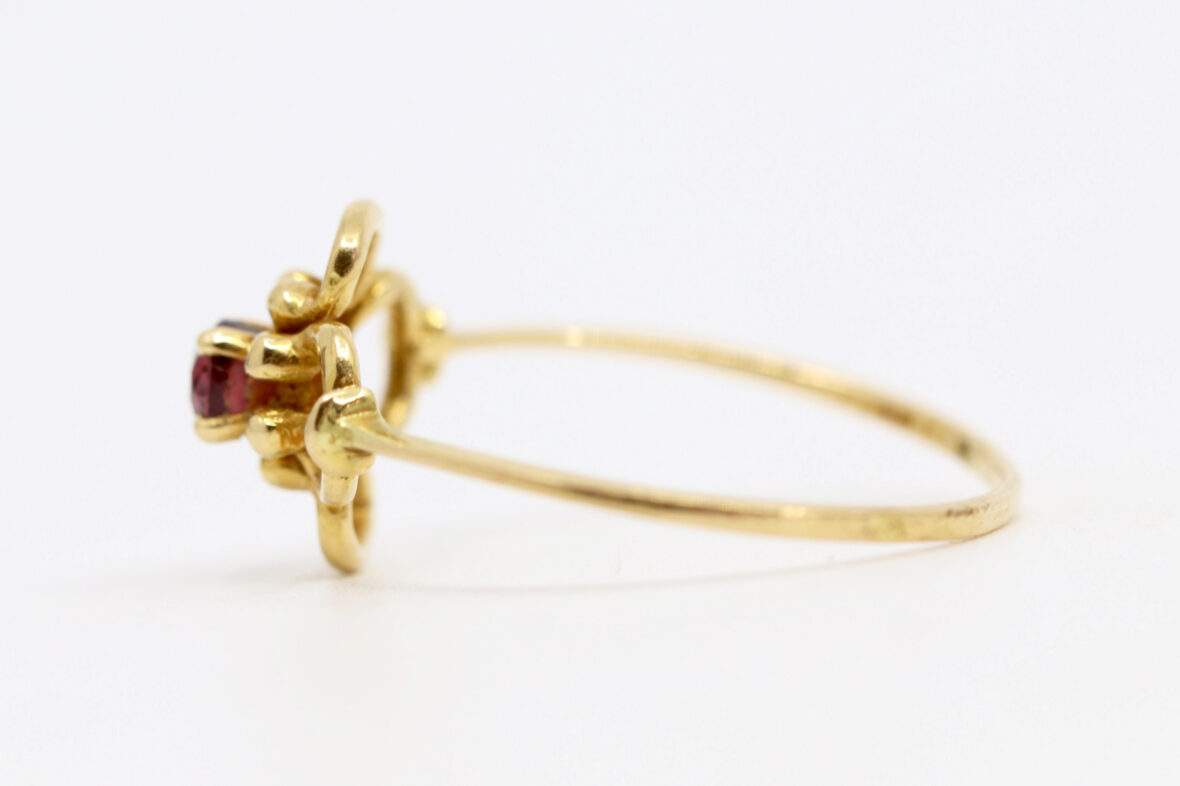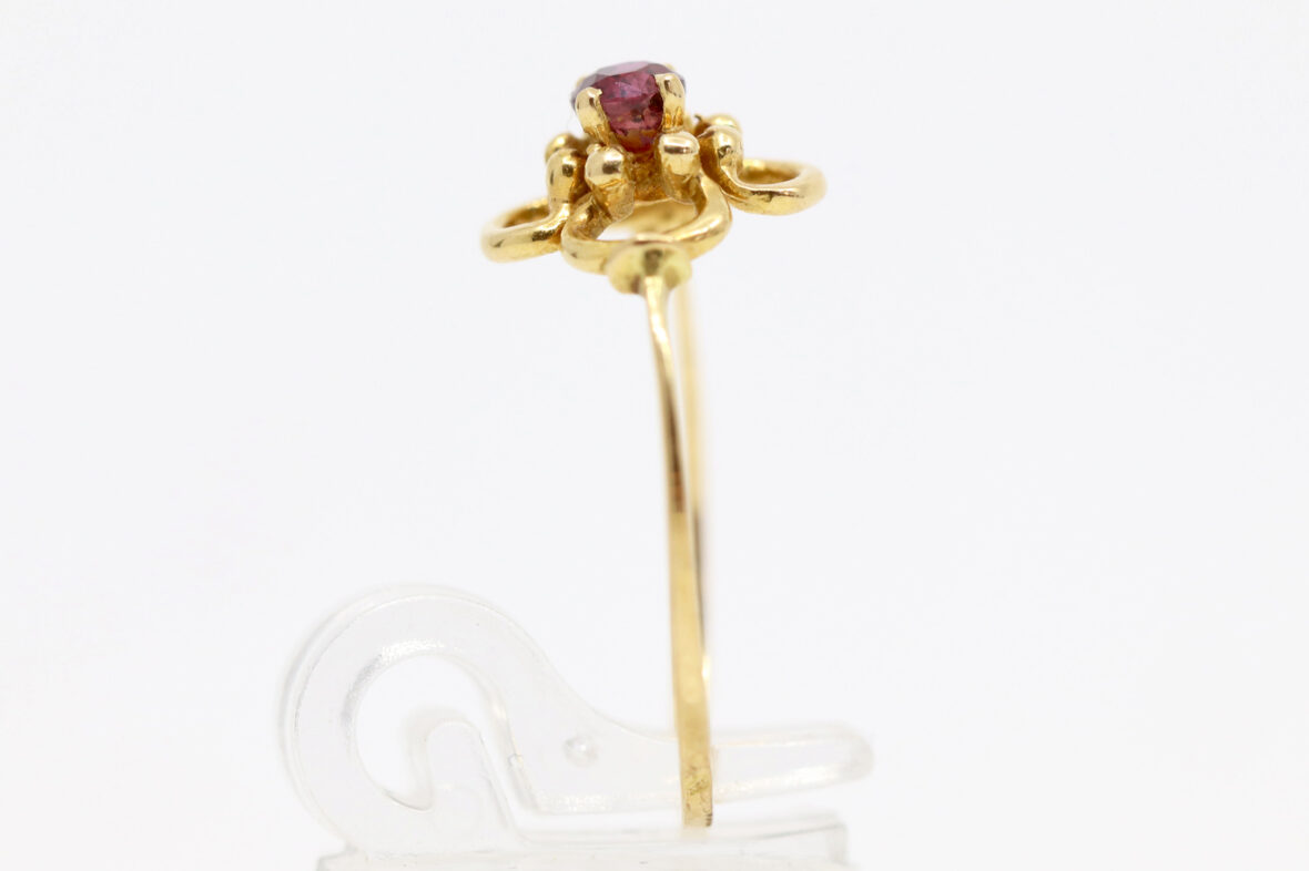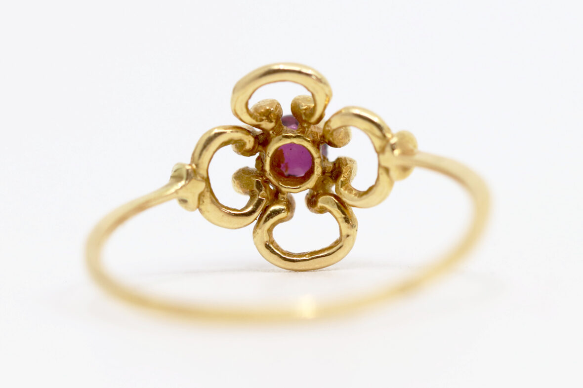 Bague en or jaune à décor ajouré de fleurette centrée d’une petite pierre rouge.