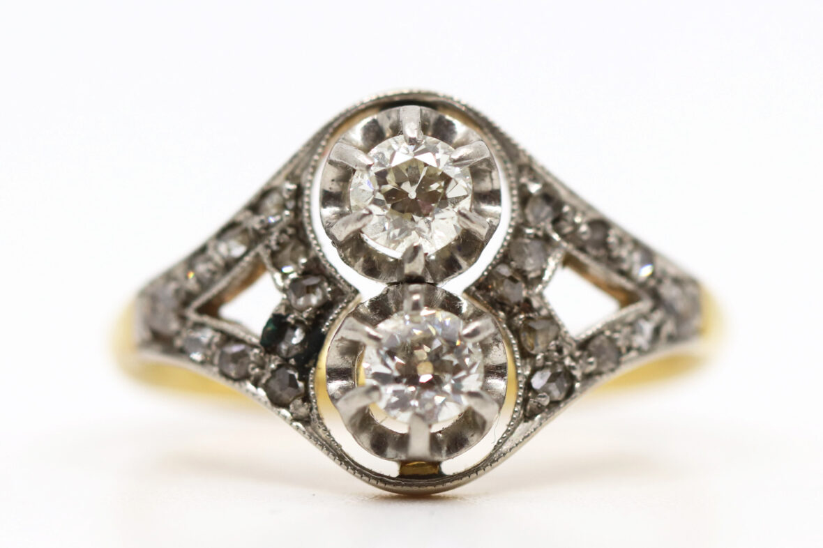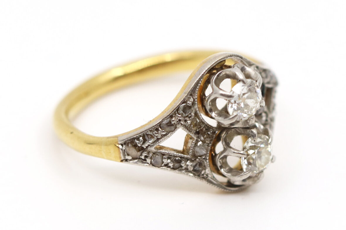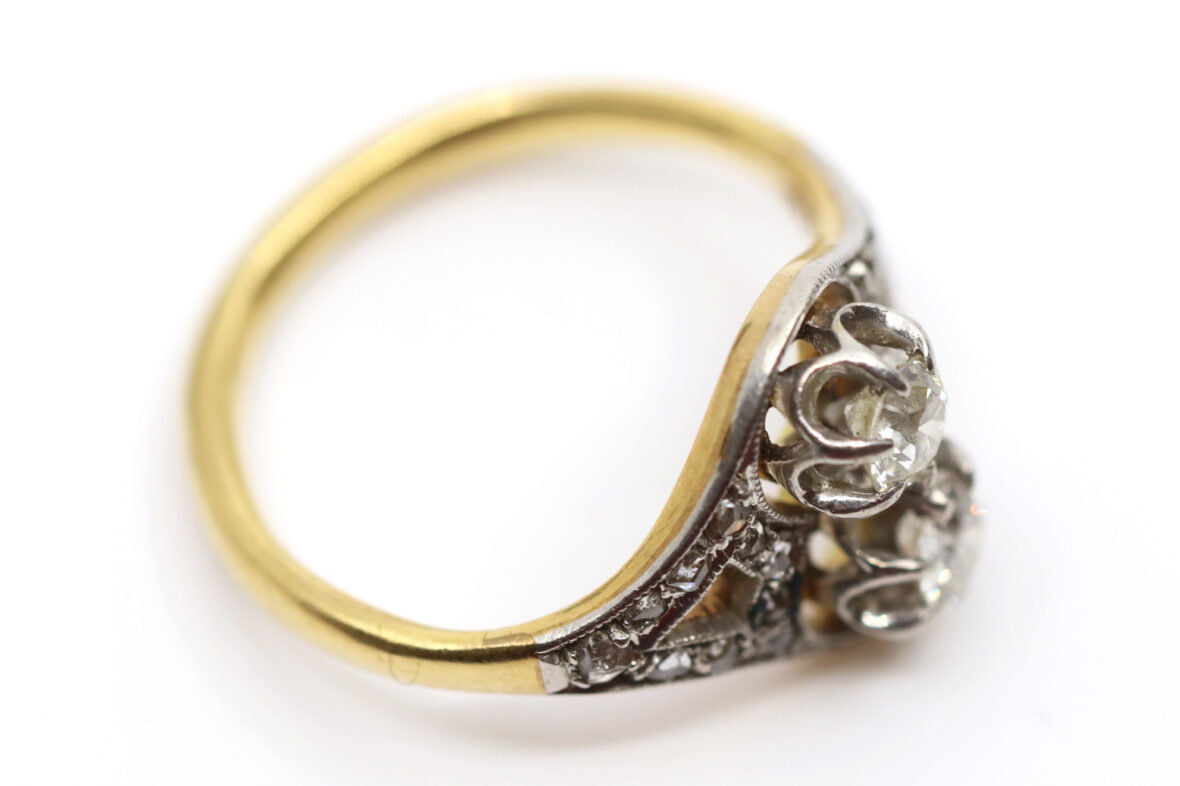 Bague en or jaune et or gris ornée de deux diamants de taille ancienne d’environ 0,20 carats chaque et de petites roses.