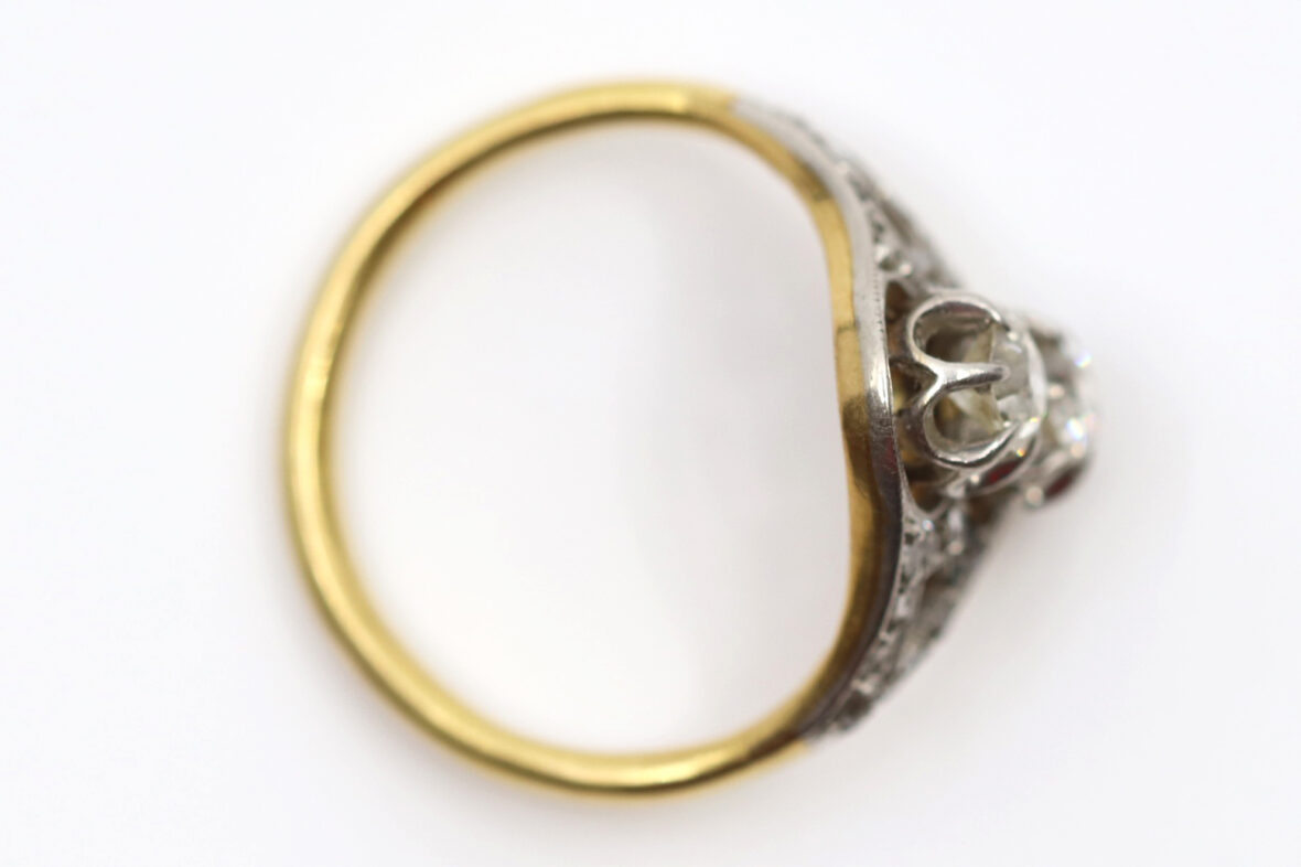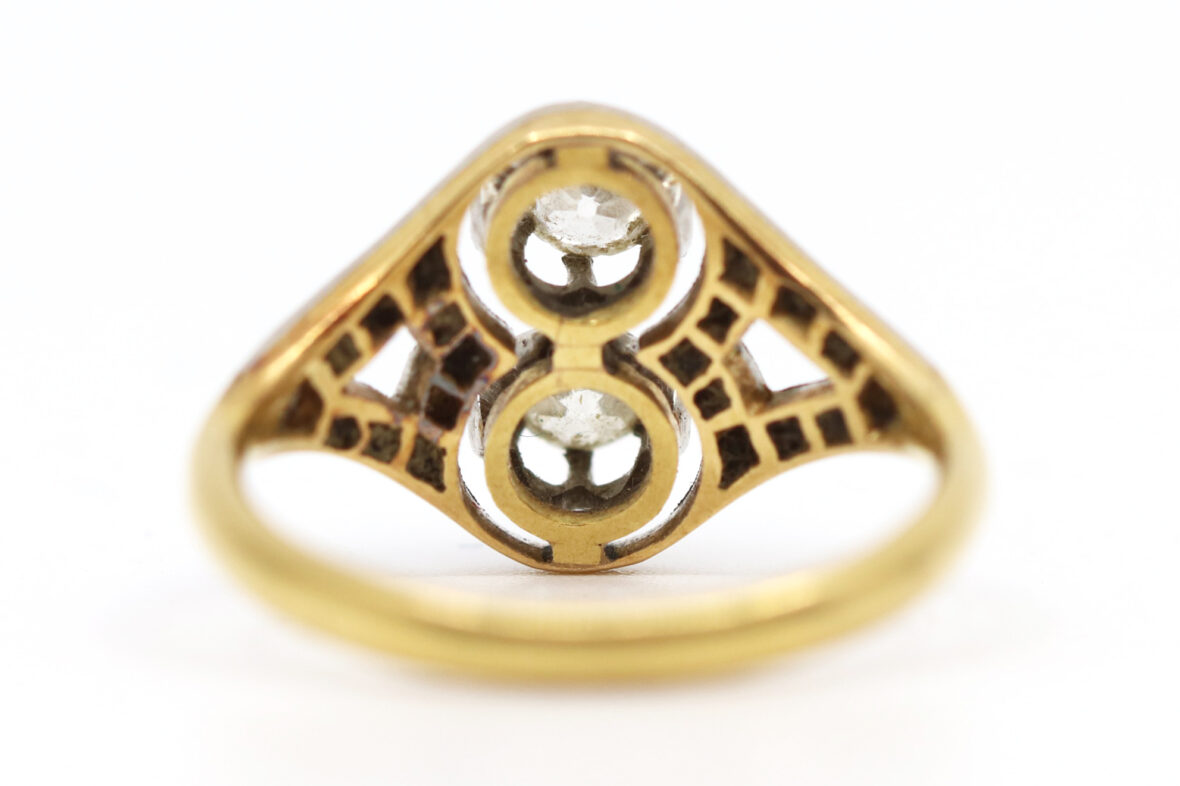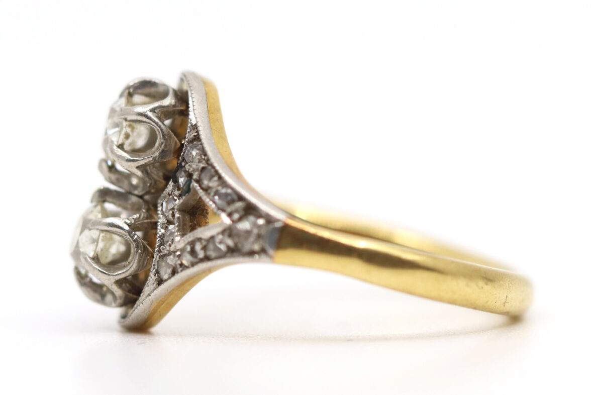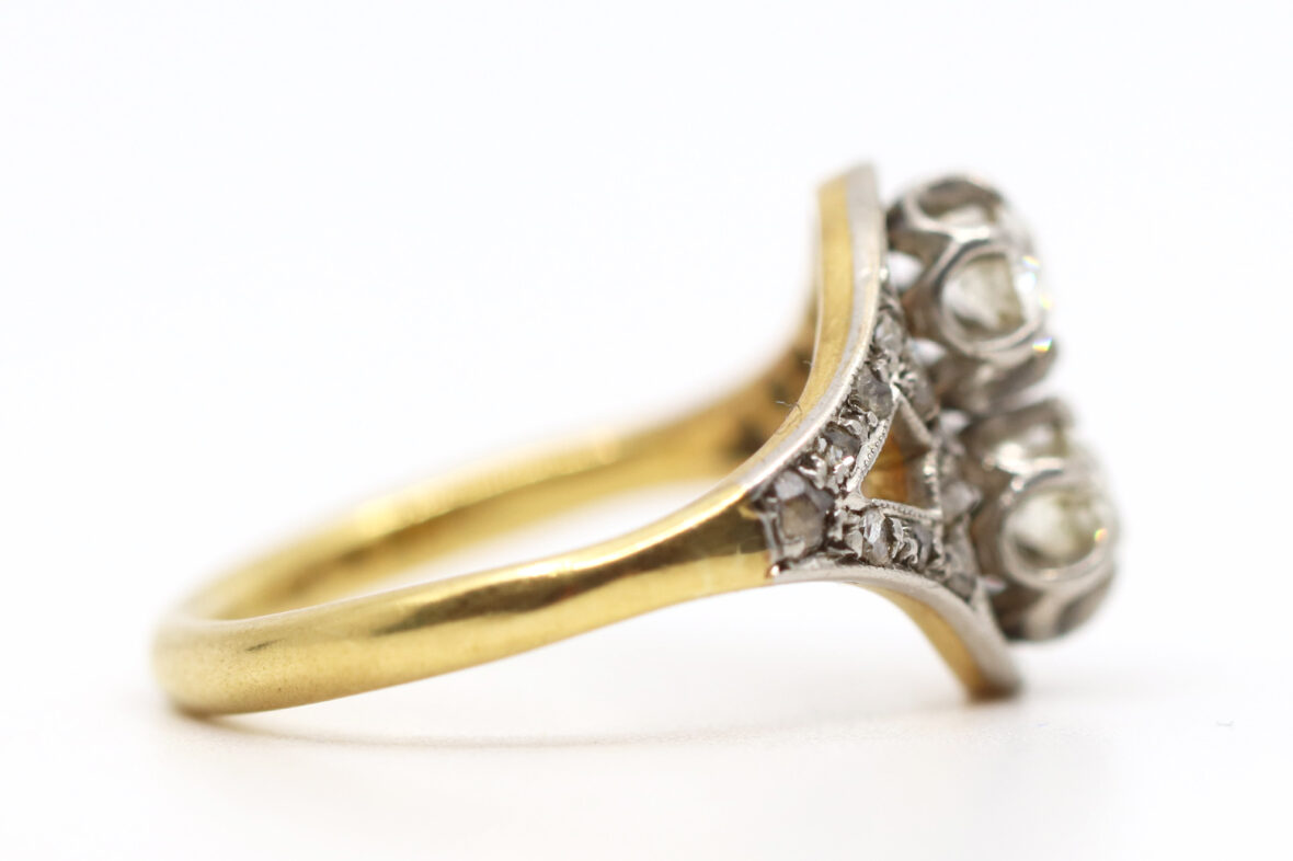 Bague en or jaune et or gris ornée de deux diamants de taille ancienne d’environ 0,20 carats chaque et de petites roses.