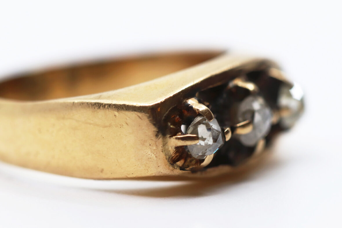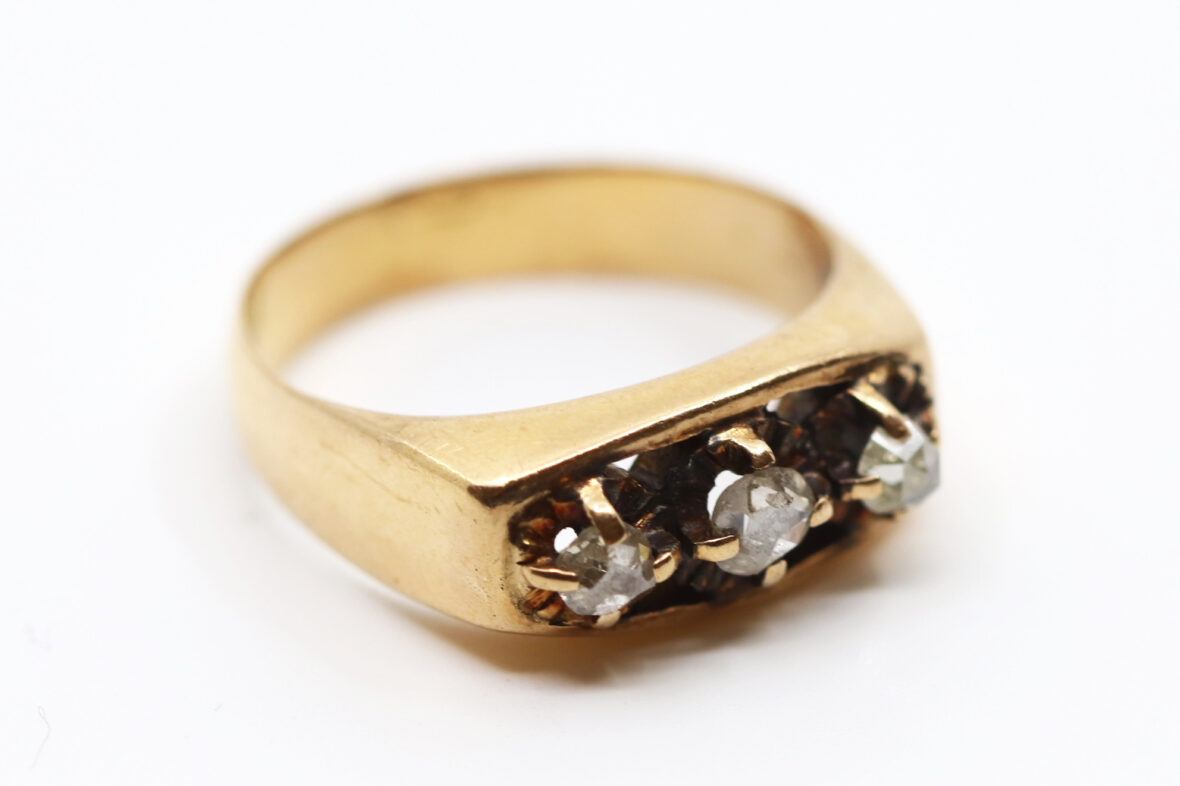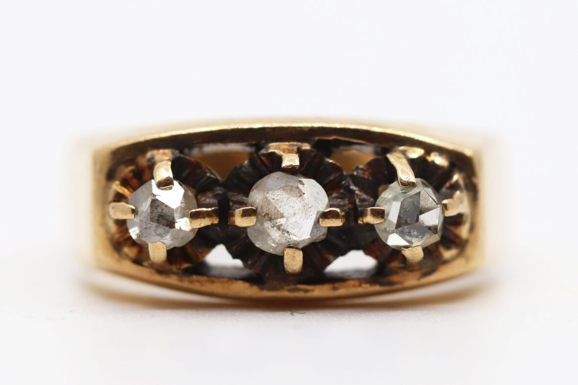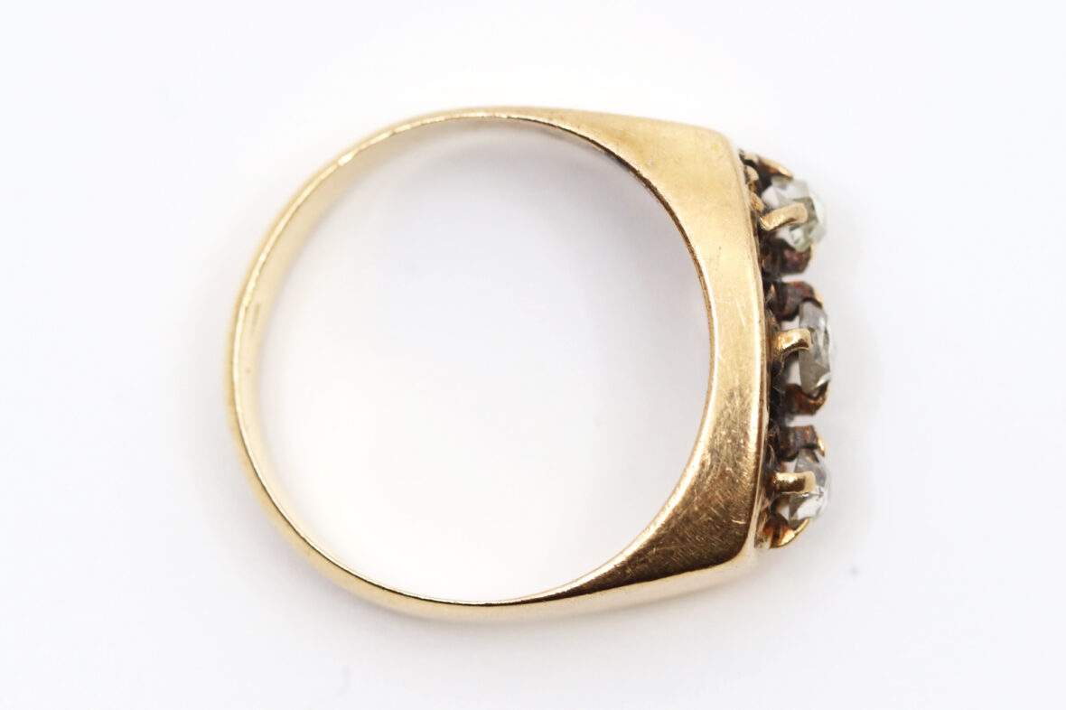 Bague en or jaune ornée de trois diamants taillés en rose. Poids : 6,2 g