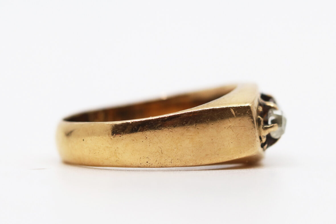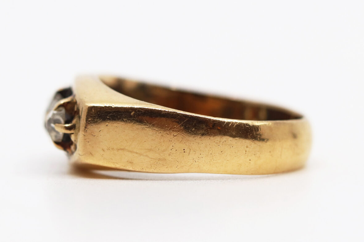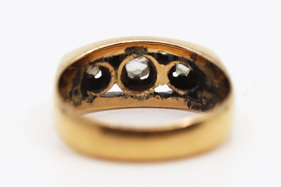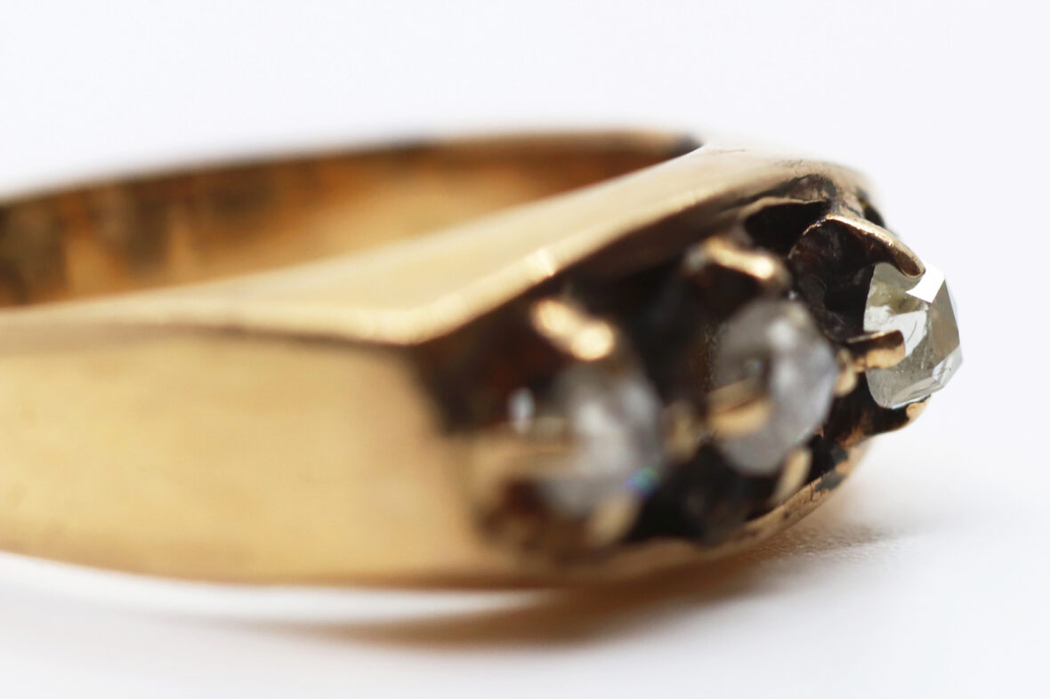 Bague en or jaune ornée de trois diamants taillés en rose. Poids : 6,2 g