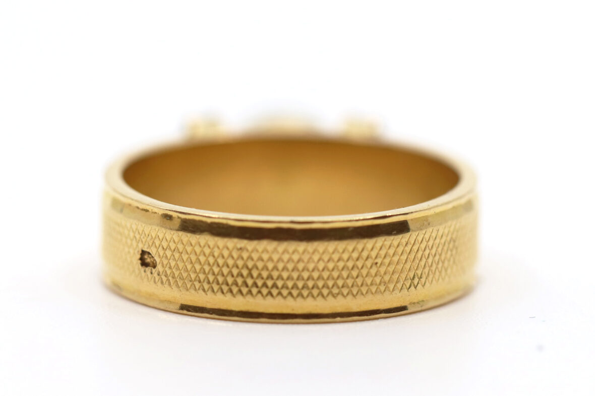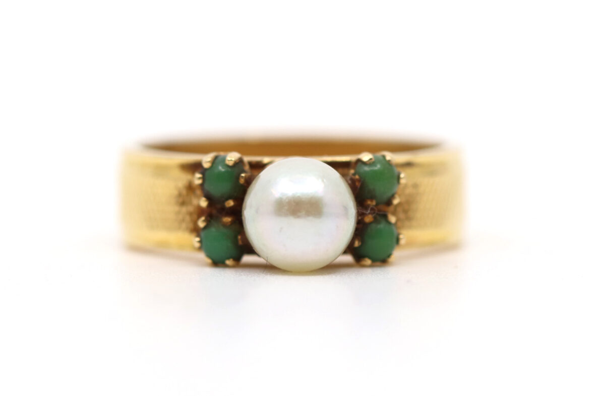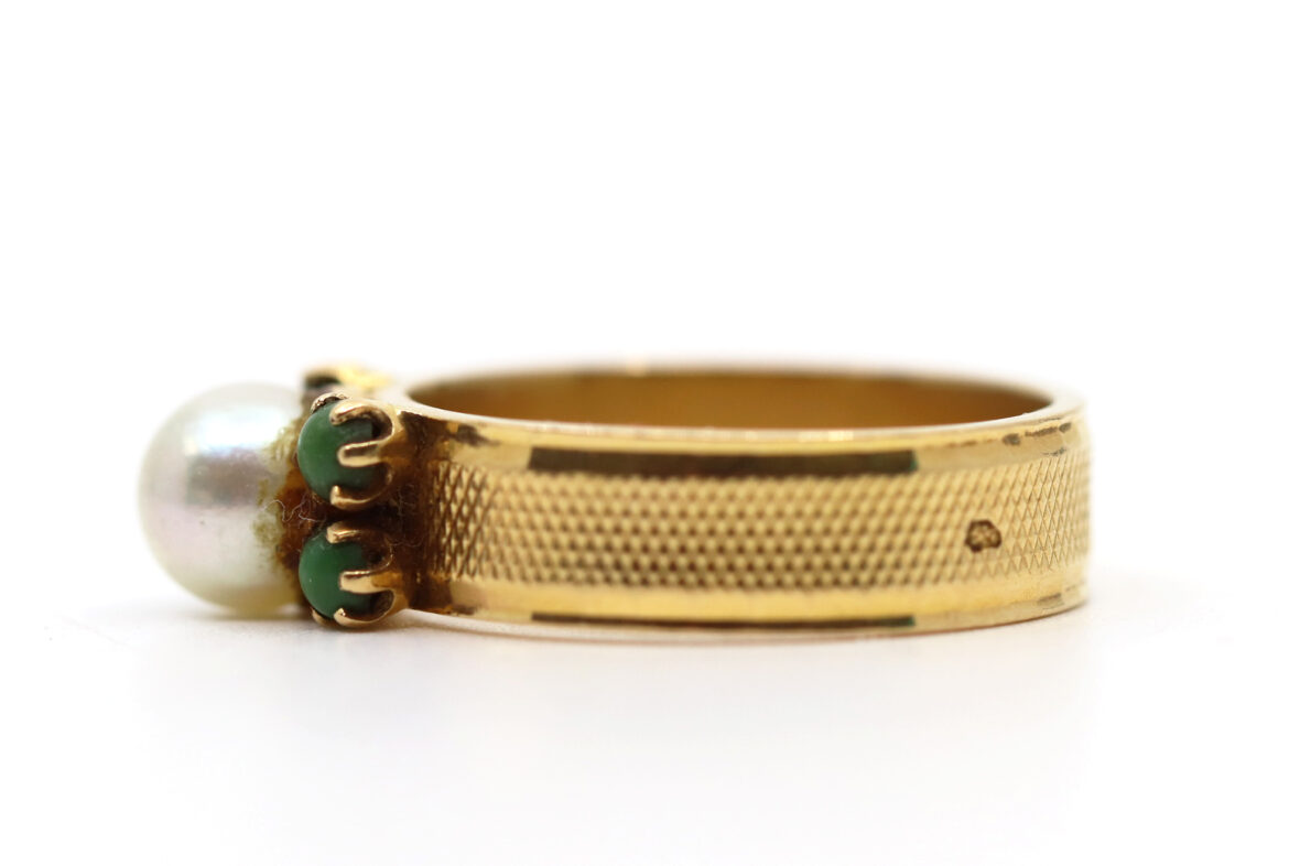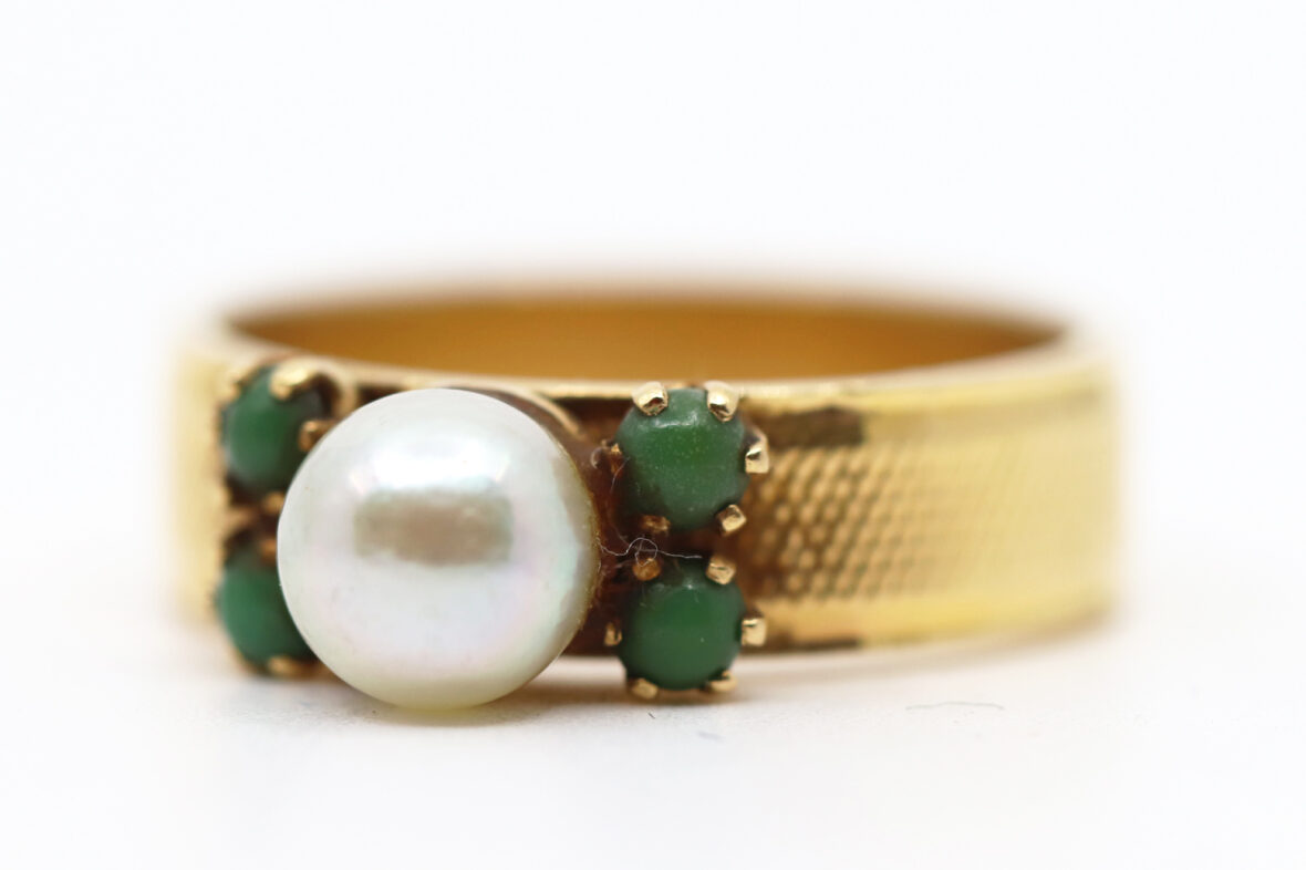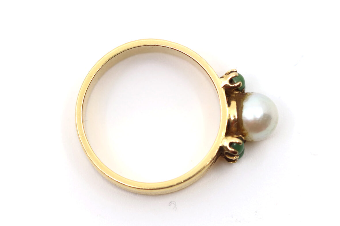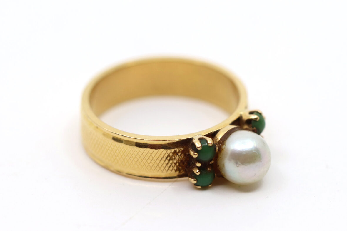 Bague en or jaune ornée d’une perle de culture et des petits cabochons d’émeraude.