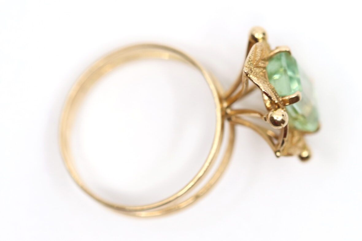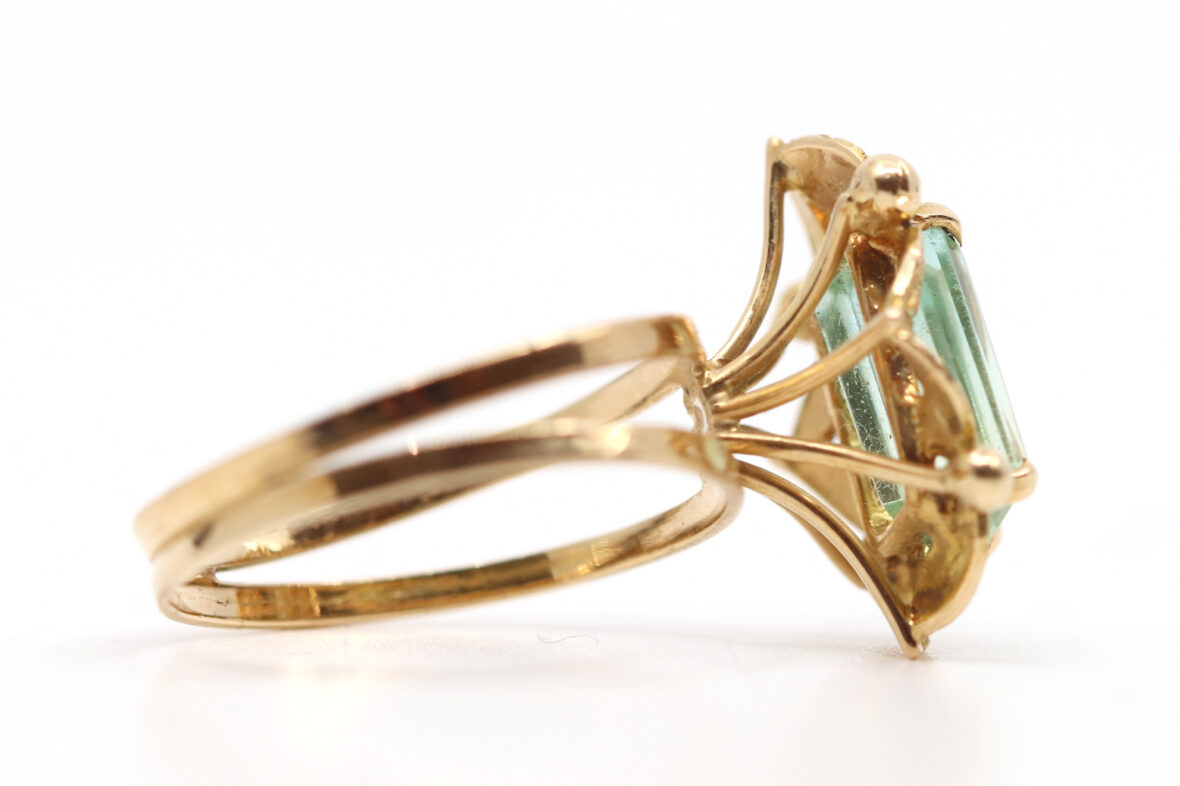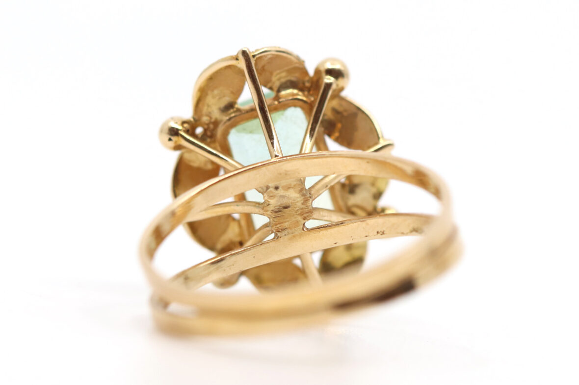 Bague fleur en or jaune ornée d’une pierre de couleur turquoise. Poids : 4,4 g