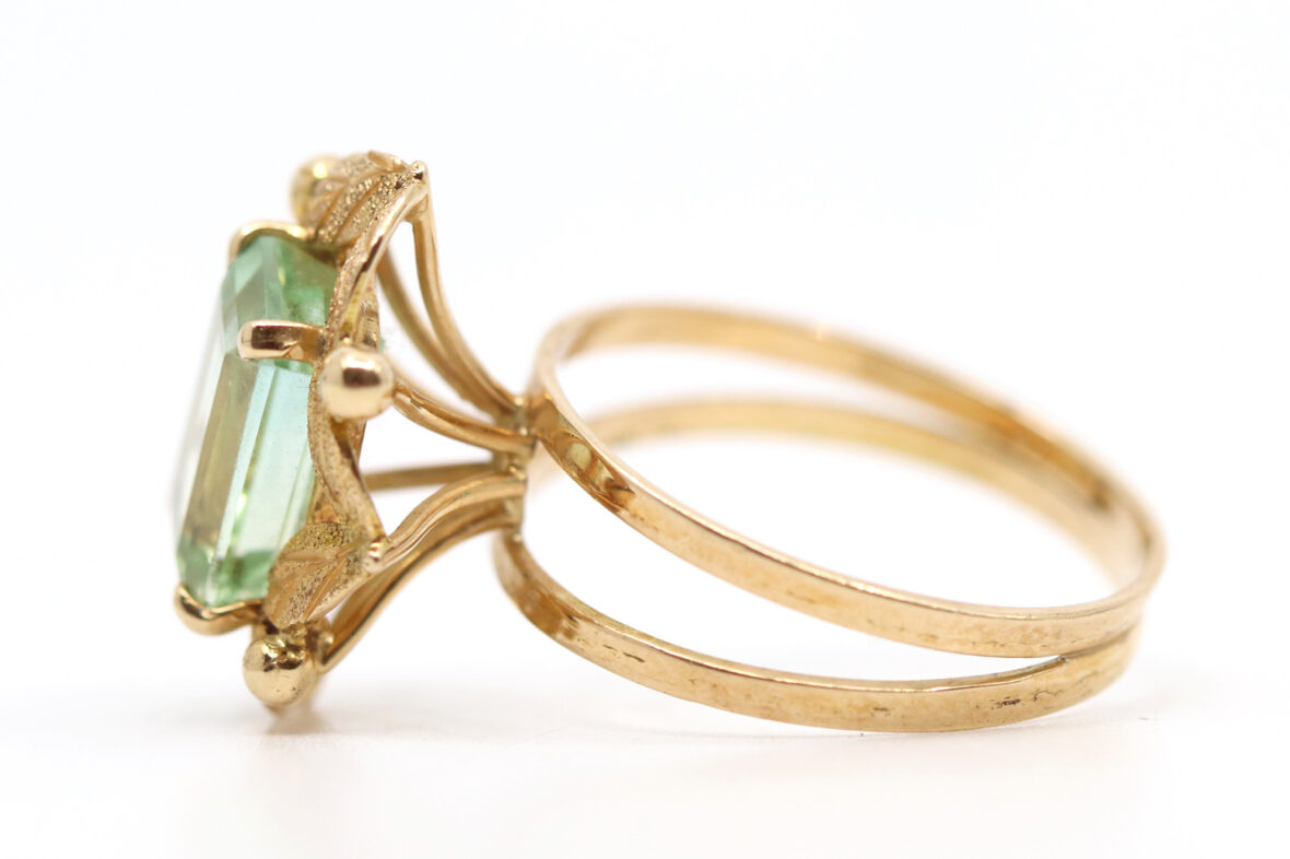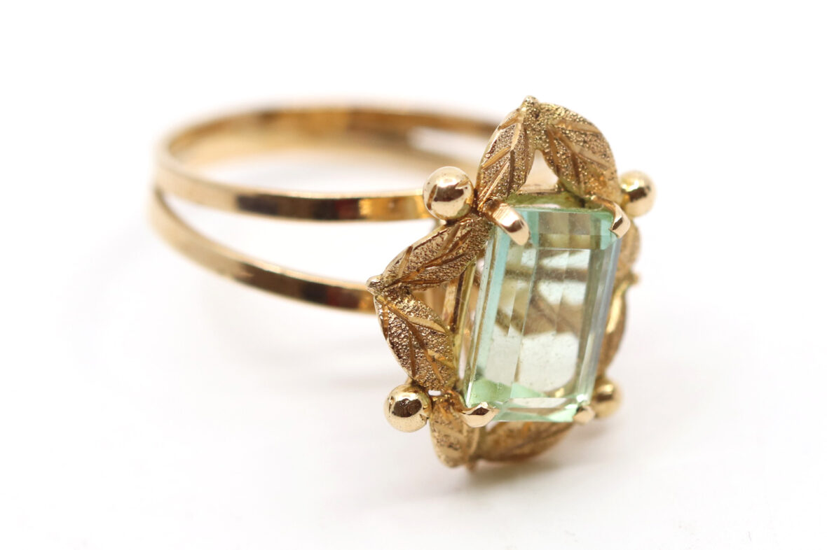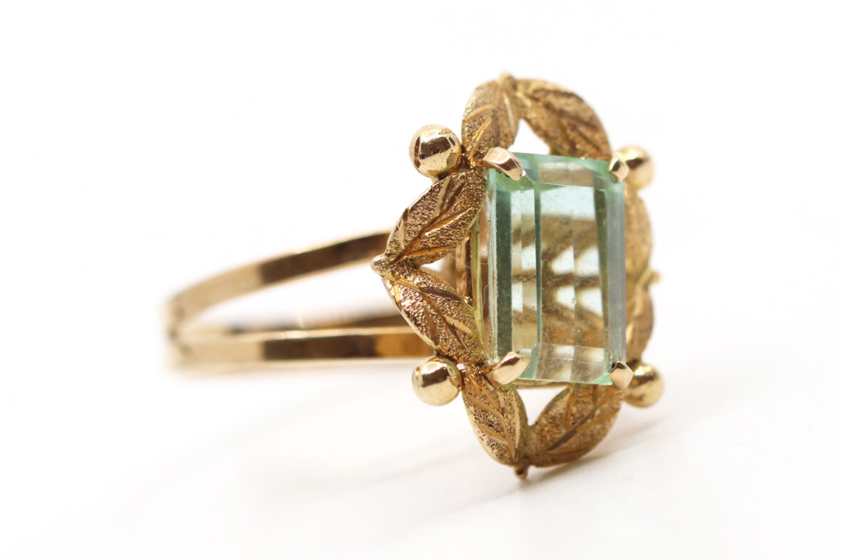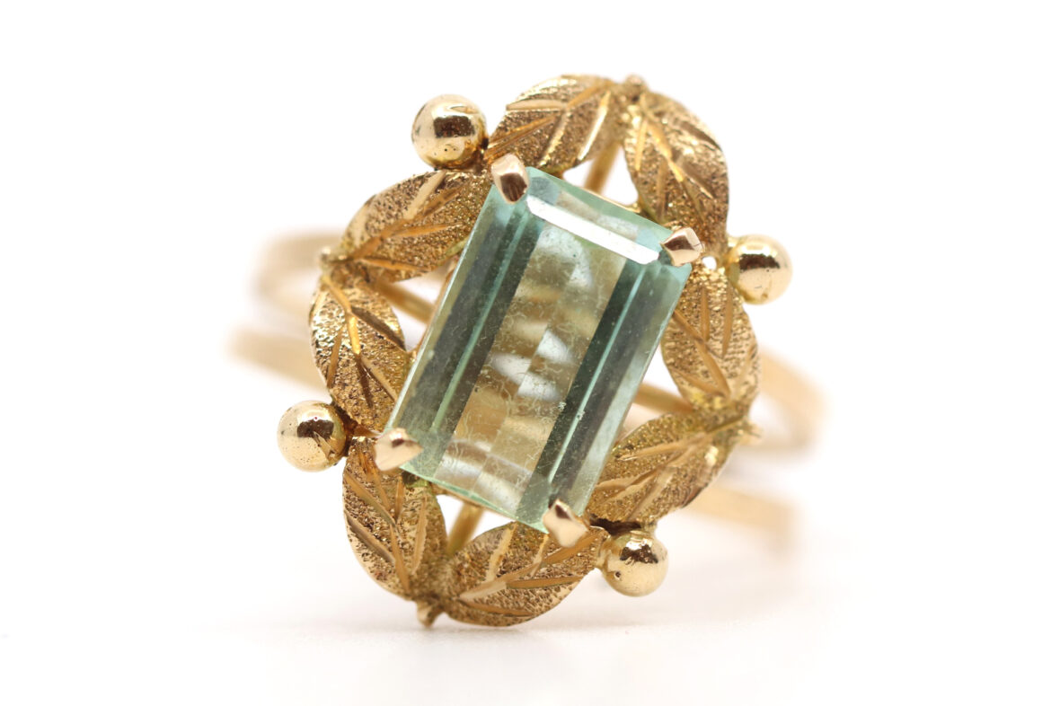 Bague fleur en or jaune ornée d’une pierre de couleur turquoise. Poids : 4,4 g