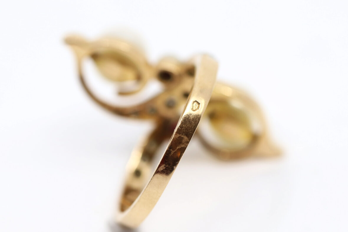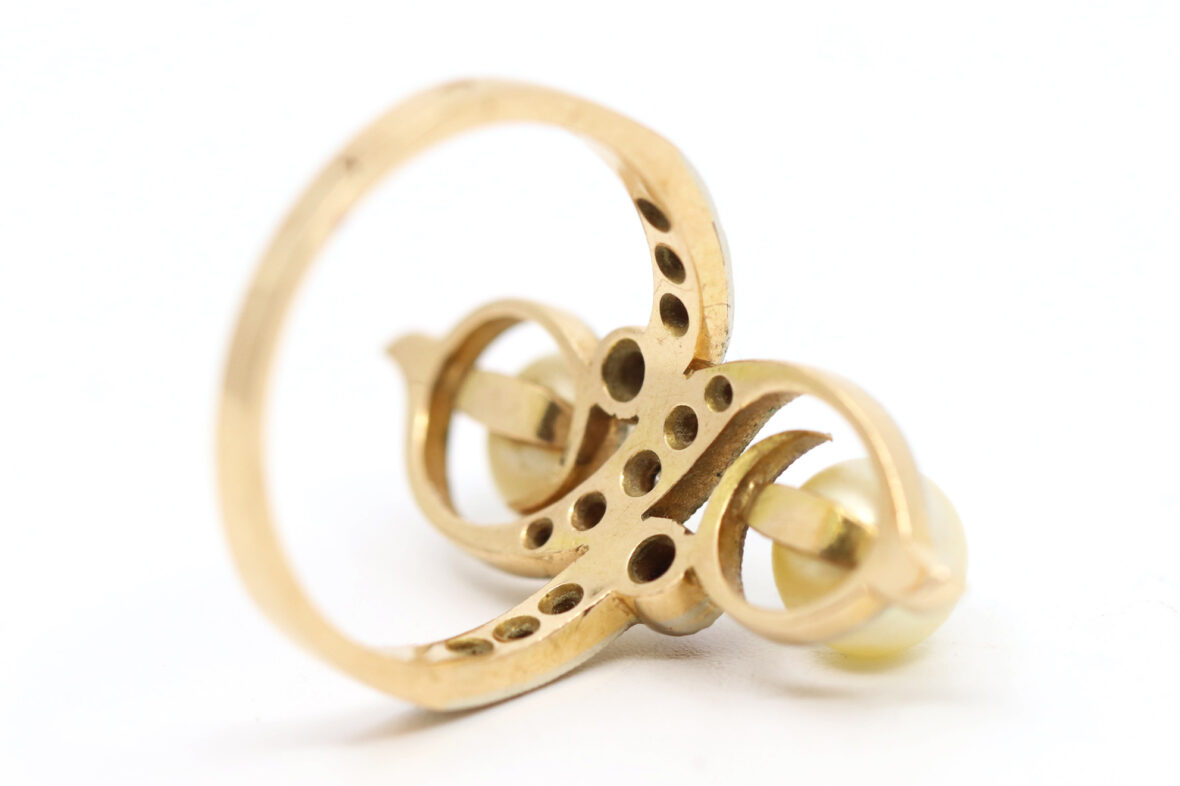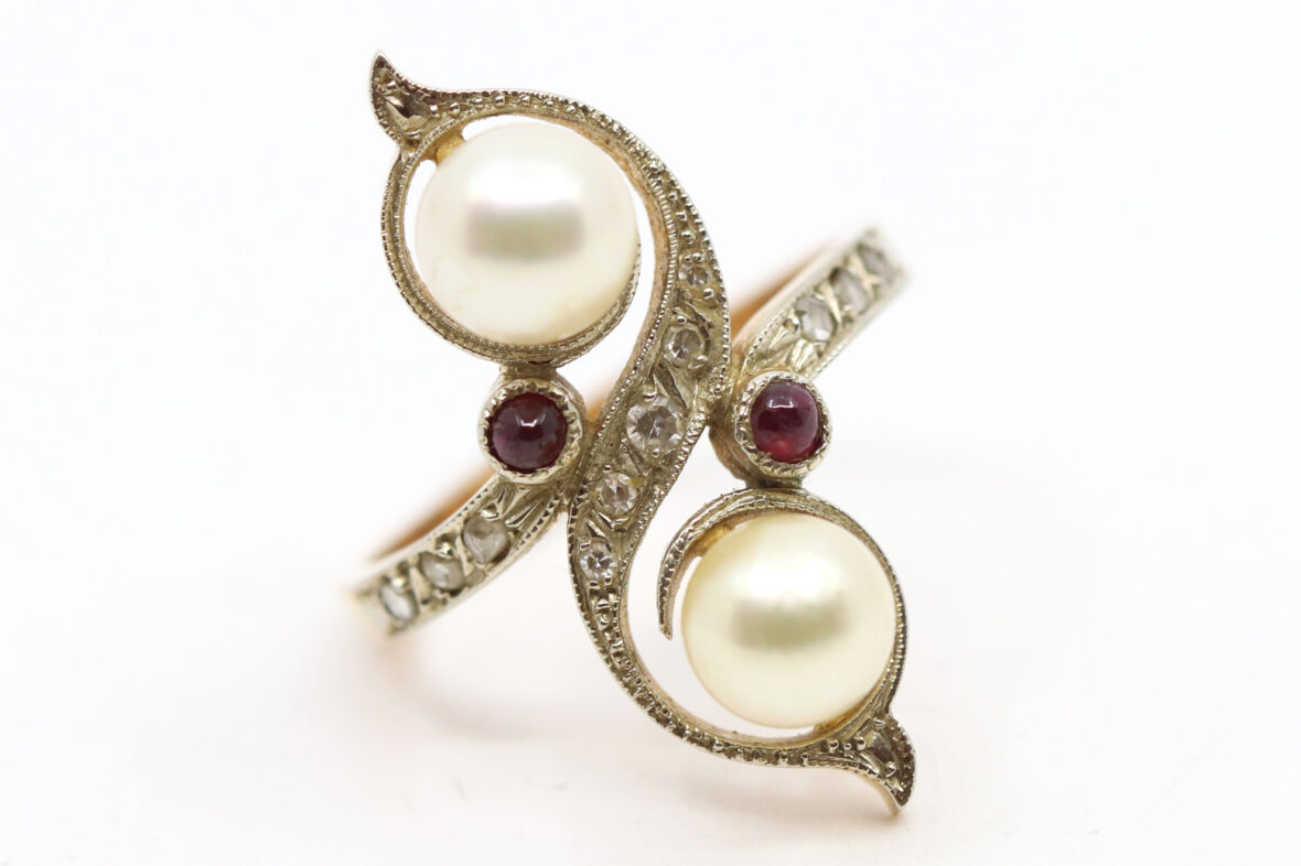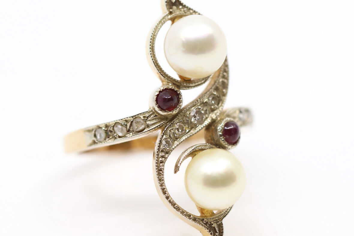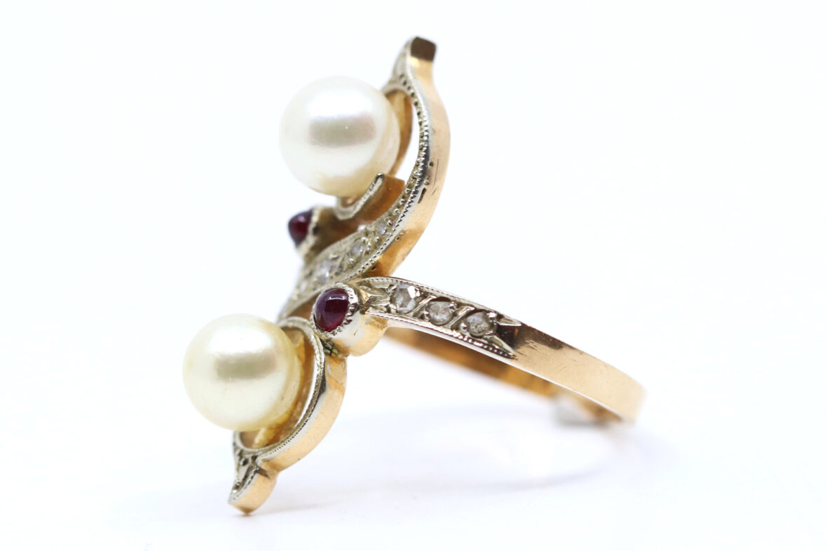 Bague toi et moi en or jaune ornée de deux perles de culture, deux petits rubis en cabochon et d’un pavage de petites roses.