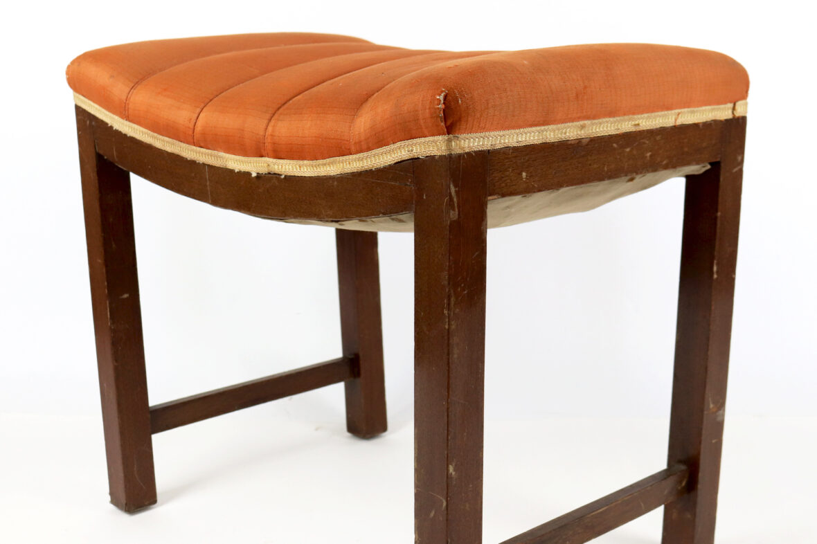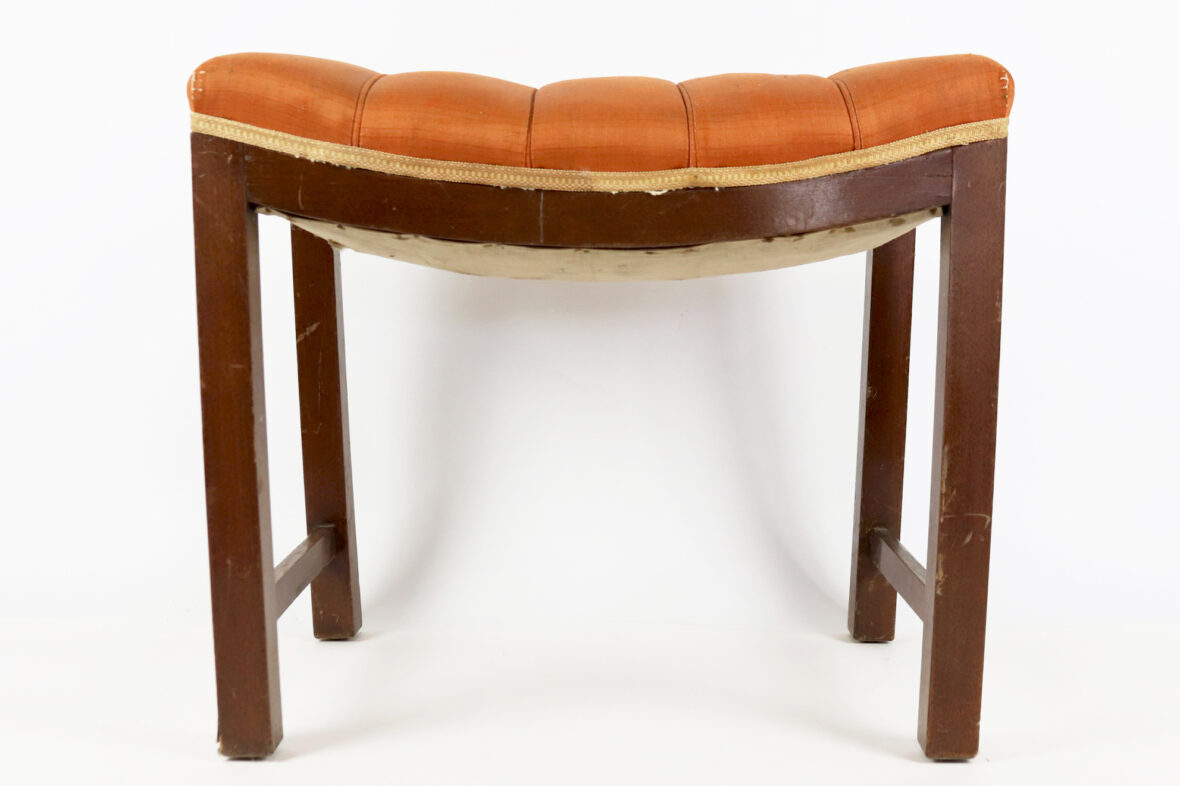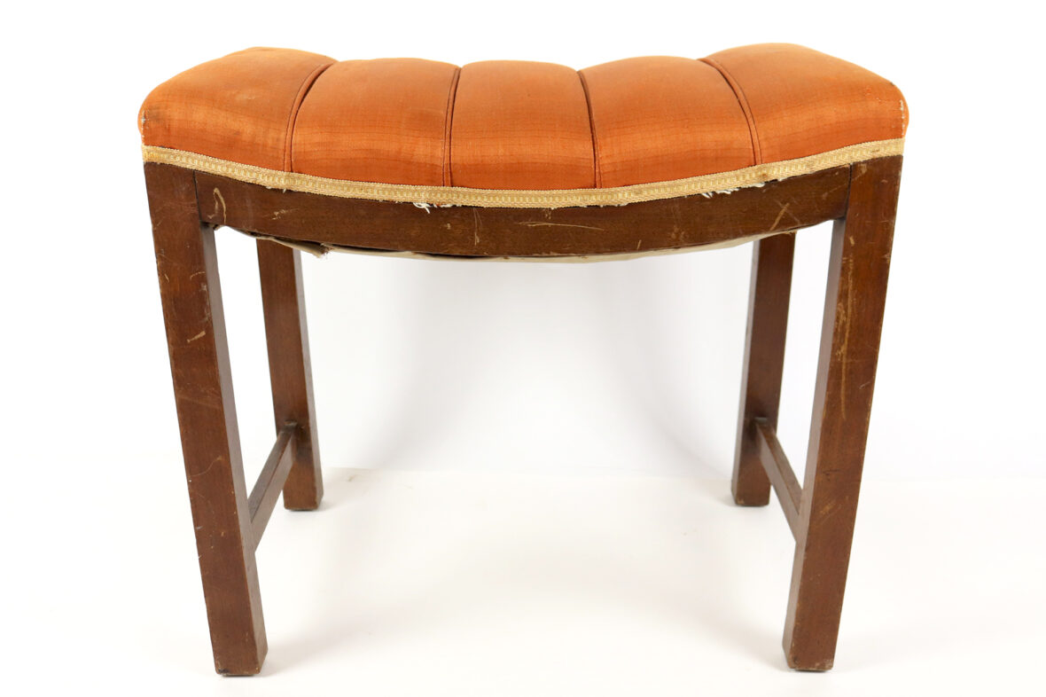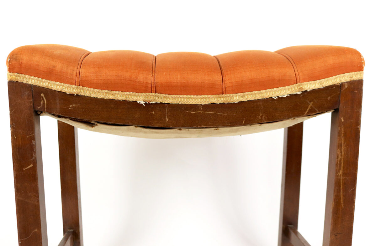 Banc de piano en bois naturel, l’assise garnie de tissu orangé.