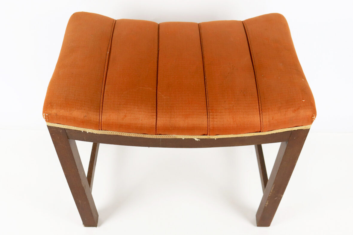 Banc de piano en bois naturel, l’assise garnie de tissu orangé.