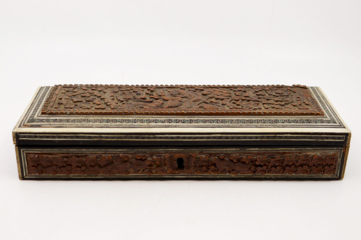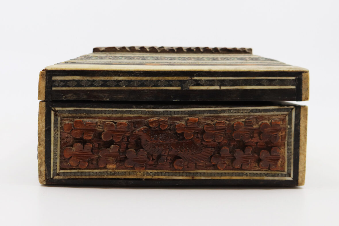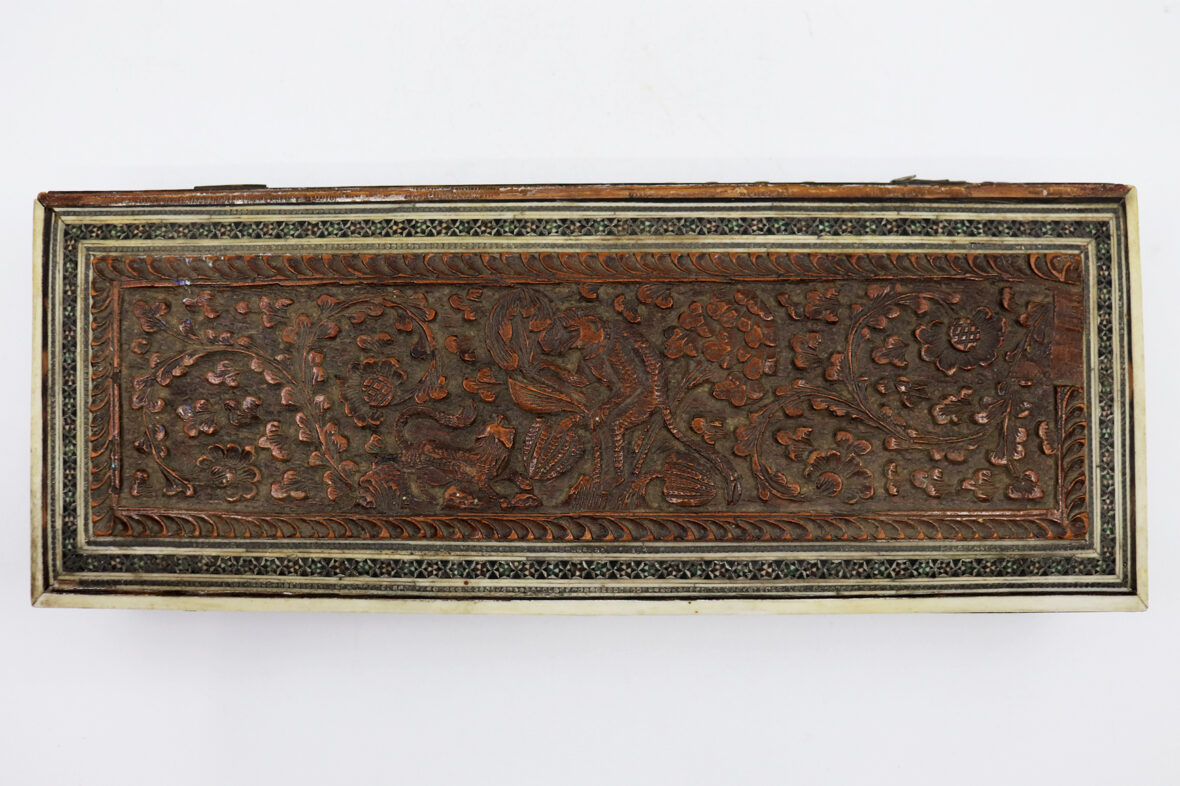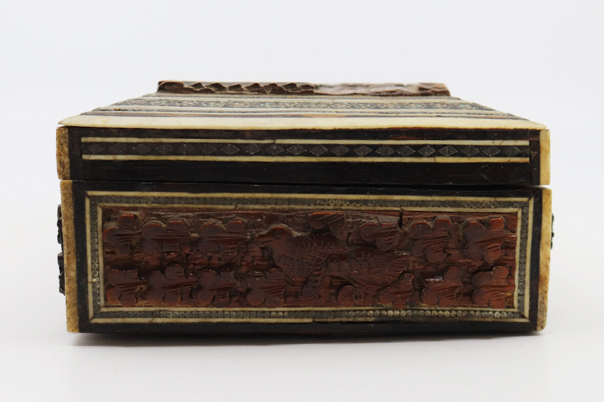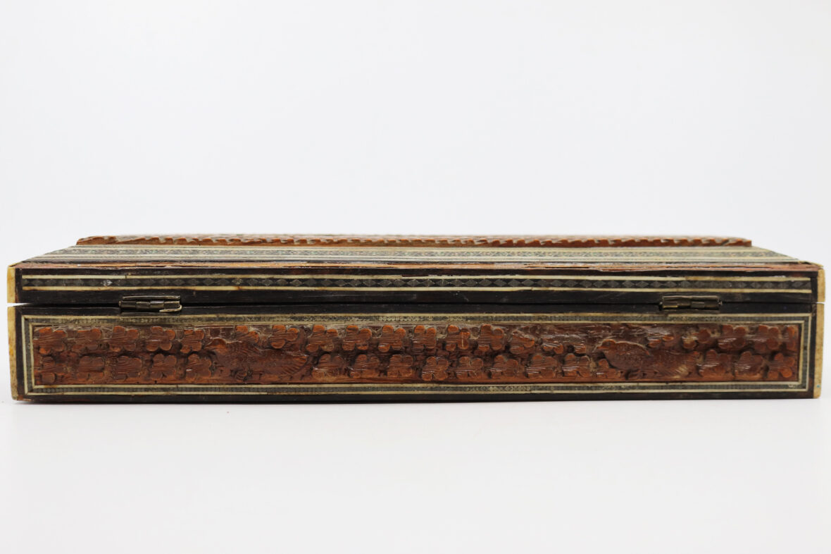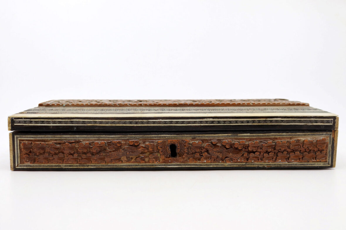 Boîte rectangulaire en bois sculpté d’un décor floral peuplé d’animaux dont un singe sur le couvercle, chaque décor ceinturé d’une frise de micro-mosaïque dite sadeli en os et bois teintés. L’intérieur tapissé de feutre rouge, le couvercle fixé par des charnières possiblement plus tardives, une serrure ménagée en façade.