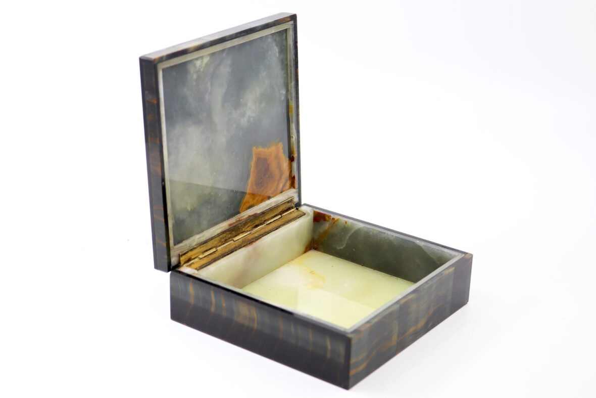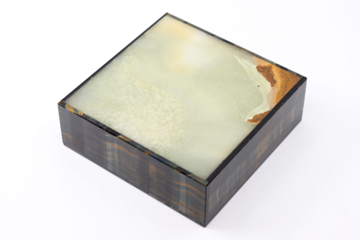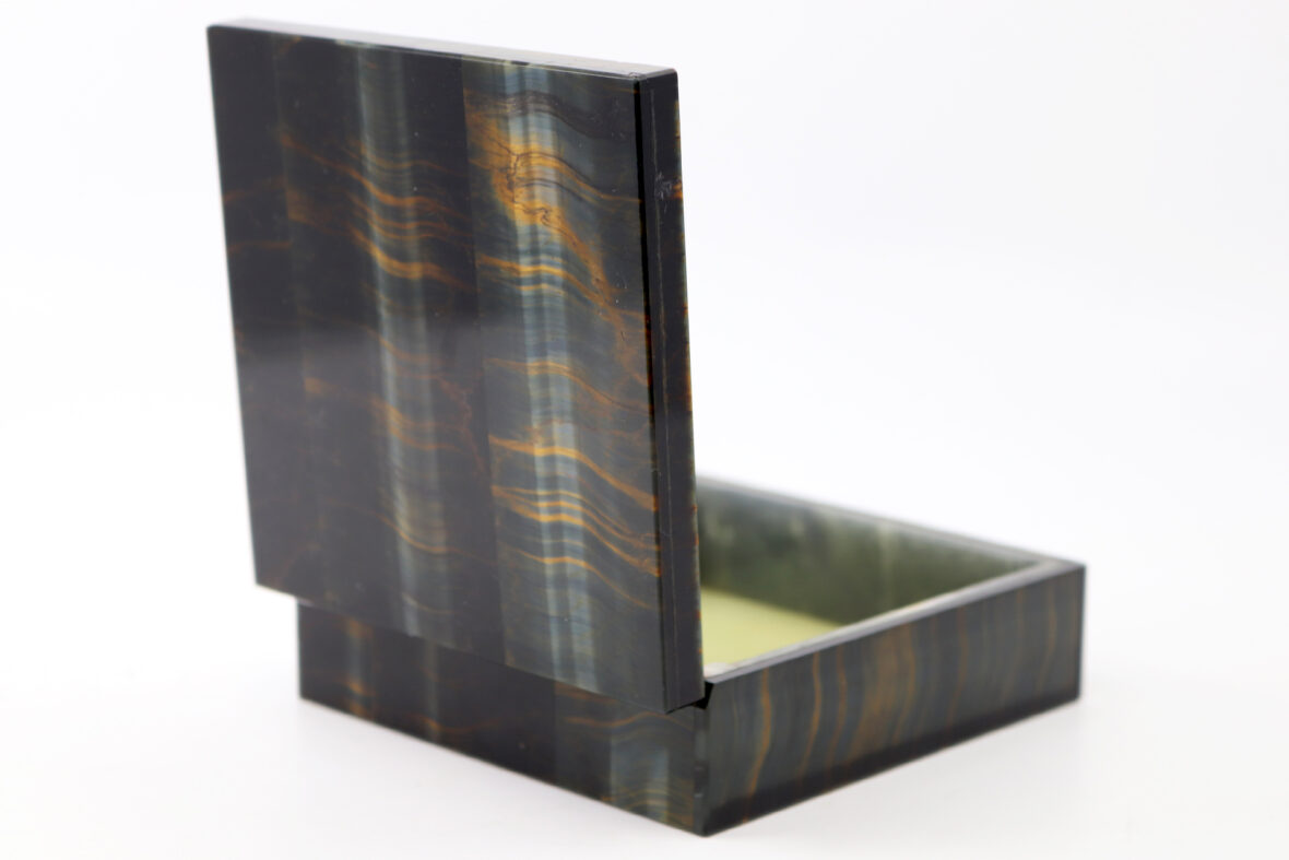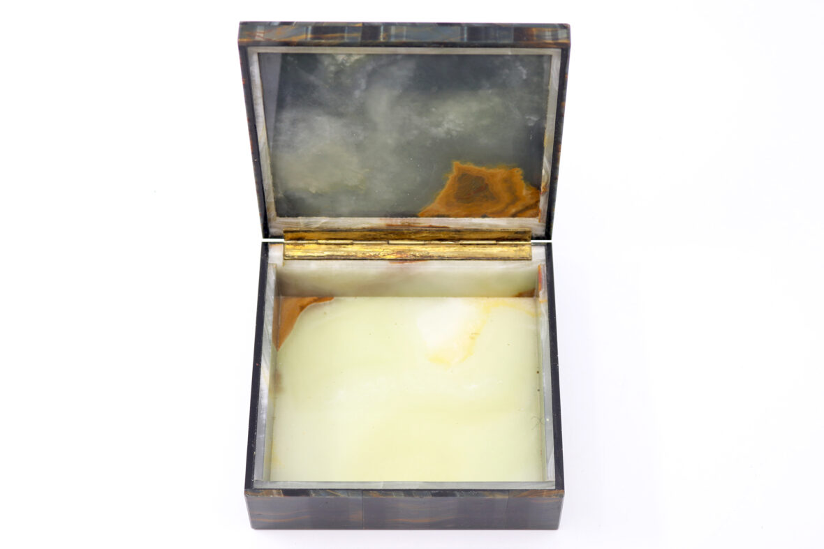 Boîte de bureau en placage extérieur d’agate œil de tigre.