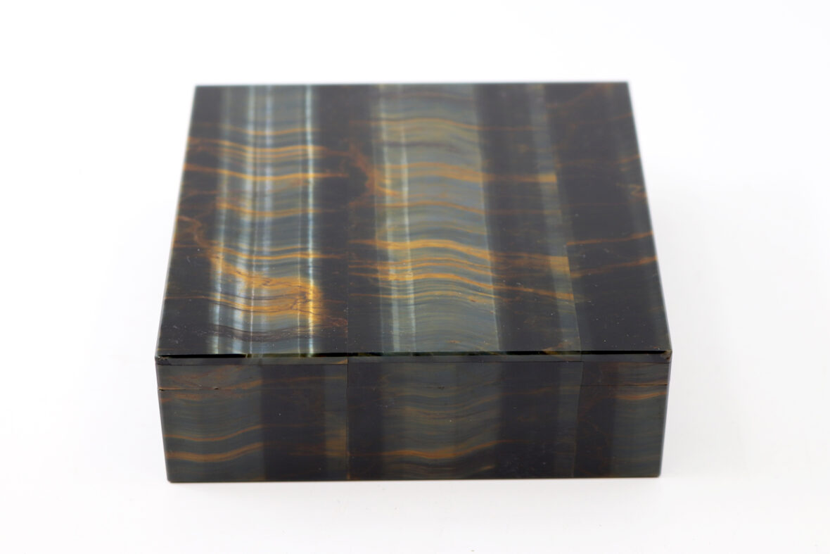 Boîte de bureau en placage extérieur d’agate œil de tigre. Haut. : 3,5 cm – Larg….