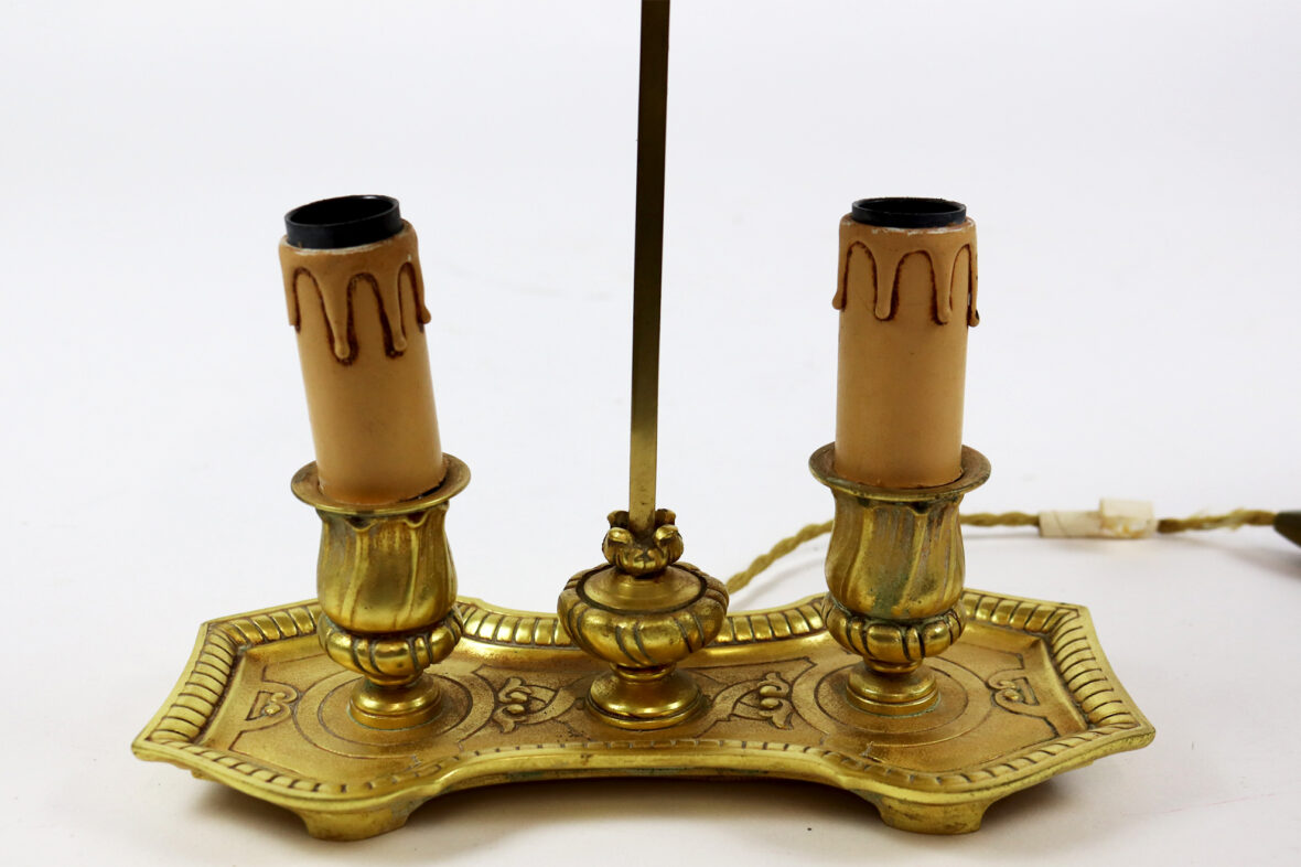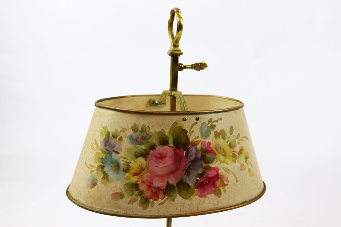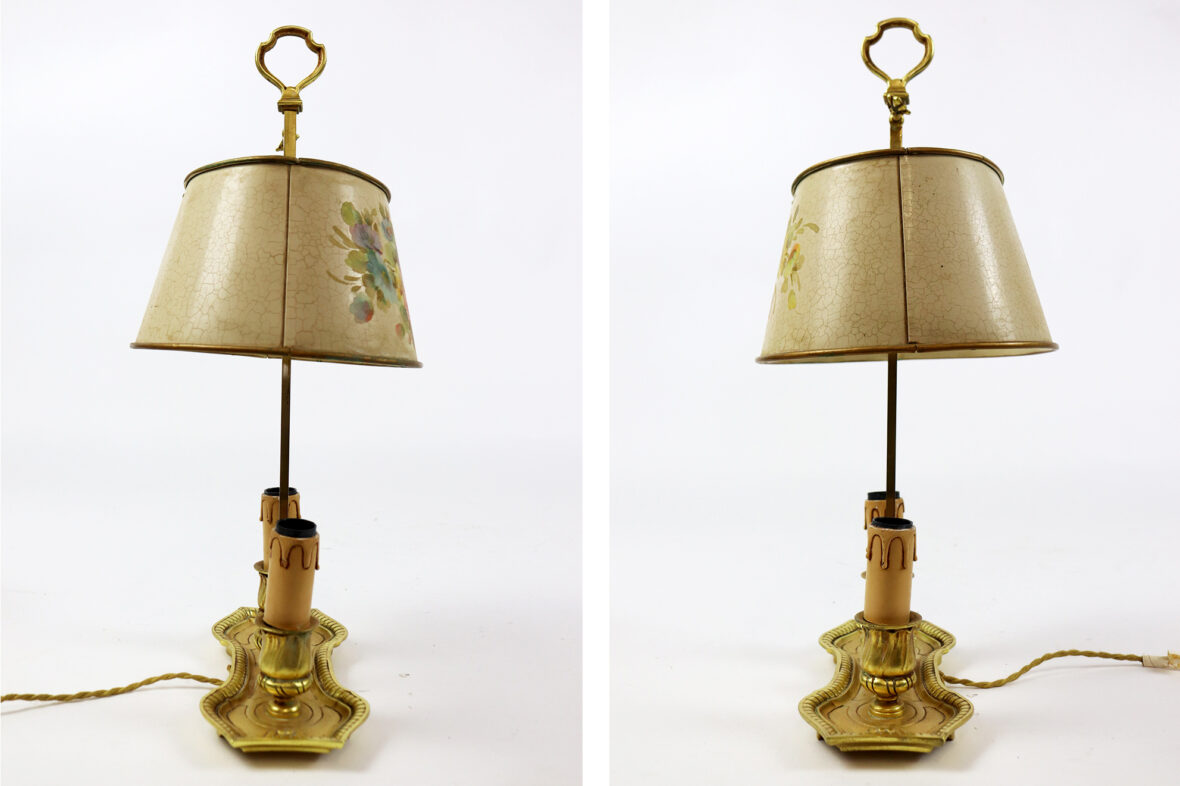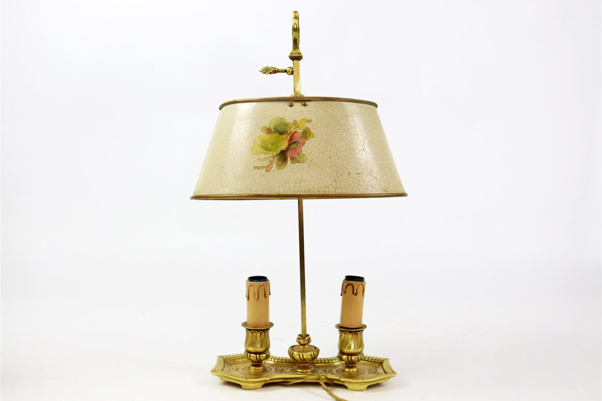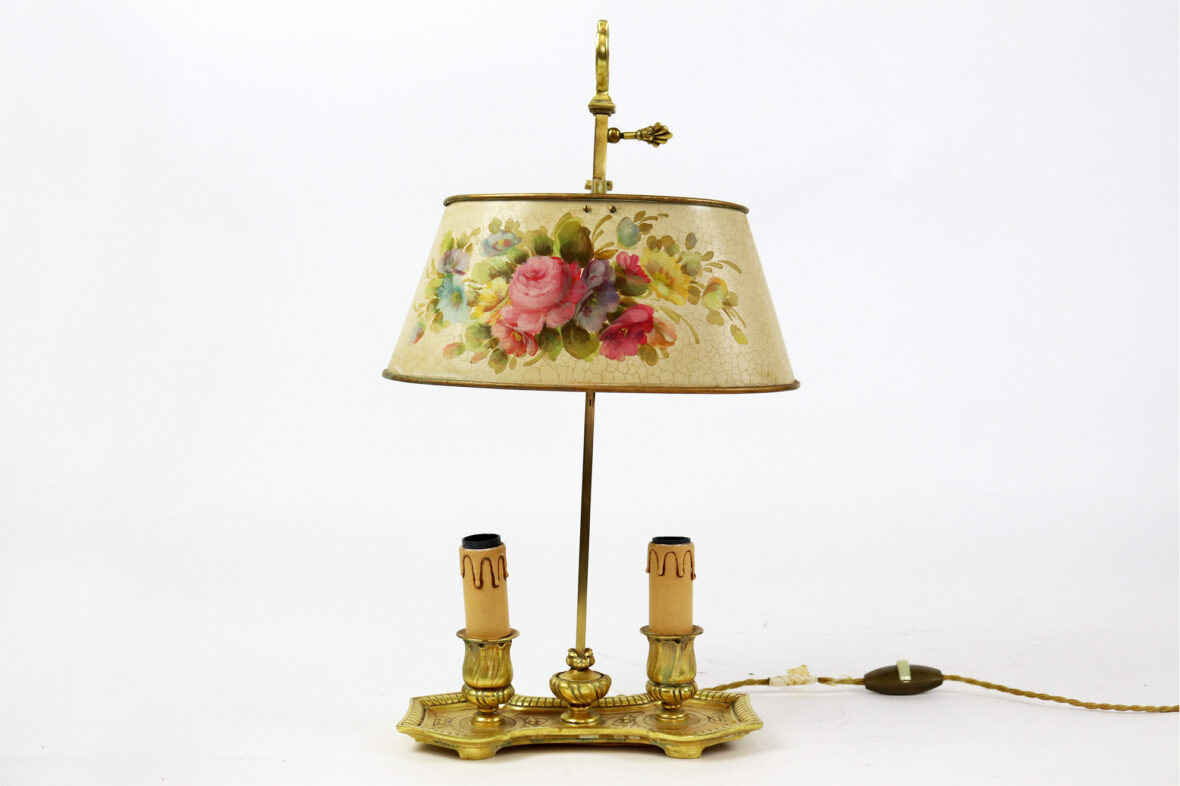 Bougeoir en bronze à deux lumières monté en lampe bouillote, abat-jour en tôle peinte à décor polychrome de roses. Monté à l’électricité.