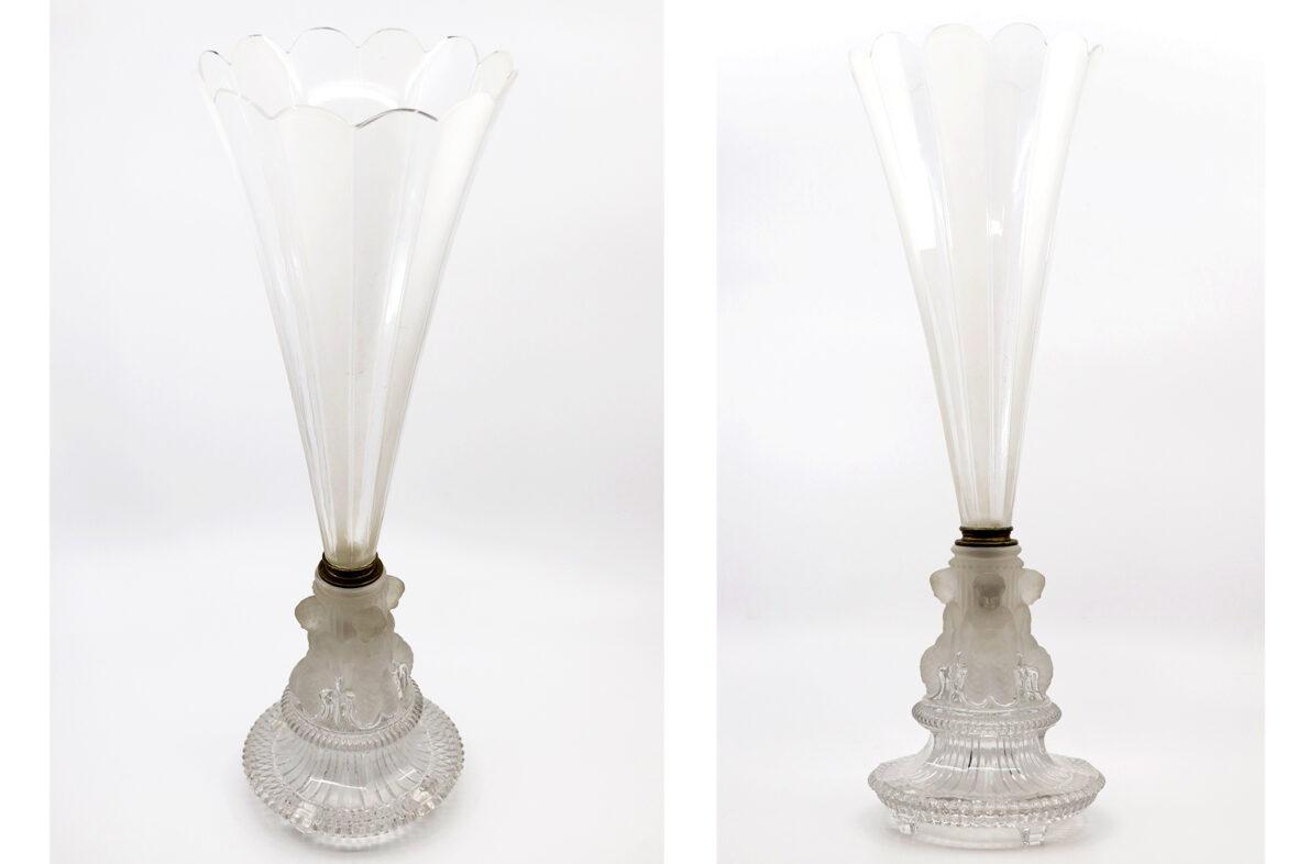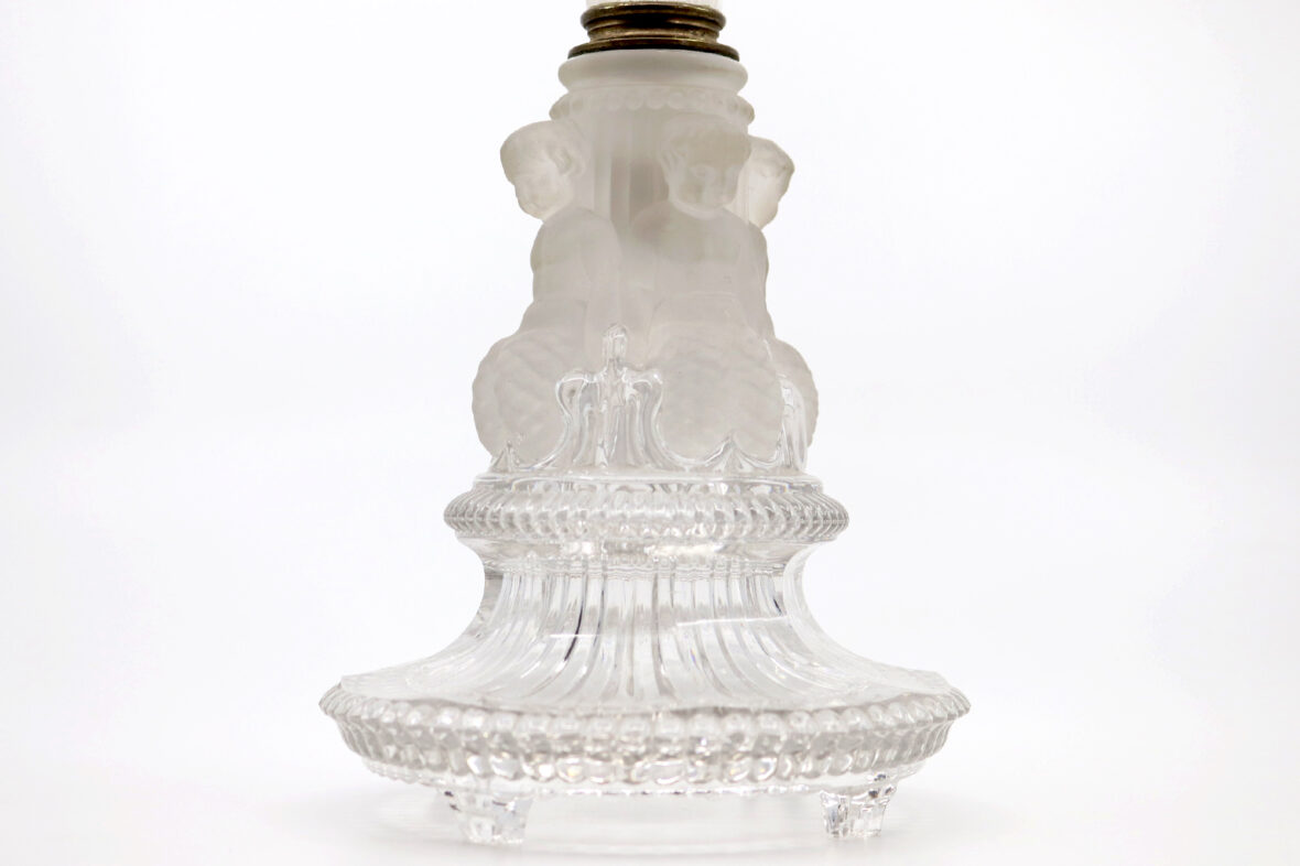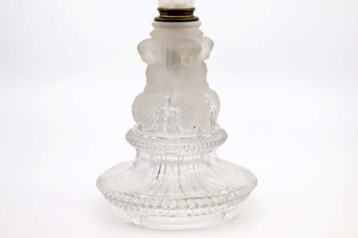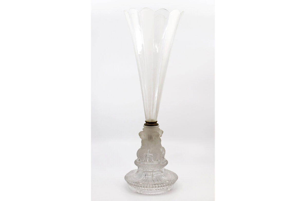 Bouquetière de table de forme cornet en verre transparent monté sur un pied en verre pressé moulé à décor de putti assis.