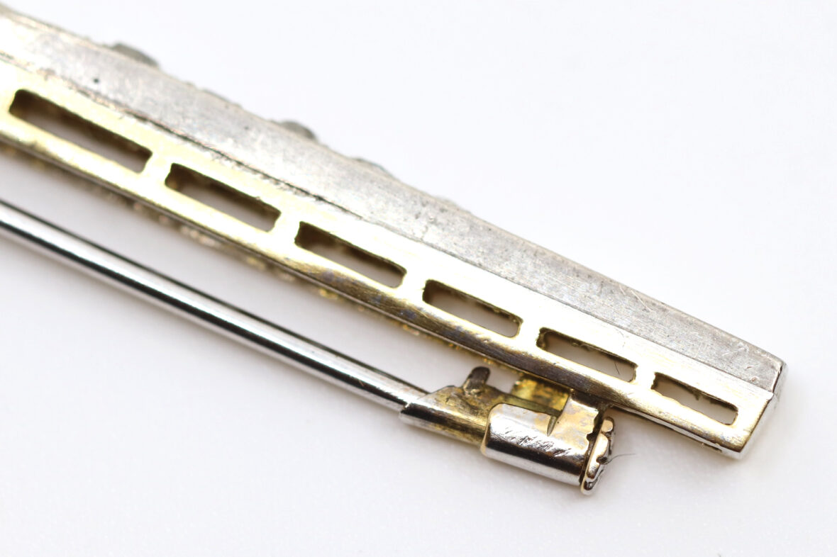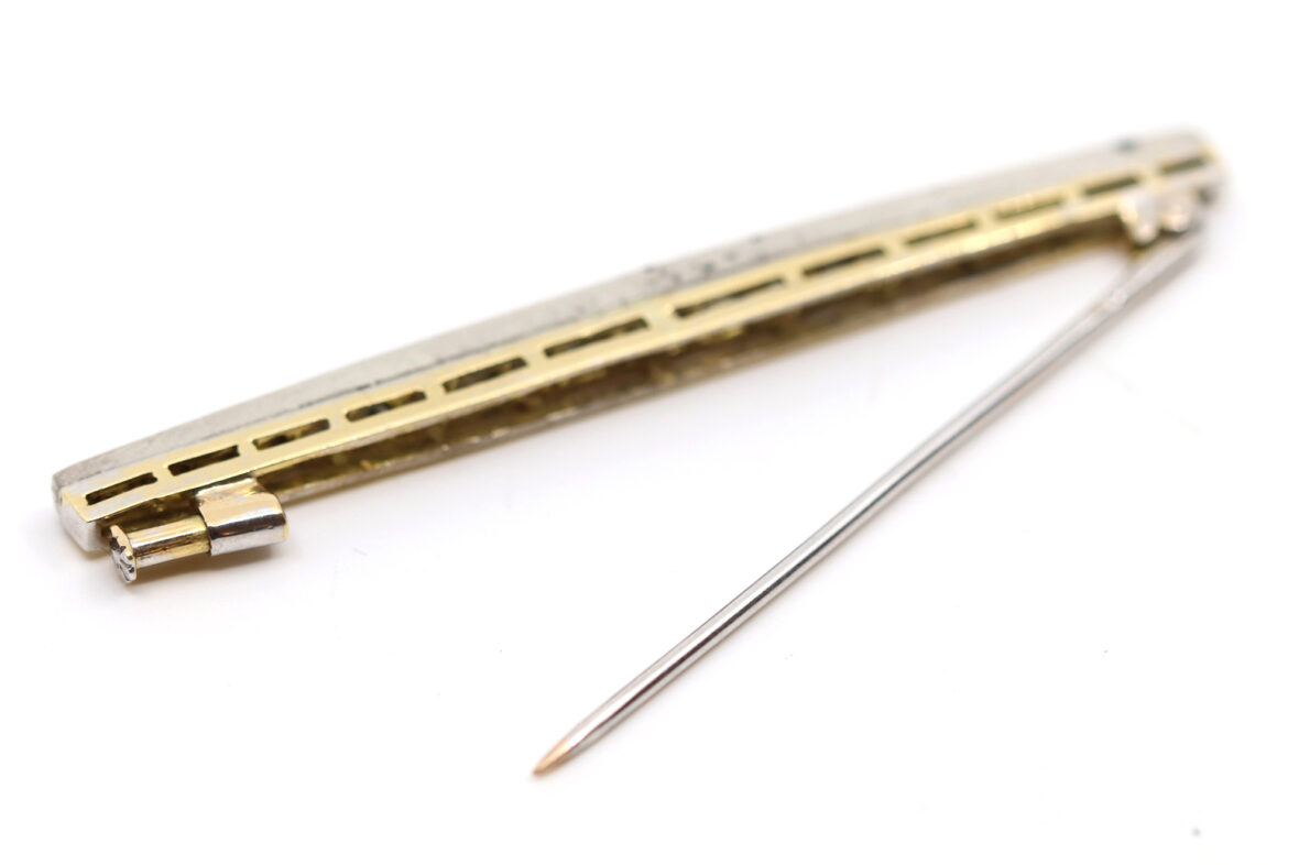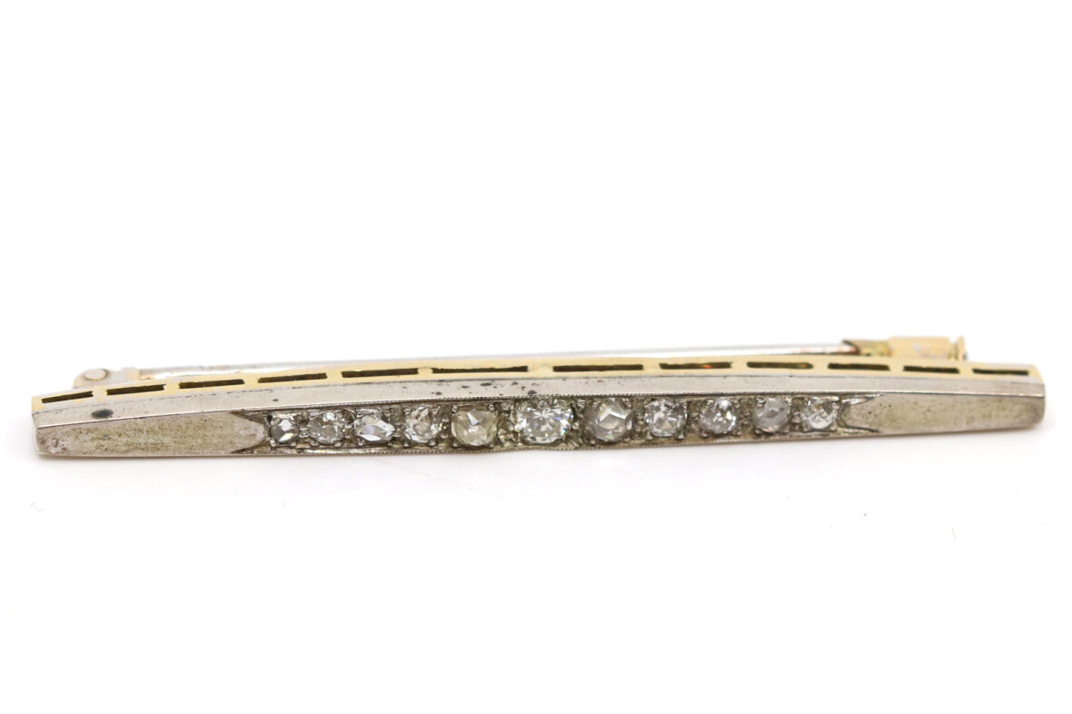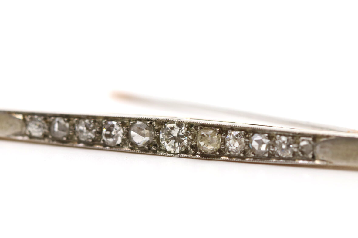 Broche barrette en or et platine, ornée de 11 diamants de taille décroissante.