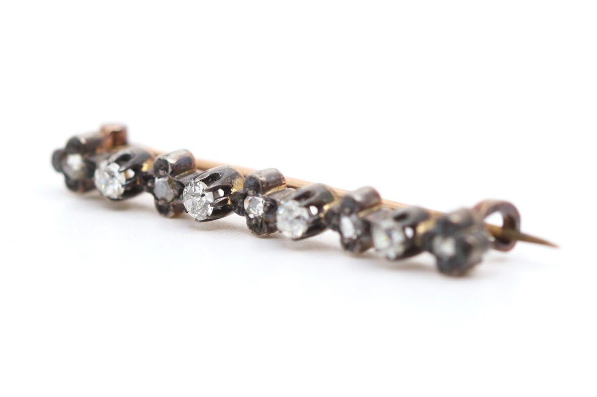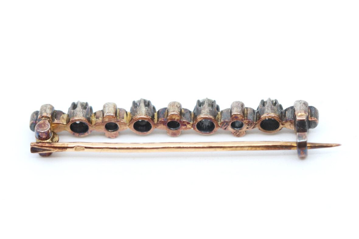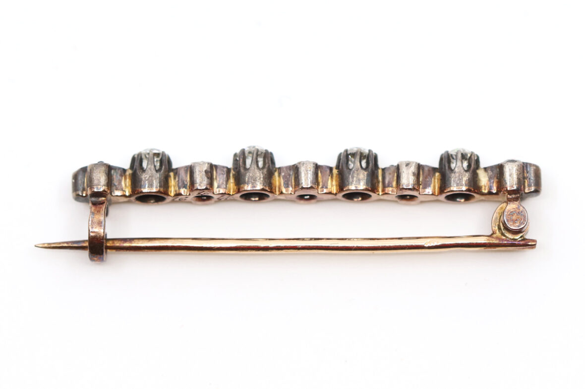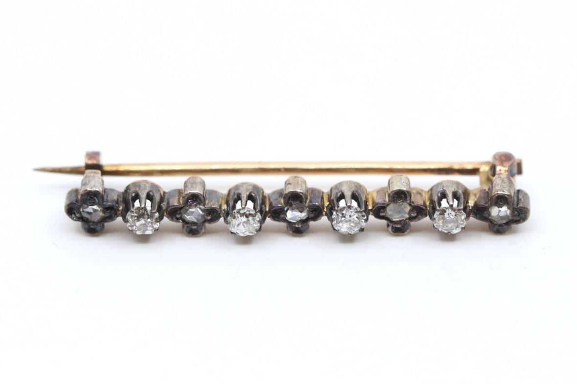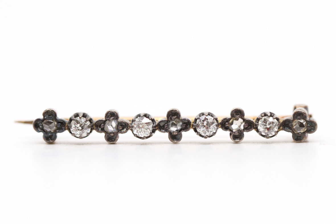 Broche barrette en or jaune à décor en alternance de trèfle centré d’une petite rose et d’un petit brillant.