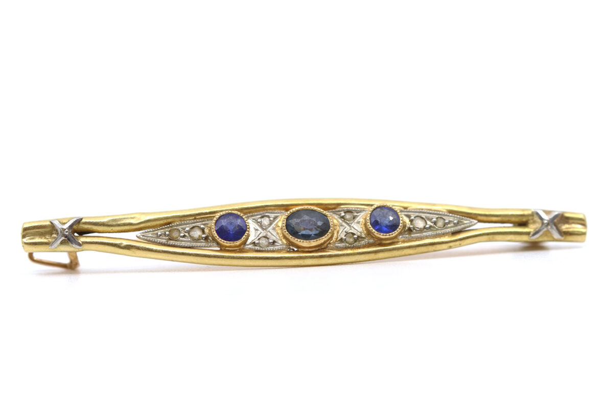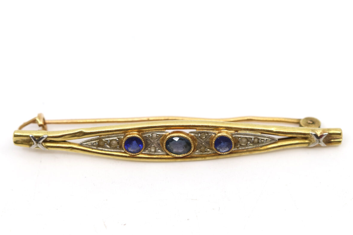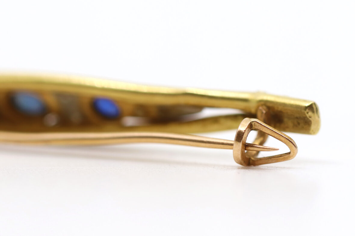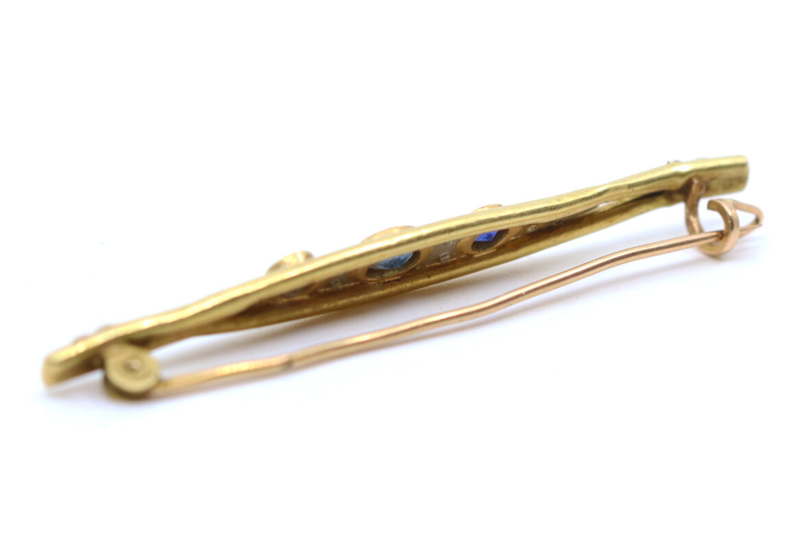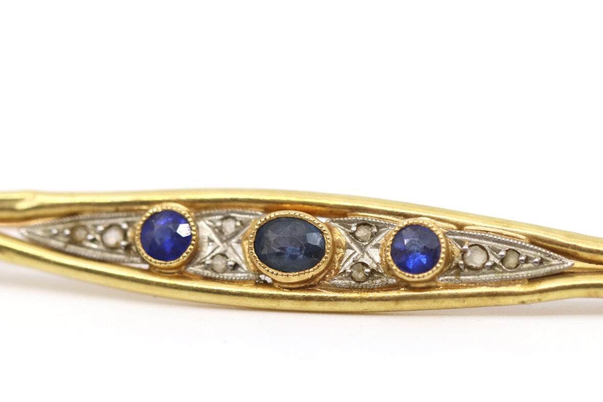 Broche barrette en or jaune et platine ornée de trois petits saphirs en serti clos et de petites roses.