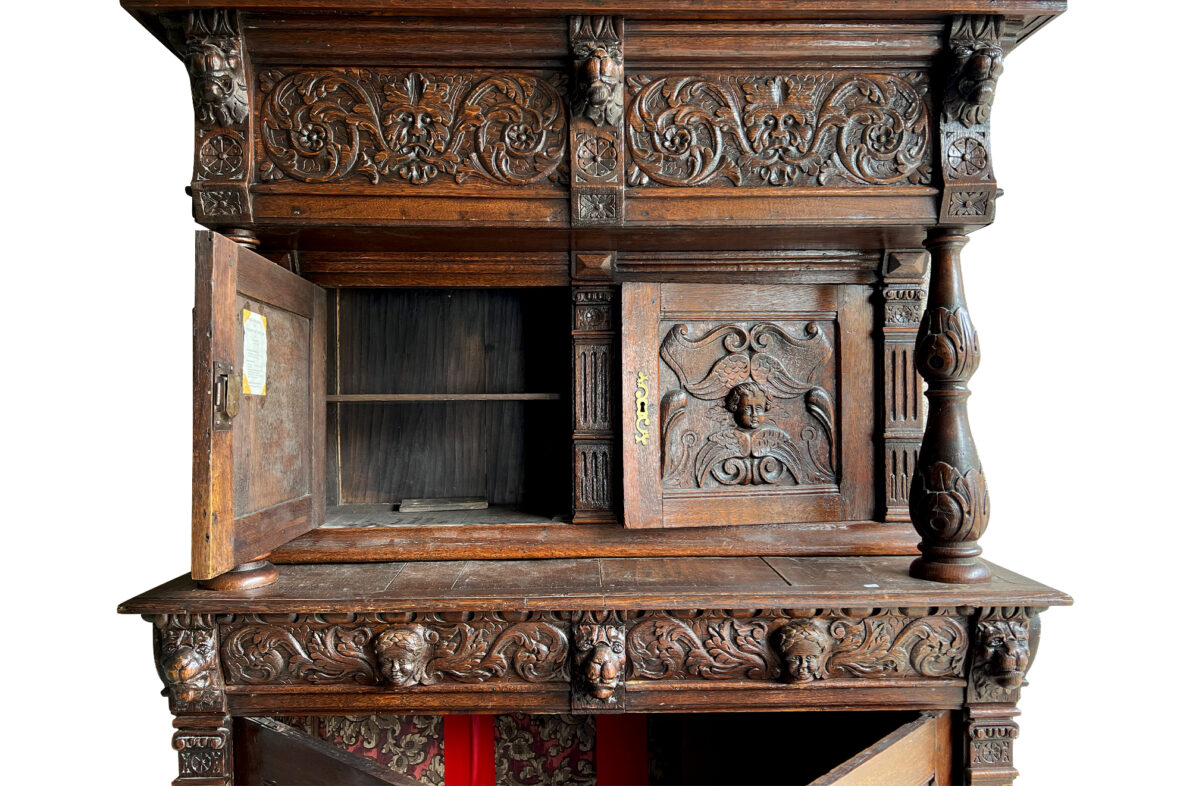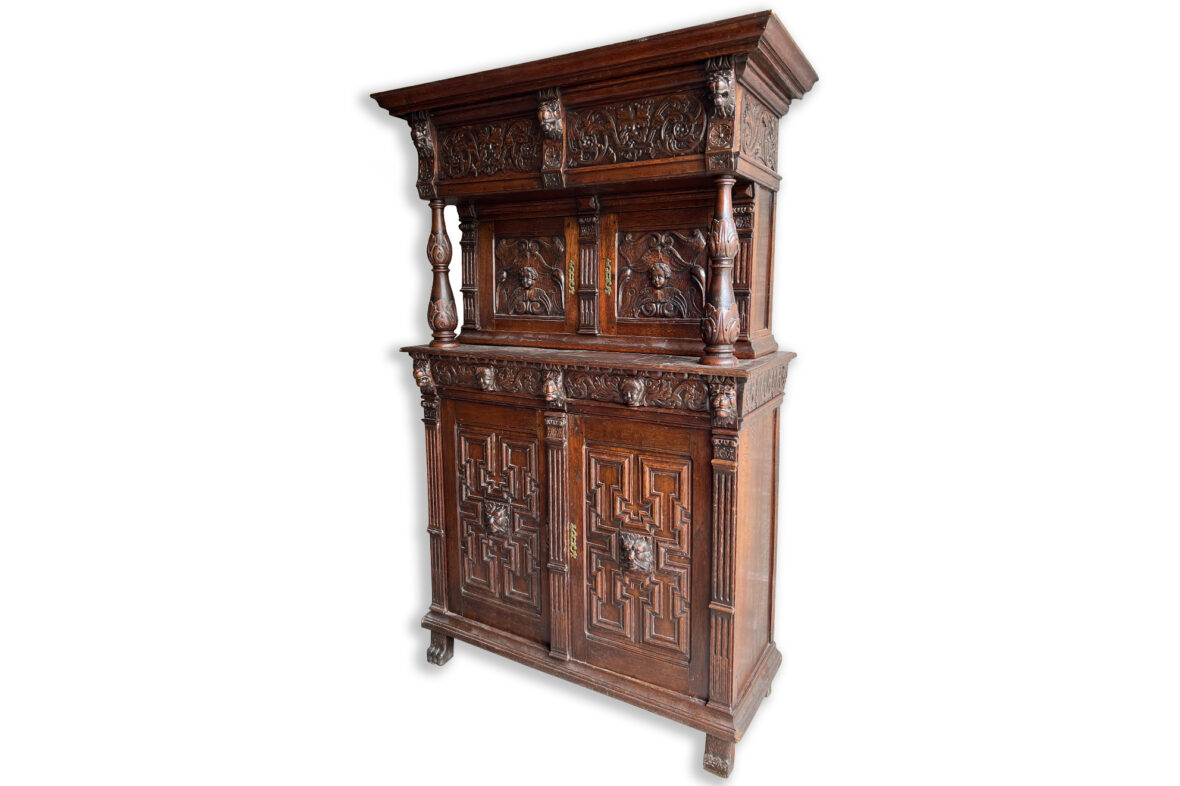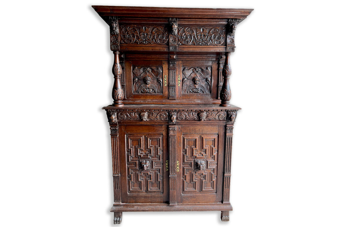 Buffet deux corps en bois naturel mouluré et sculpté à décor de mascarons, têtes d’angelots, mufles de lions et rinceaux feuillagés; ouvrant par deux portes en partie haute, deux tiroirs en ceinture et deux portes en partie basse. La corniche reposant sur deux montants balustre.