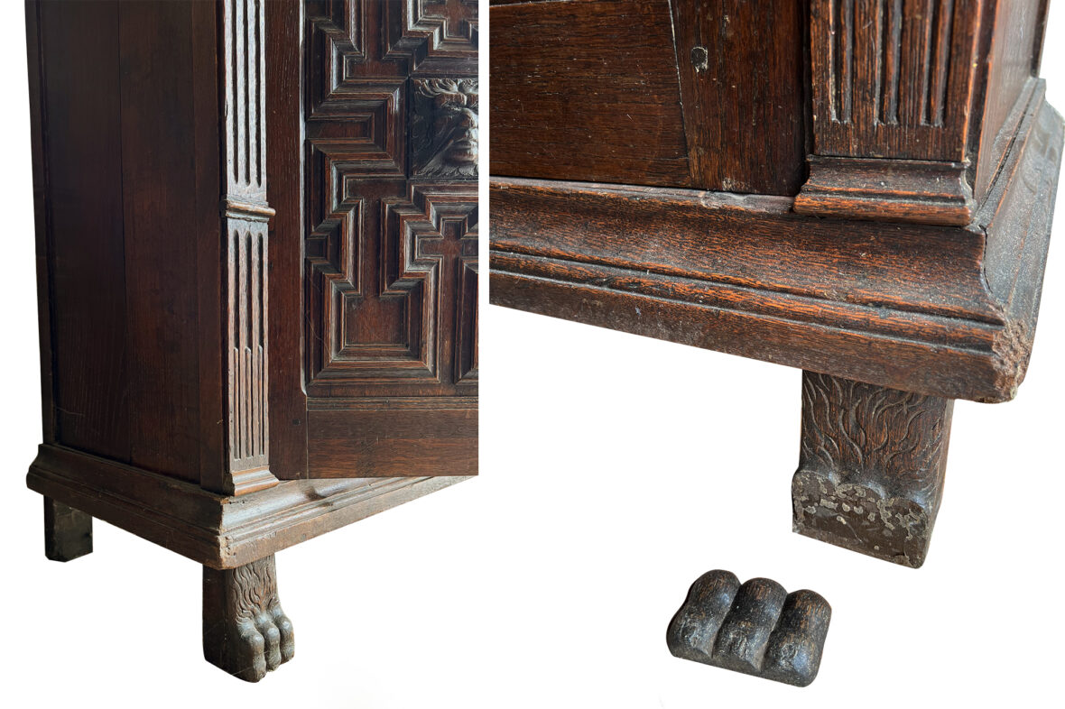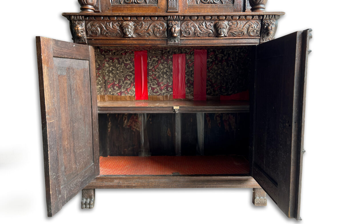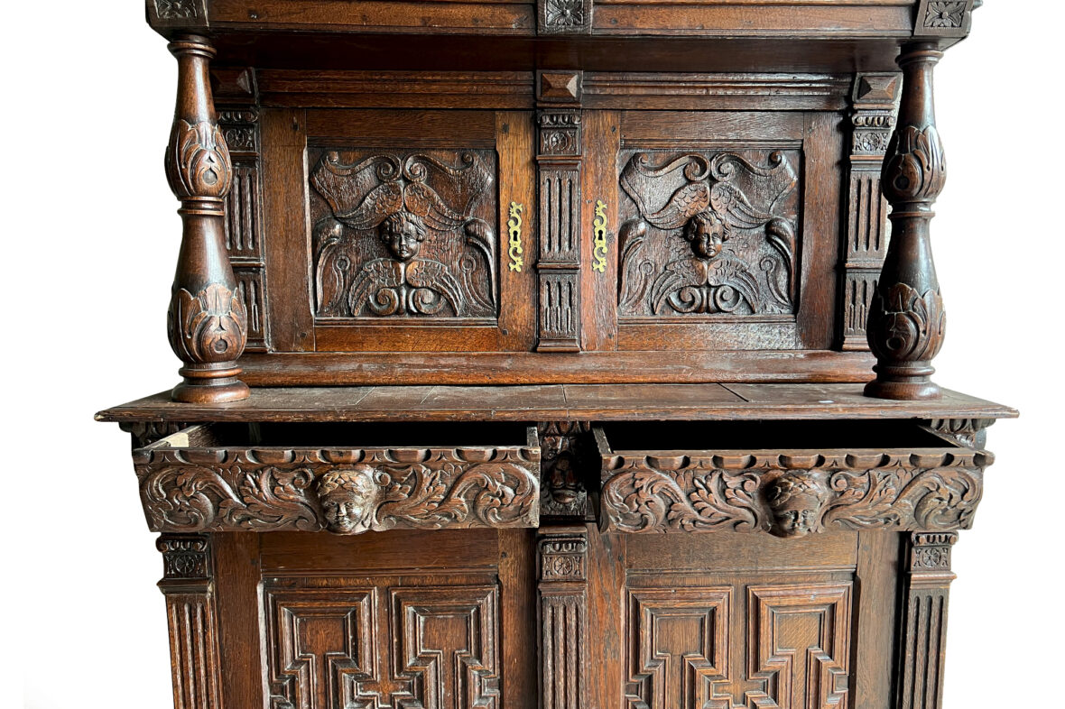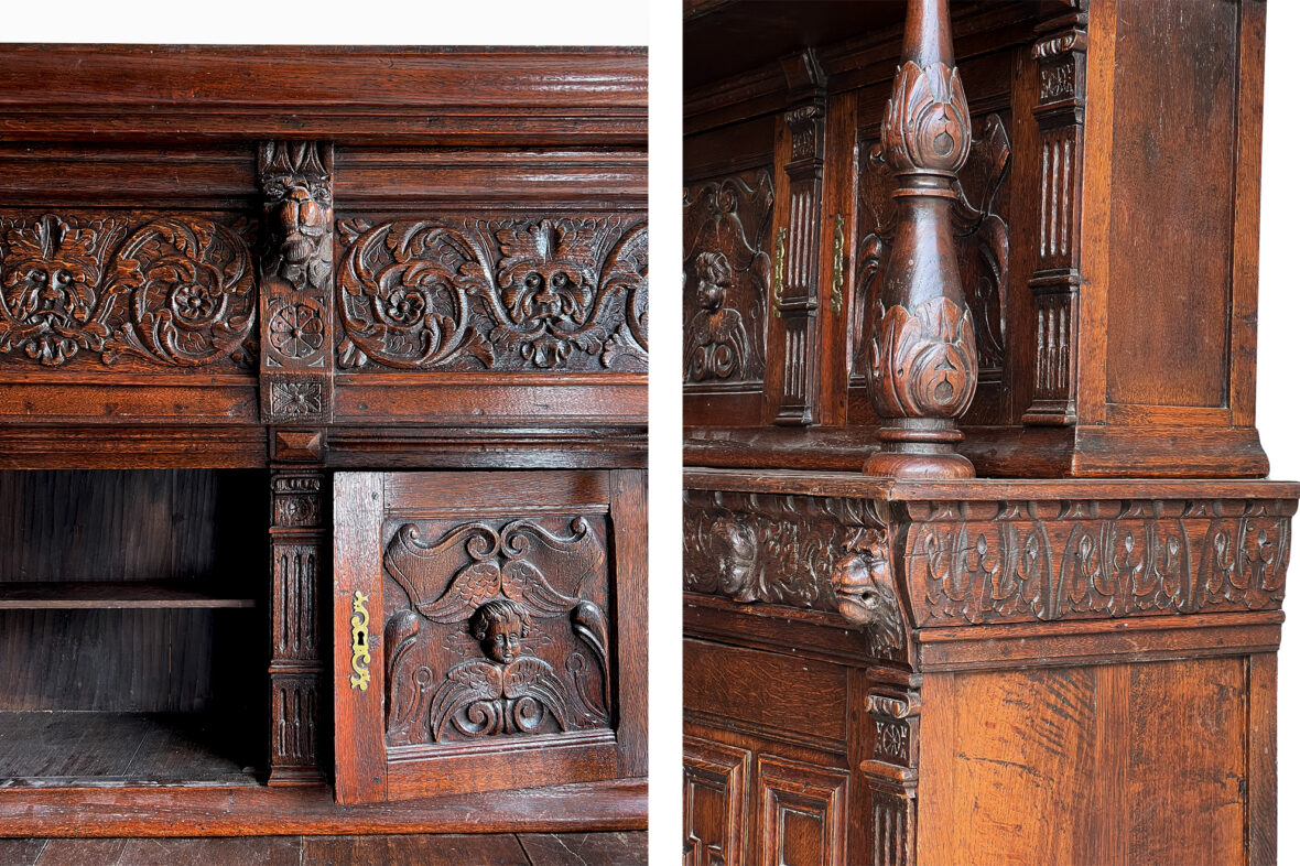Buffet deux corps en bois naturel mouluré et sculpté à décor de mascarons, têtes d’angelots, mufles de lions et rinceaux feuillagés; ouvrant par deux portes en partie haute, deux tiroirs en ceinture et deux portes en partie basse. La corniche reposant sur deux montants balustre.