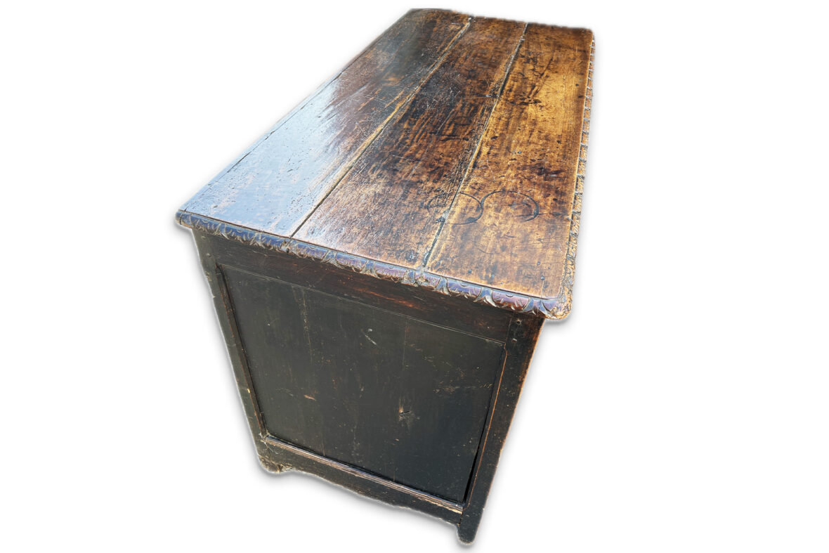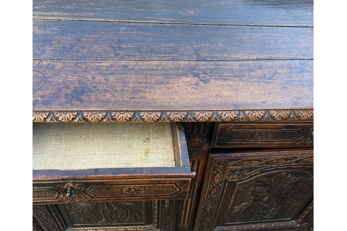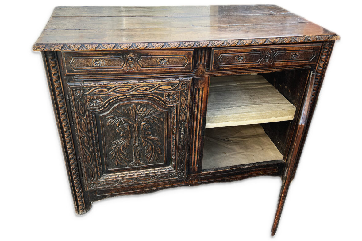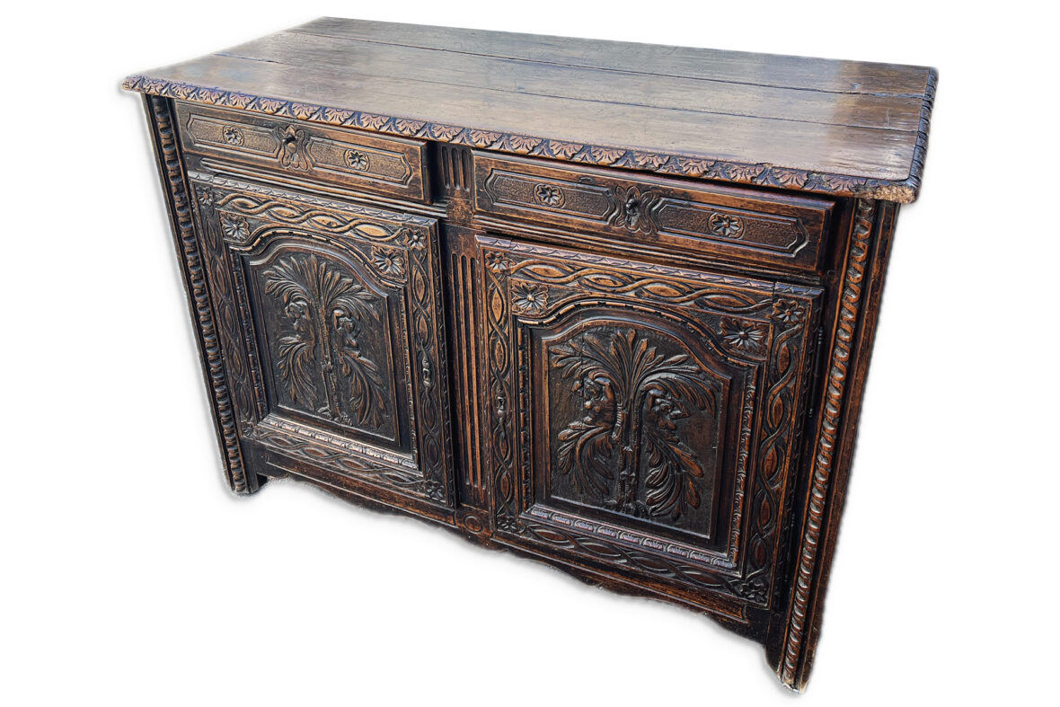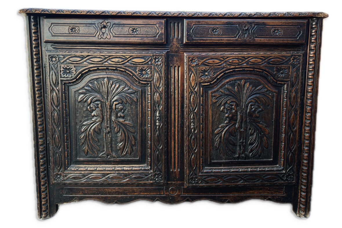 Buffet en bois mouluré et sculpté ouvrant à deux portes et deux tiroirs en ceinture, à décor de feuillage, fleurettes et frises d’entrelacs. De style provençal.