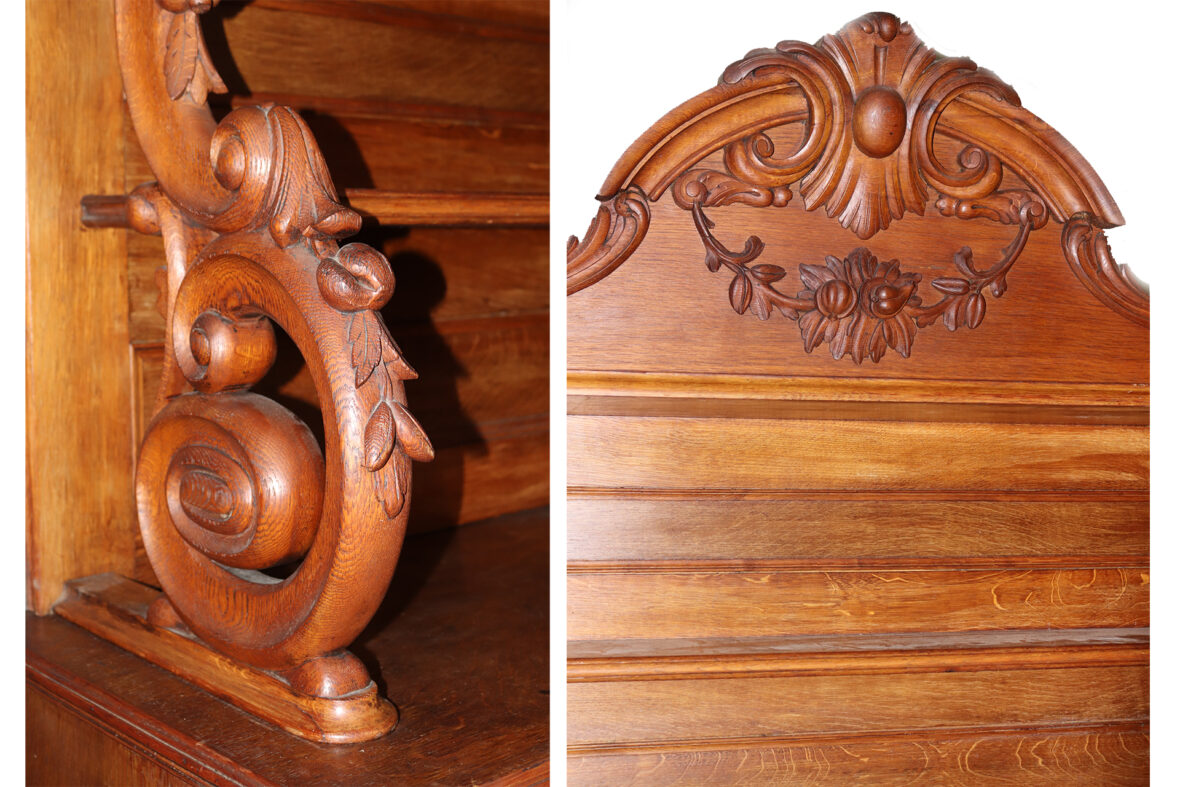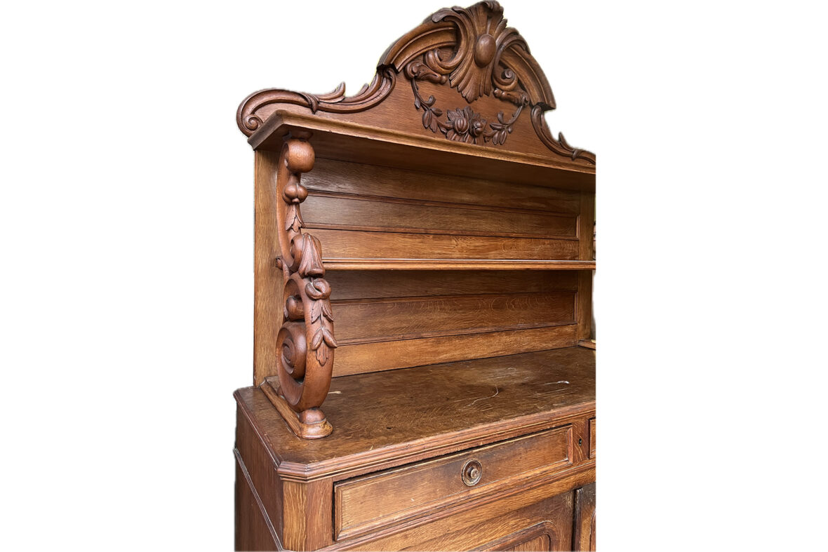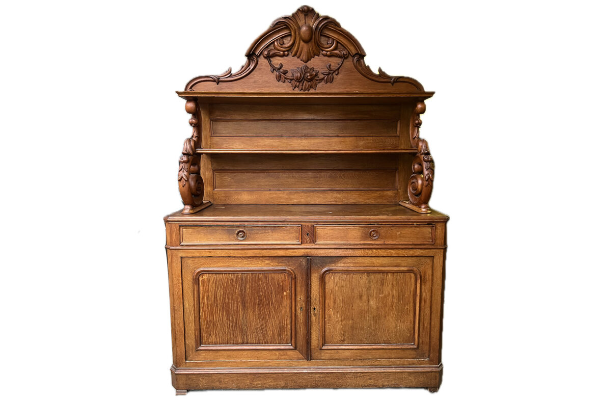 Buffet vaisselier dit Saint Hubert en bois naturel mouluré et sculpté, ouvrant par deux portes et deux tiroirs, le fronton et les montants à décor de guirlandes de fruits et feuillages.