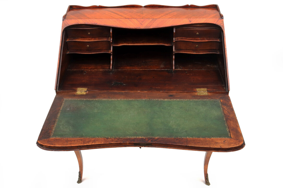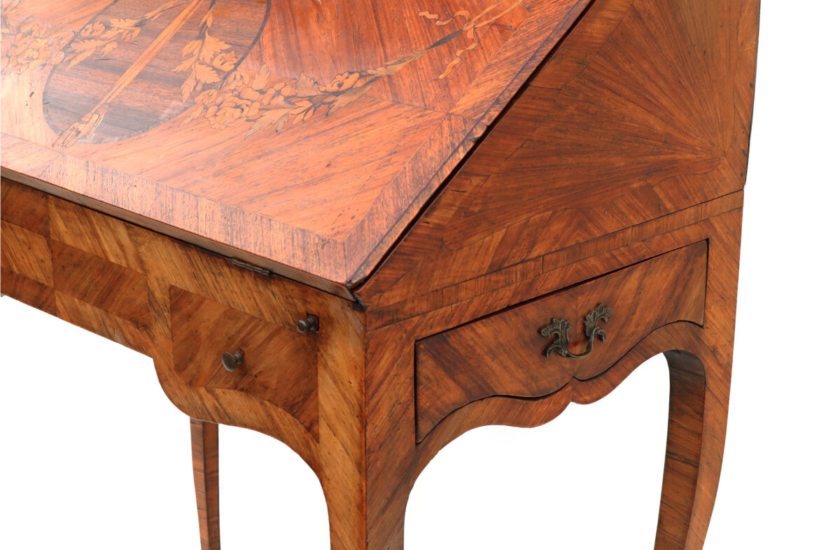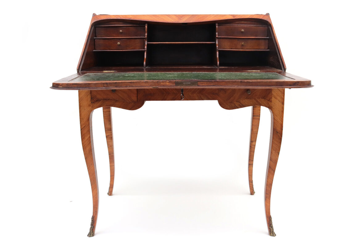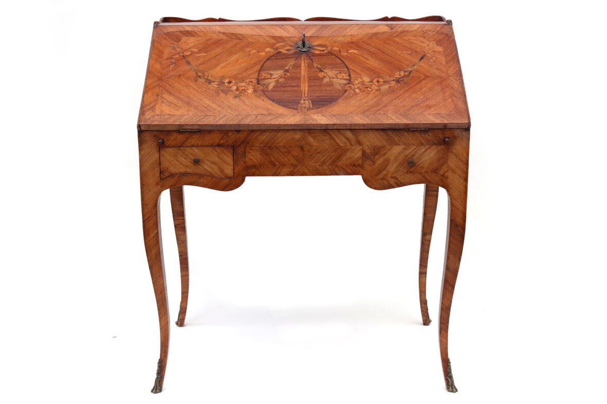 Bureau de pente en bois et bois de placage ouvrant par deux tiroirs et un abattant découvrant tiroirs et casiers, pieds cambrés. Décor marqueté d’un nœud et d’une guirlande fleurie. Ornementation de bronze doré.