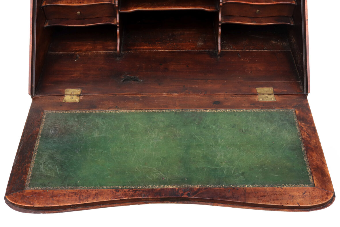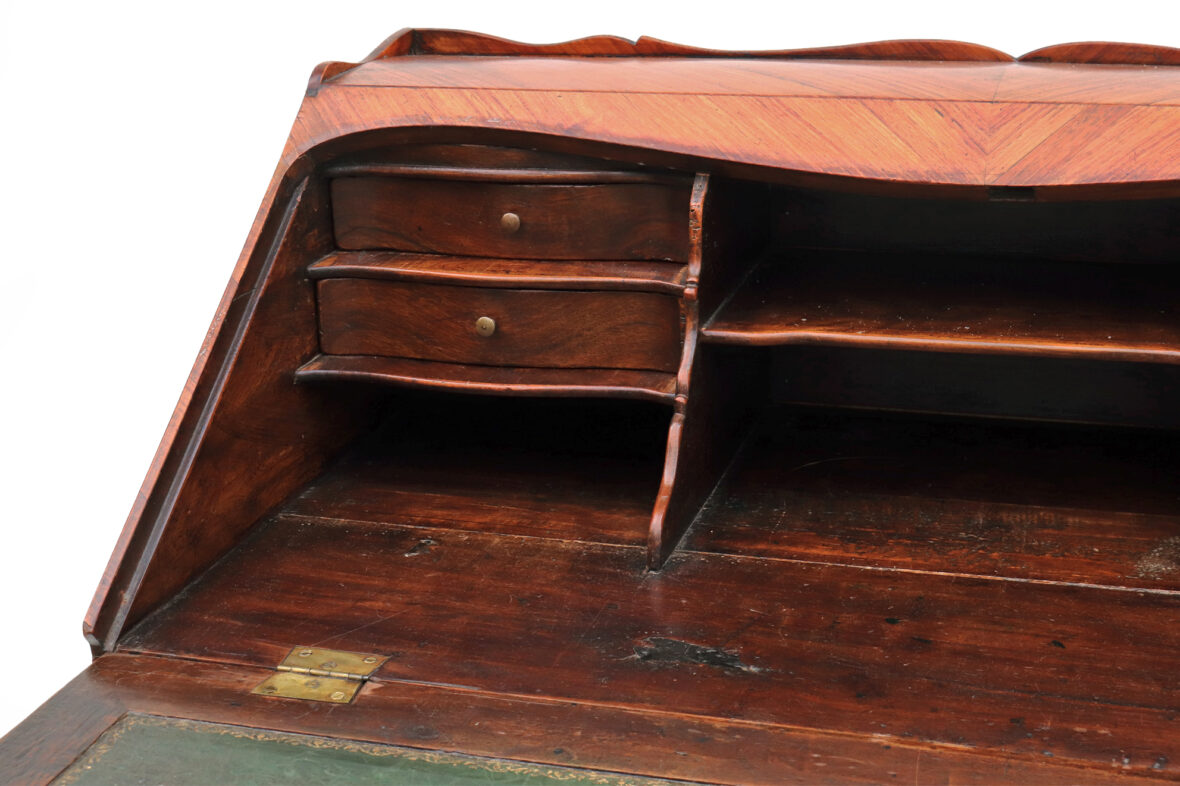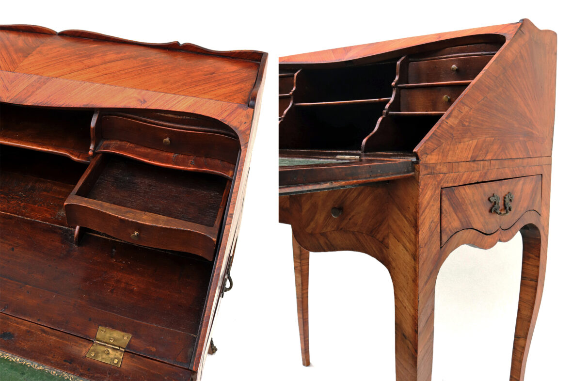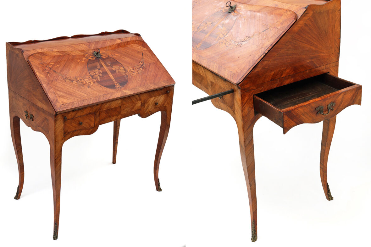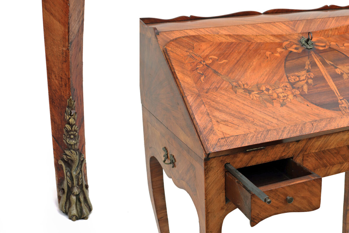 Bureau de pente en bois et bois de placage ouvrant par deux tiroirs et un abattant découvrant tiroirs et casiers, pieds cambrés. Décor marqueté d’un nœud et d’une guirlande fleurie. Ornementation de bronze doré.