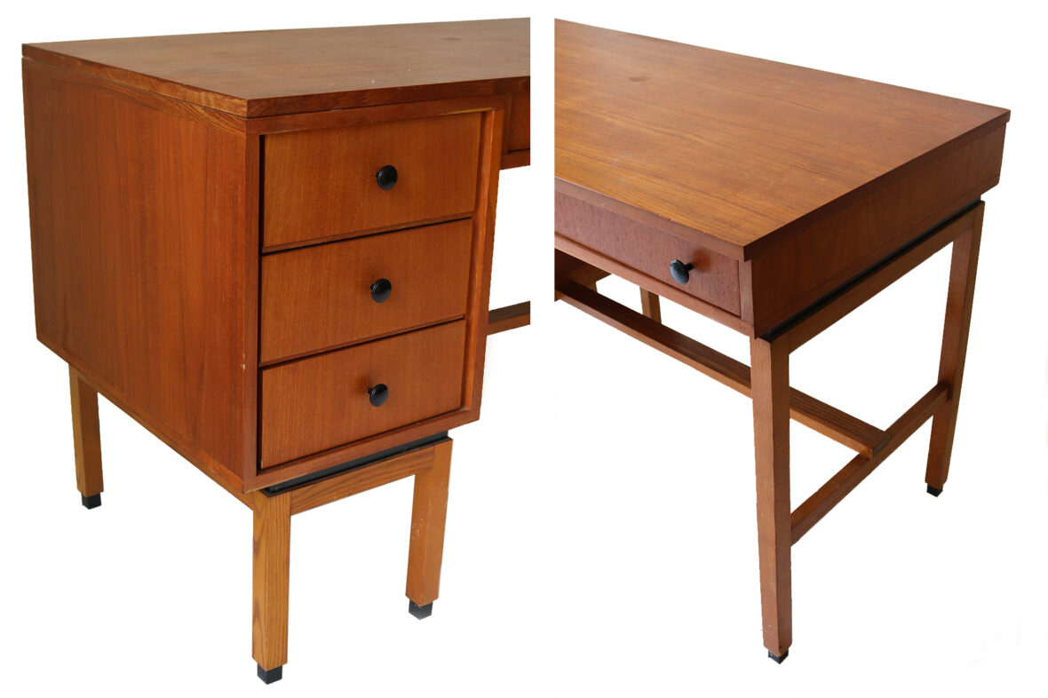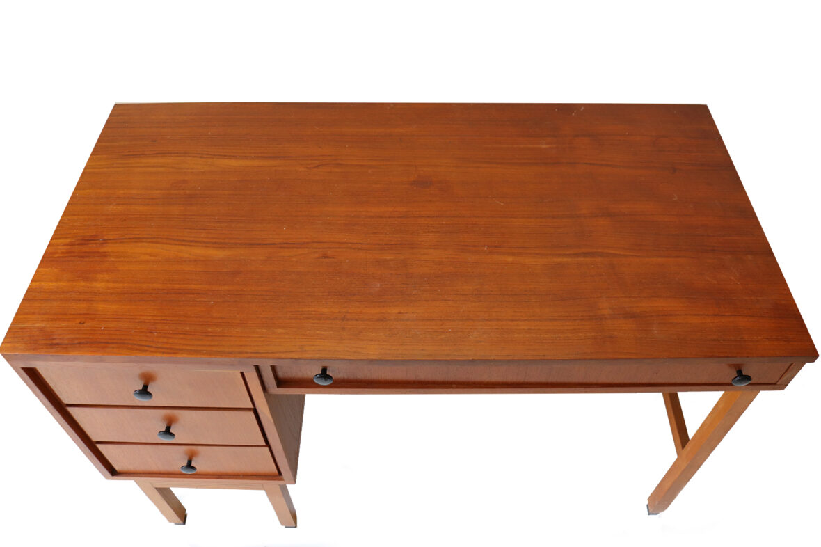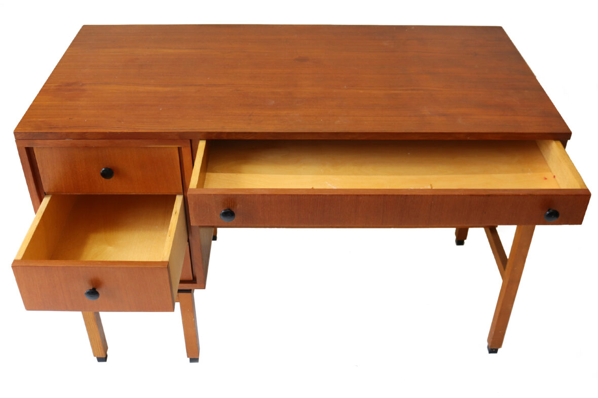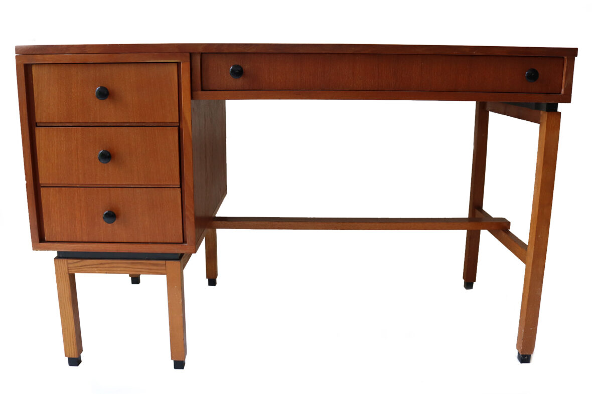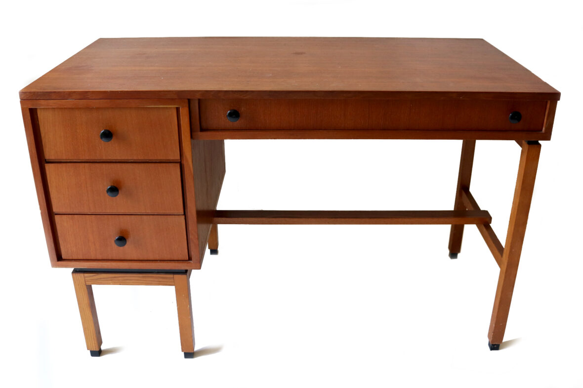 Bureau moderniste à caisson en placage de bois ouvrant par trois tiroirs en façade du caisson et un grand tiroir en ceinture. Le piètement réuni par une entretoise en H.