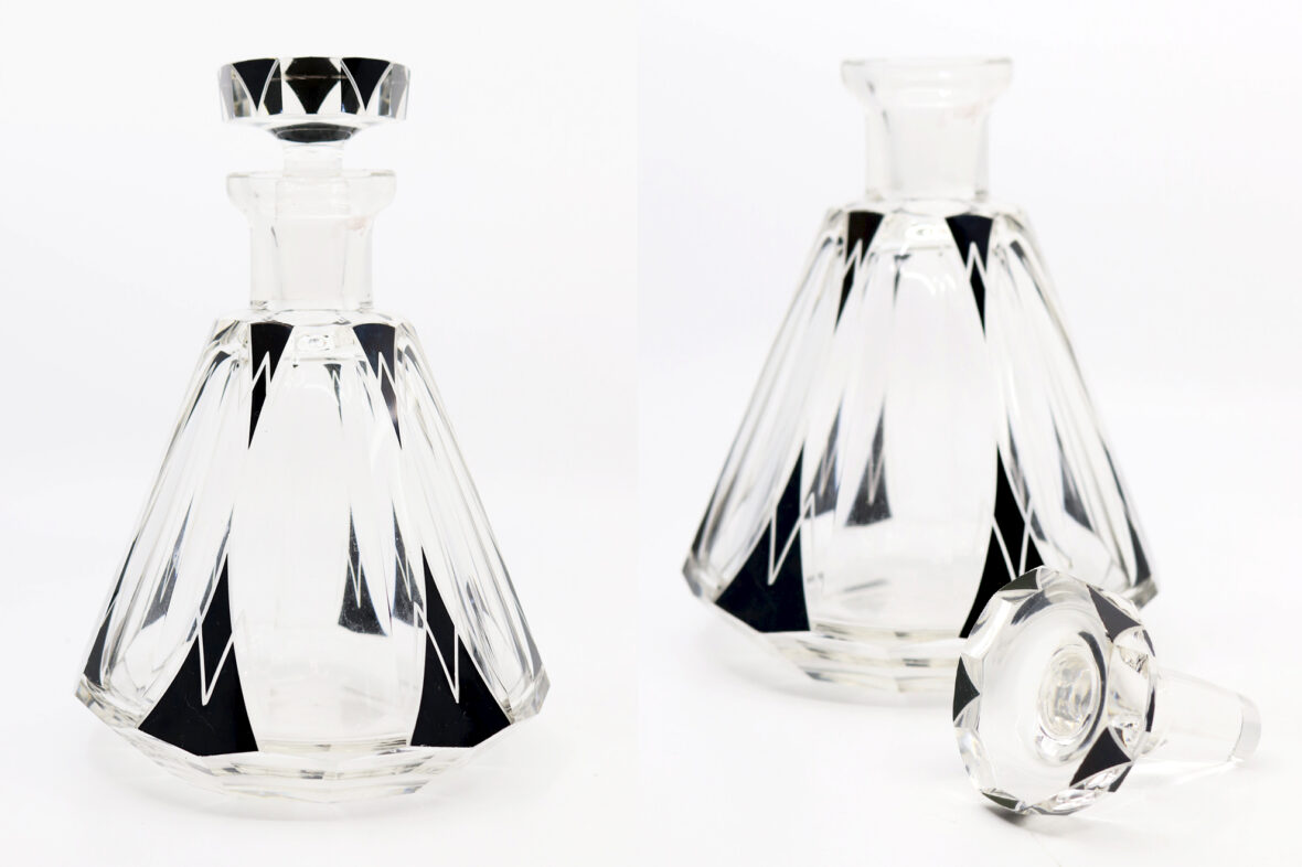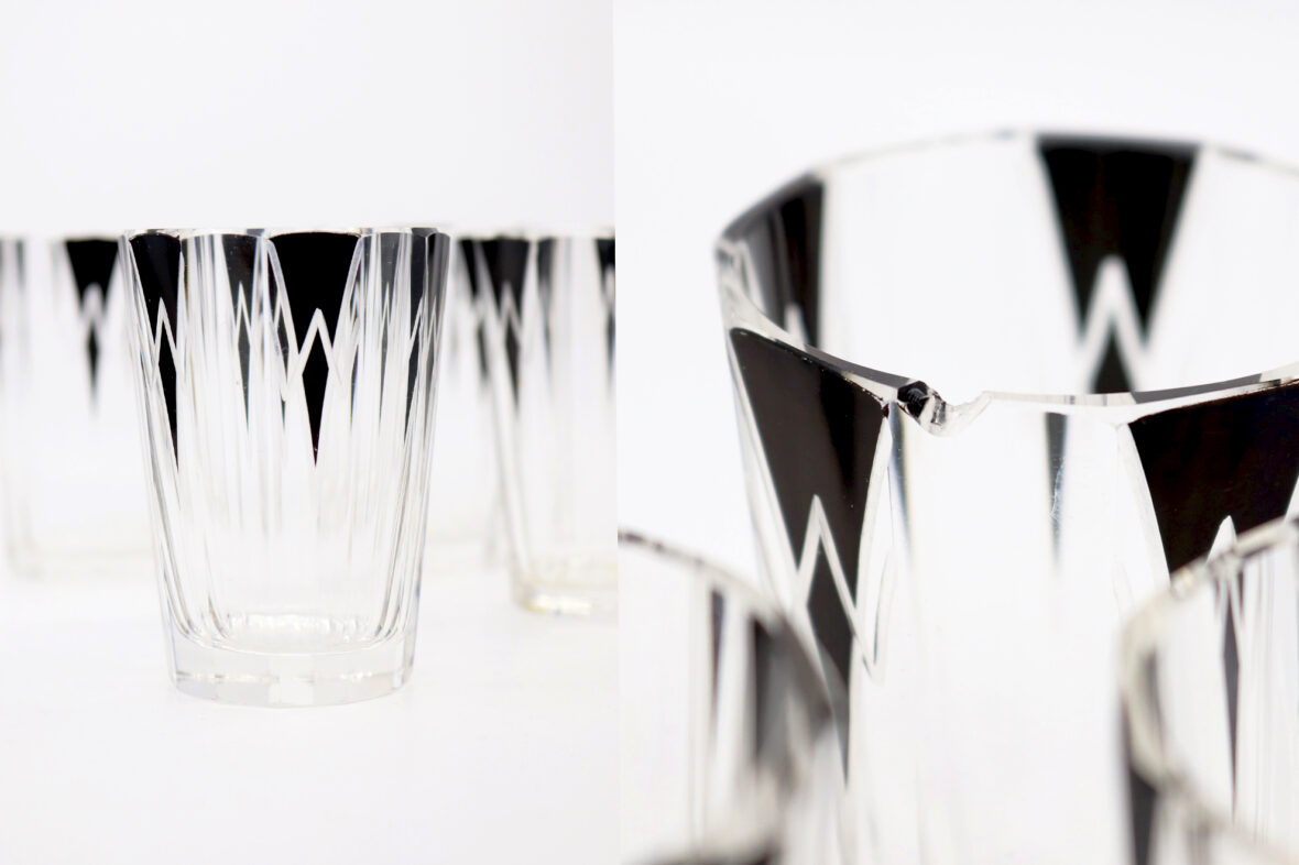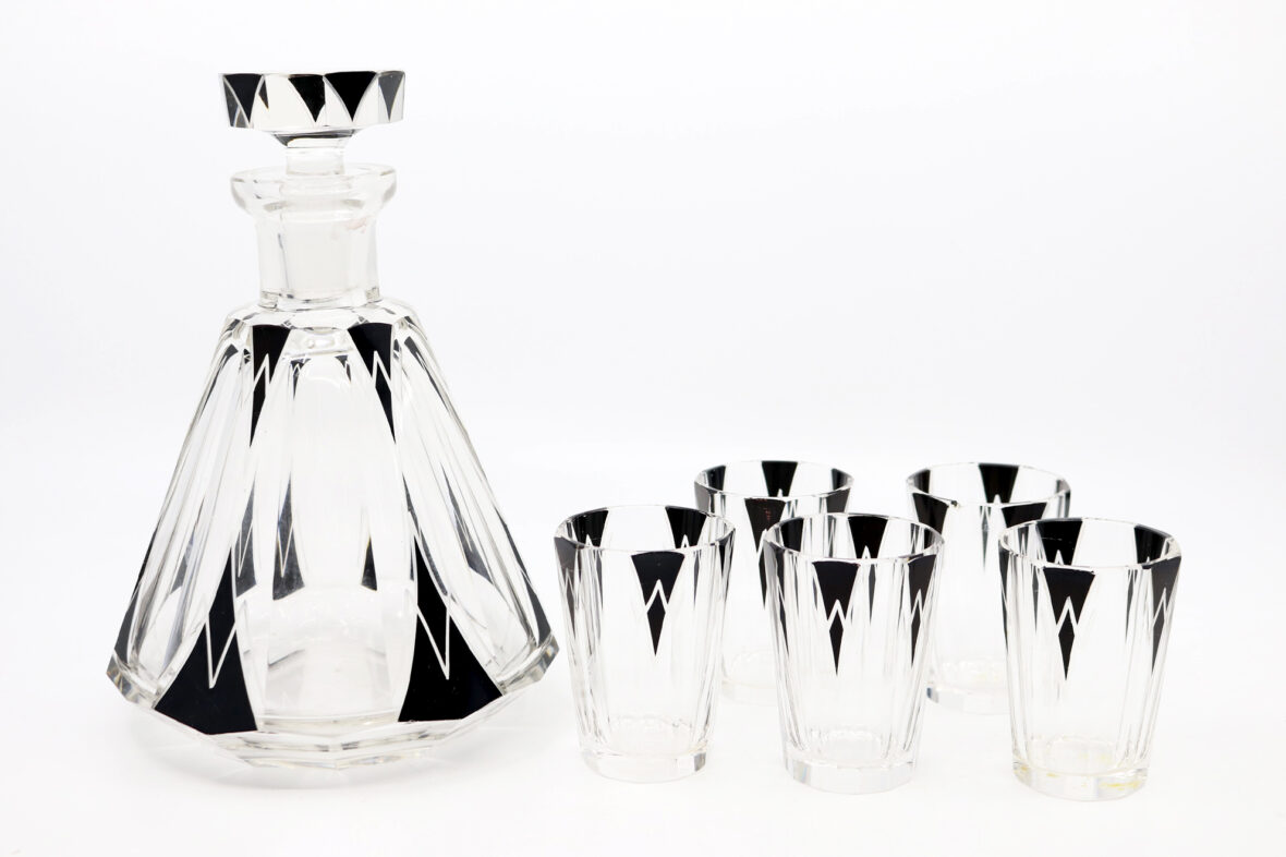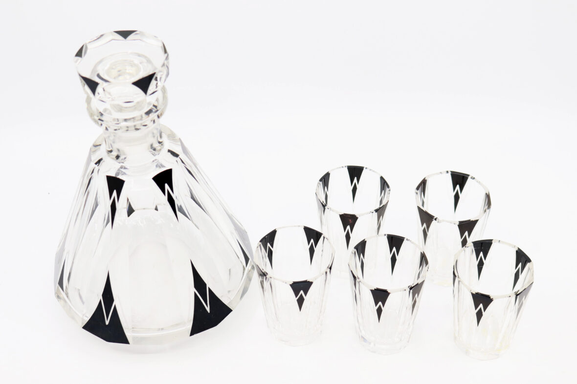 Carafe en verre et ses cinq petits verres à liqueur de style art déco.