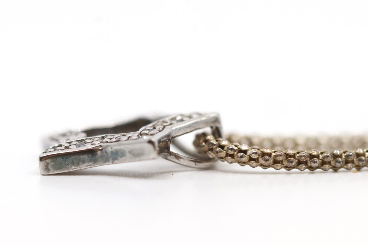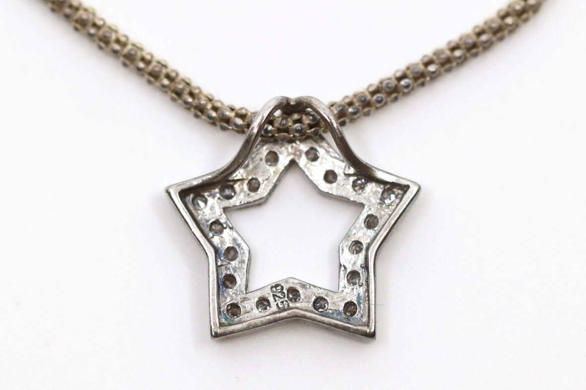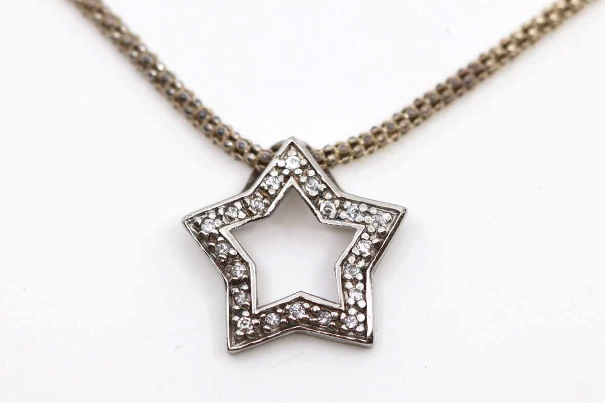 Chaîne tubogaz en argent avec pendentif en forme d’étoile pavée de pierres blanches.