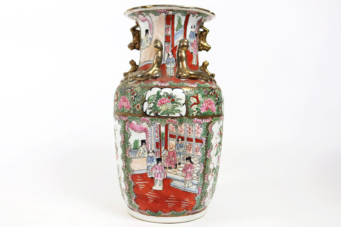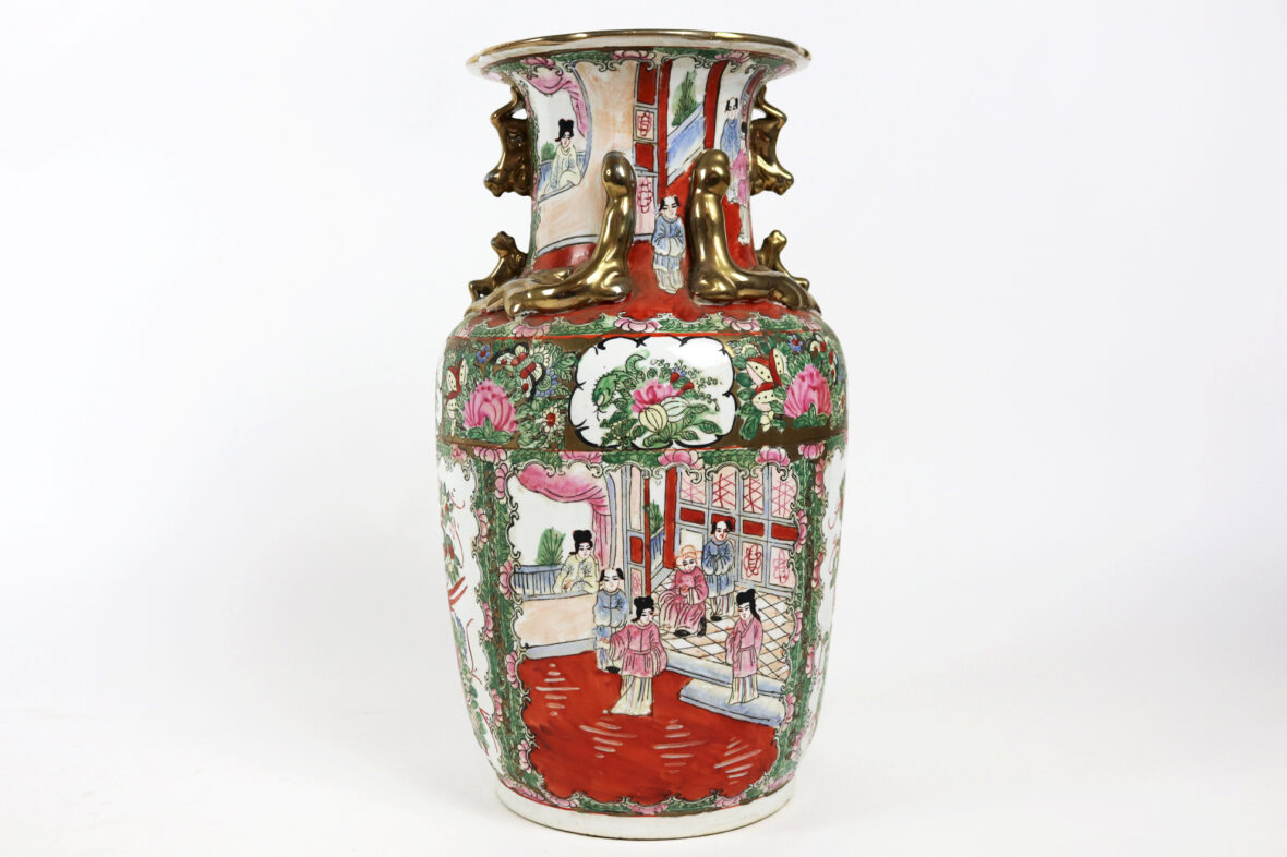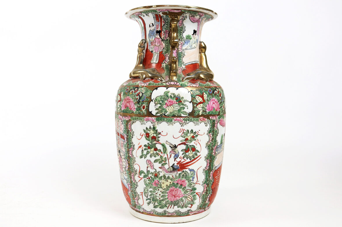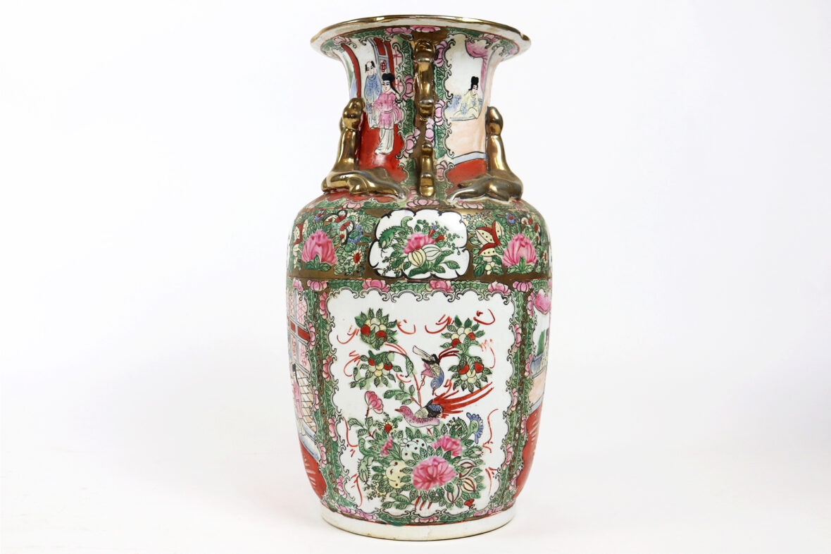 Grand vase en porcelaine à décor polychrome de scène de palais, oiseaux branché et fleurs dans des réserves. Rehauts de dorure.