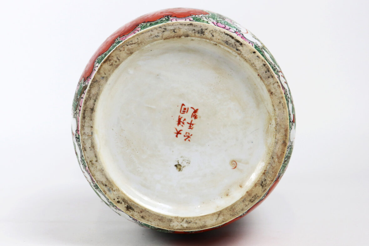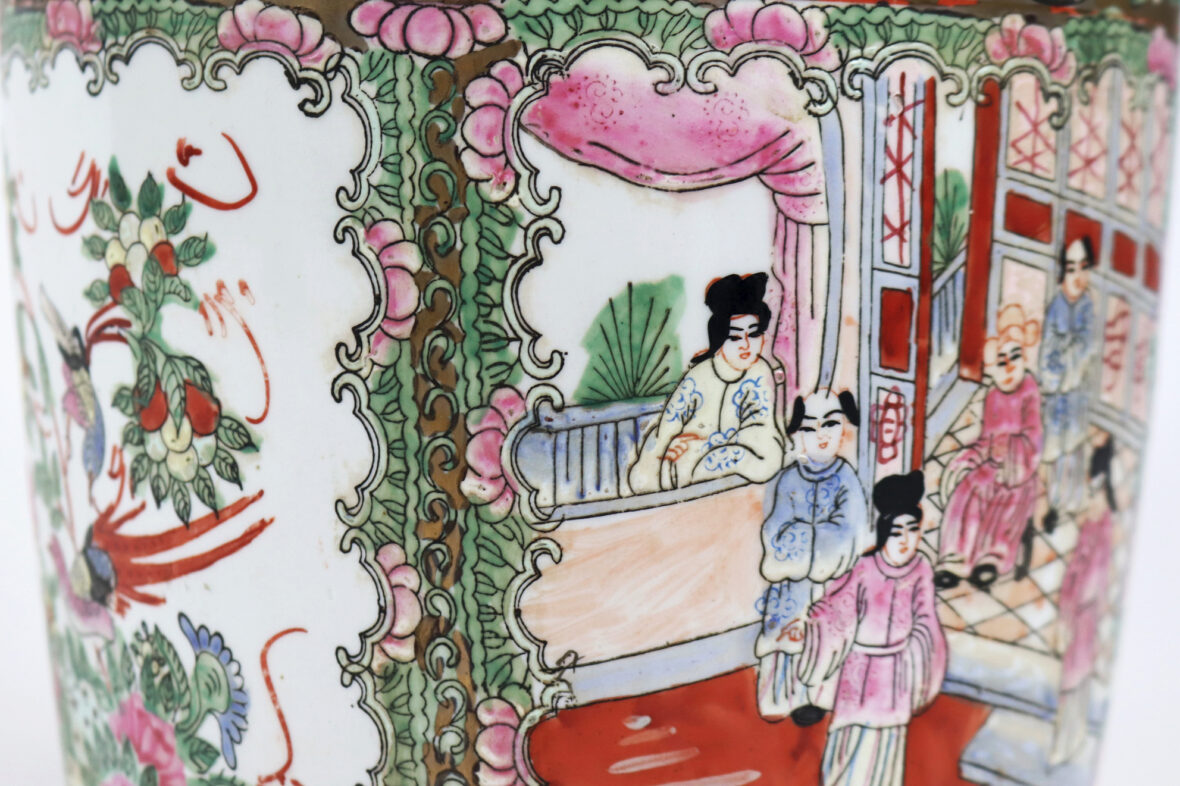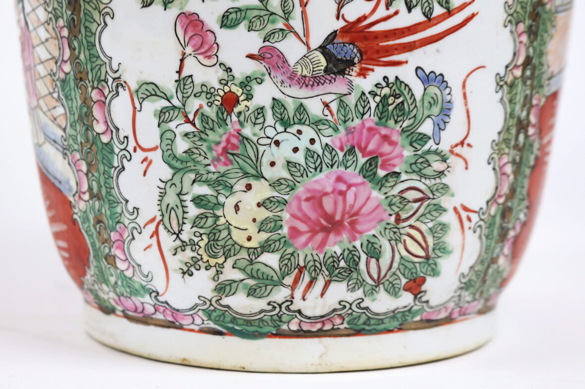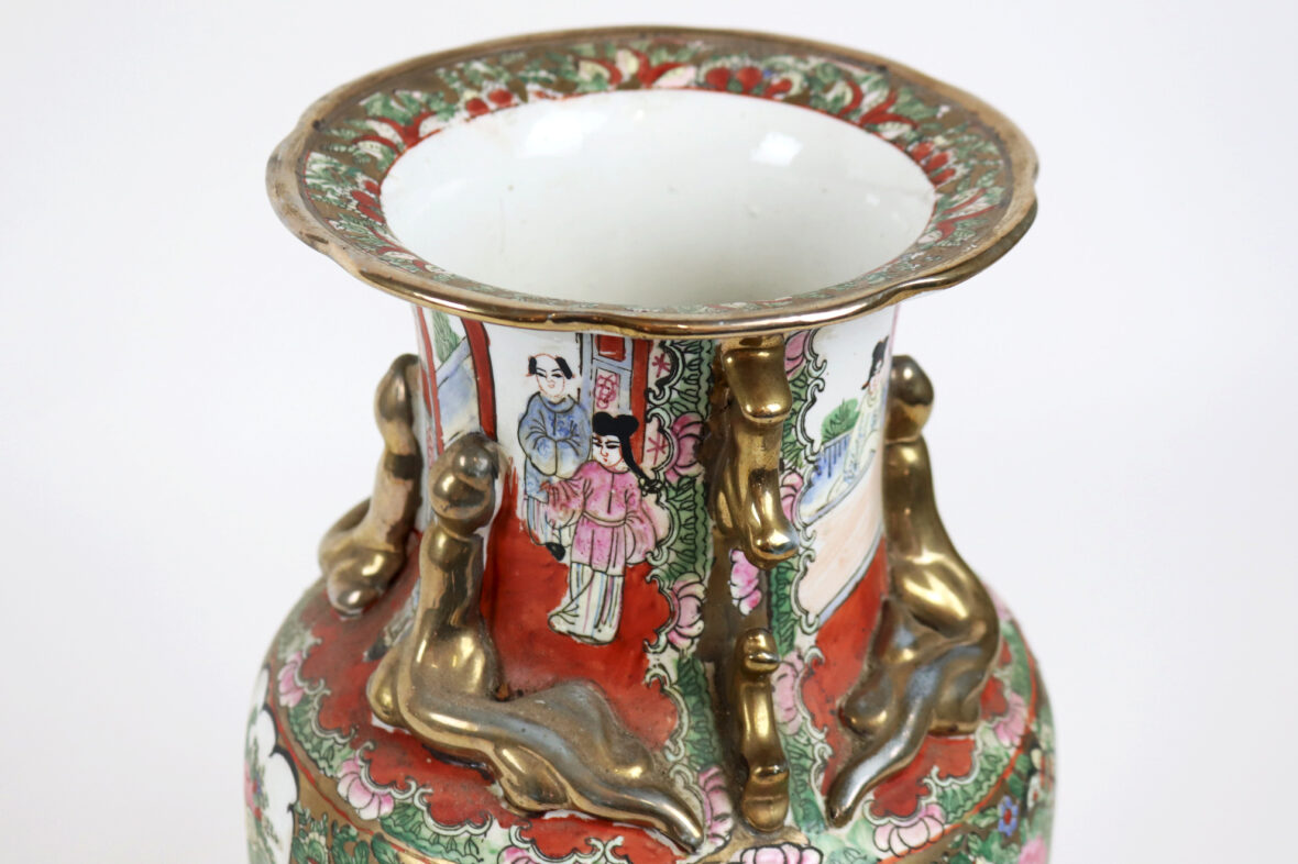 Grand vase en porcelaine à décor polychrome de scène de palais, oiseaux branché et fleurs dans des réserves. Rehauts de dorure.
