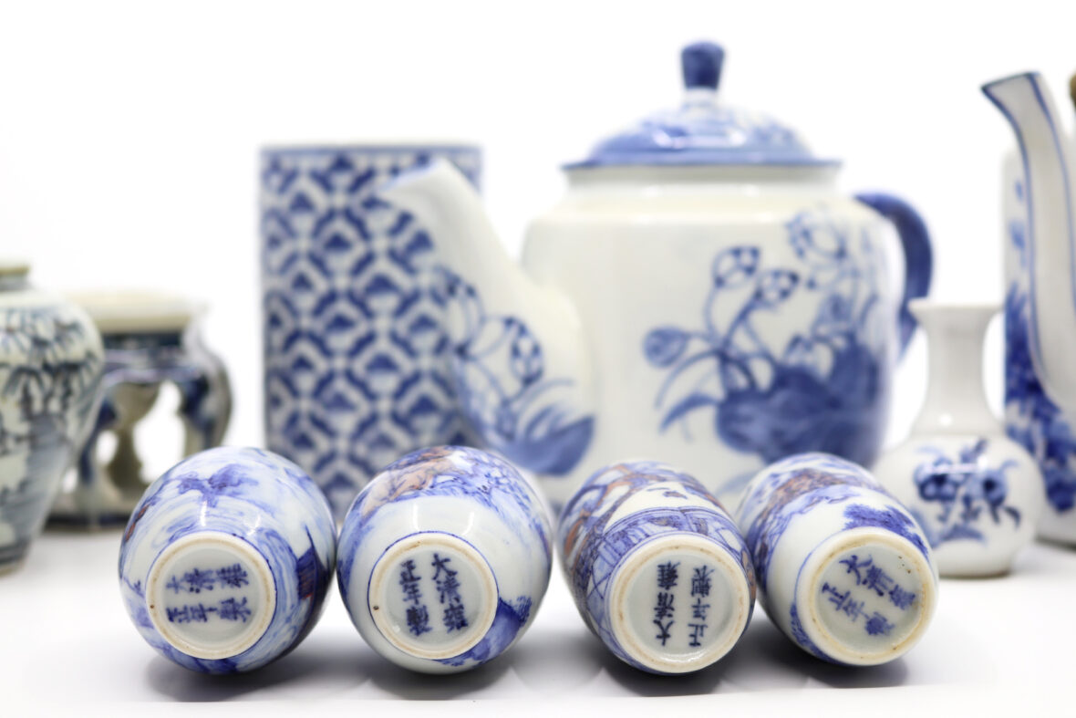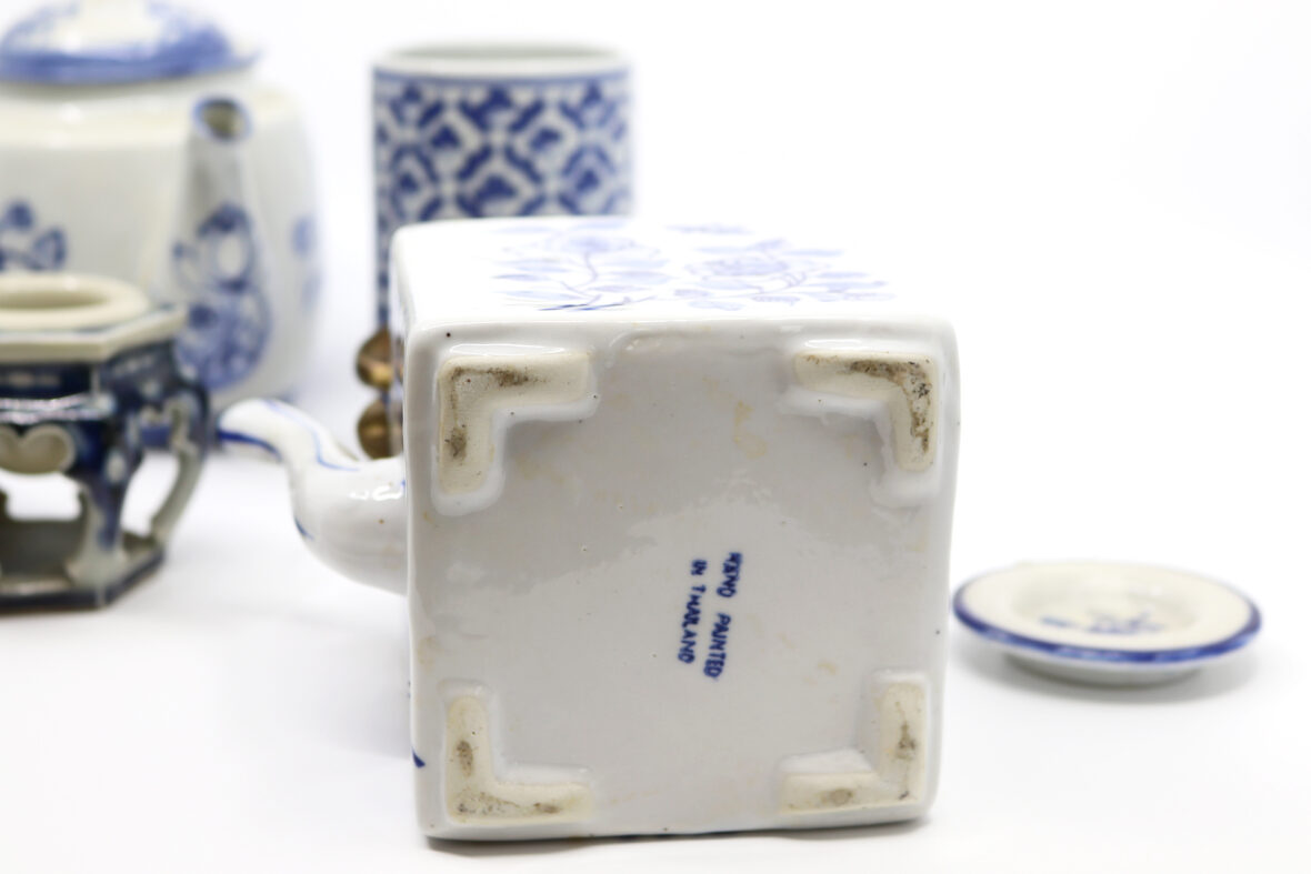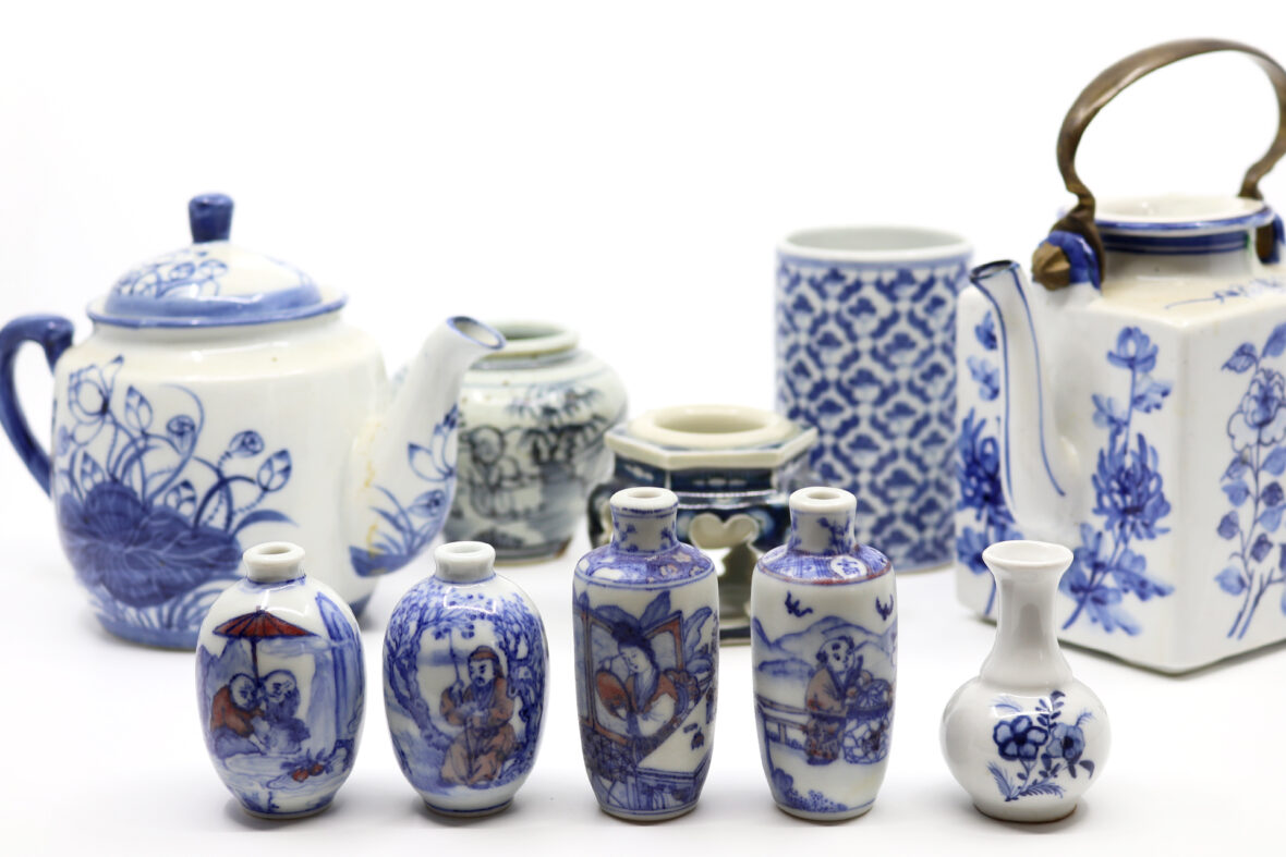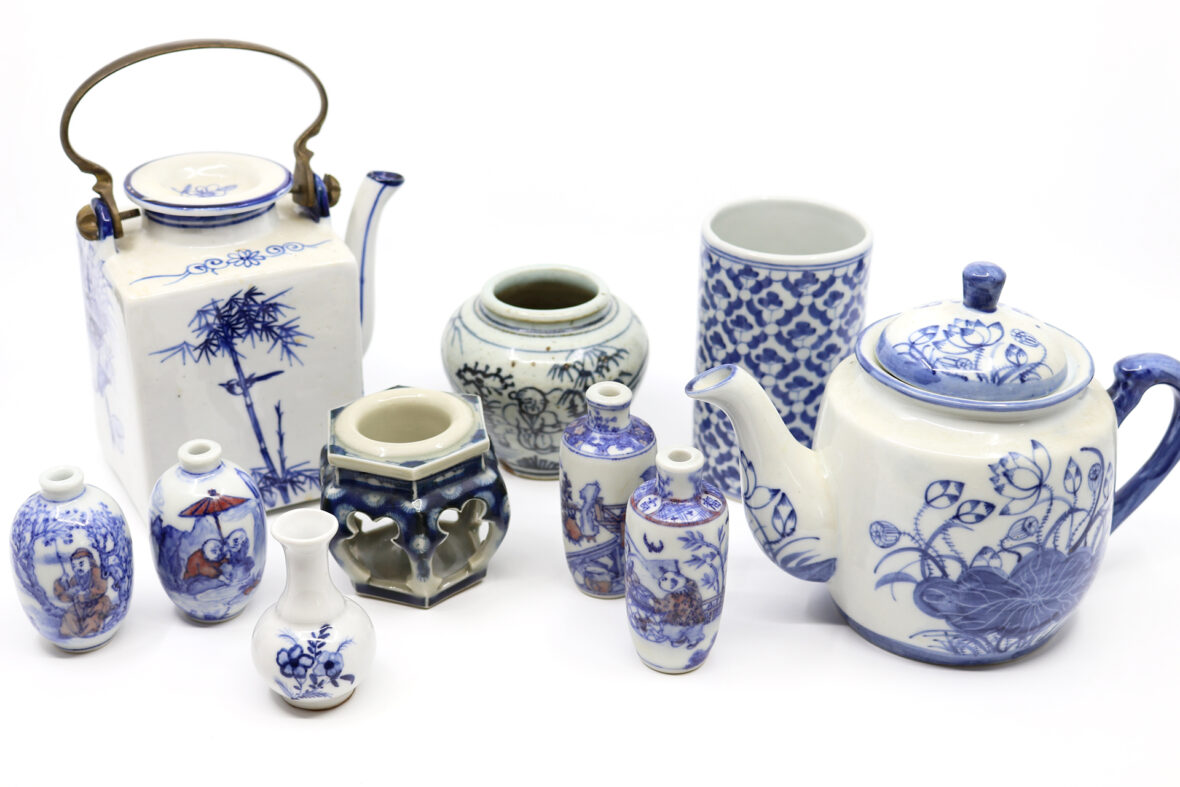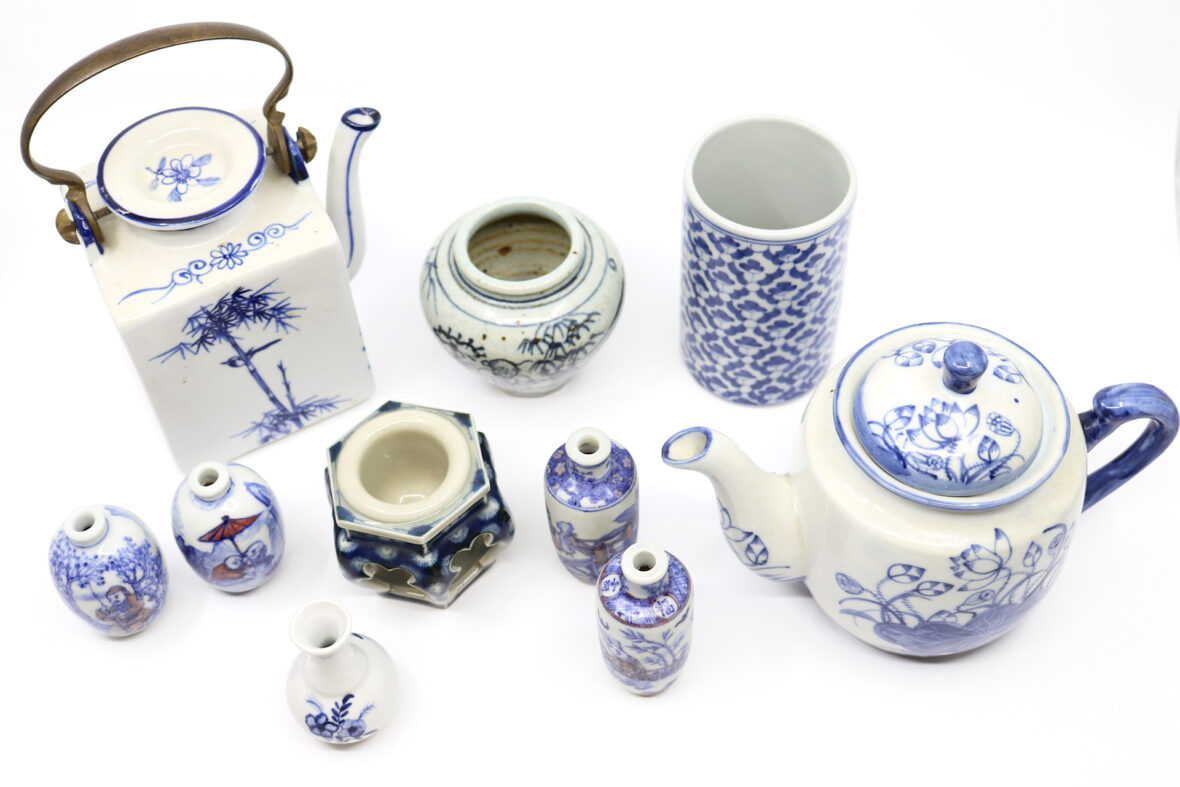 Ensemble en porcelaine blanc bleu comprenant notamment deux théières, cinq petits vases soliflores, un pot cylindrique, un encrier à décor ajouré.