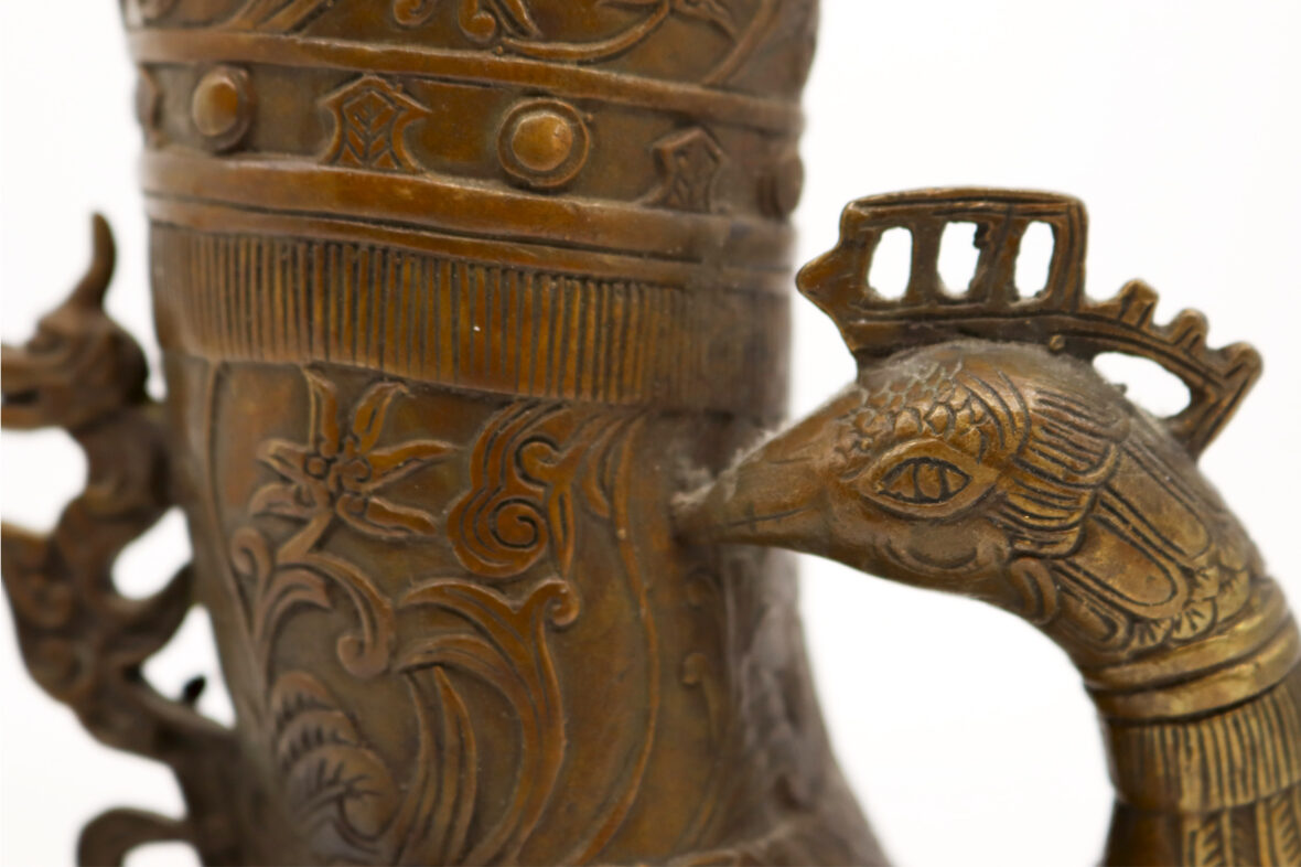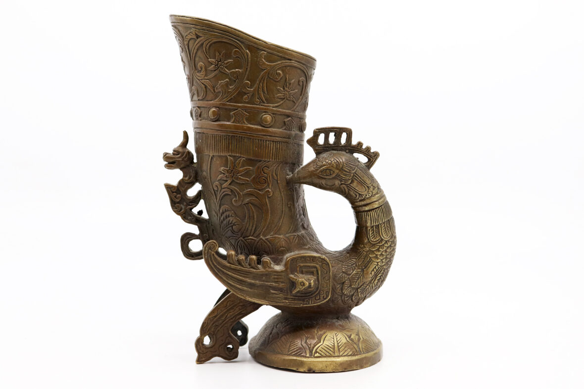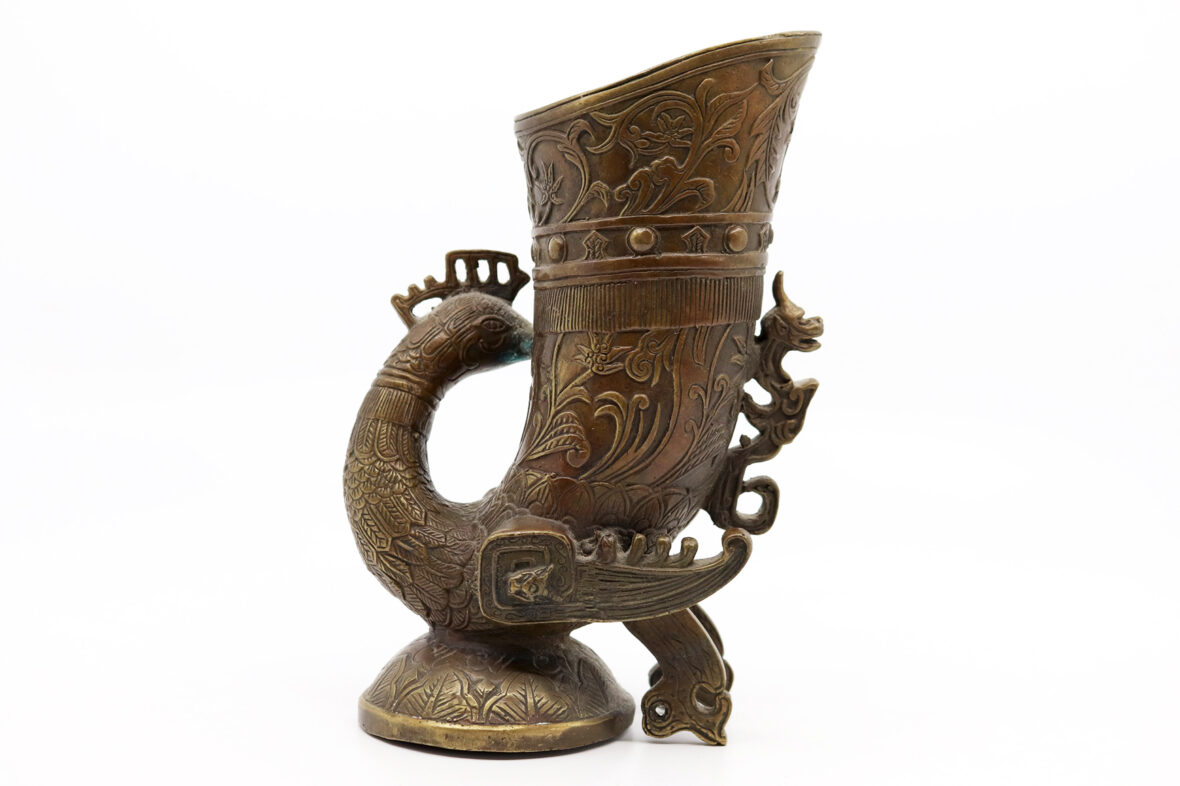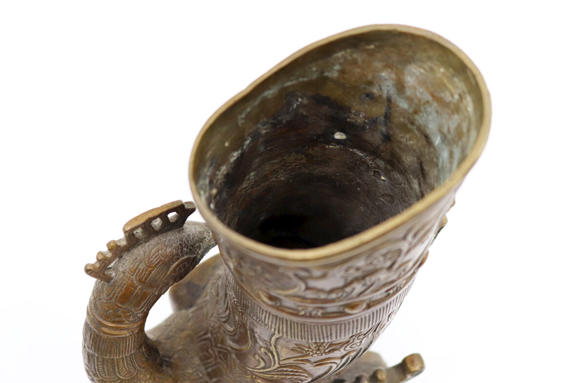 Rhyton en bronze à décor de phénix sur l’anse. Marque apocryphe sous la base « Khang Hy Nien Che » signifiant « Fait à l’époque de Kangxi ».