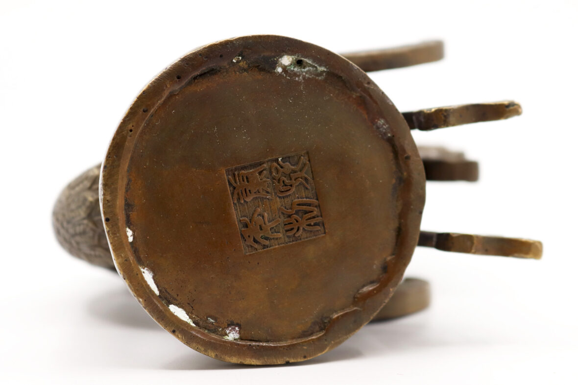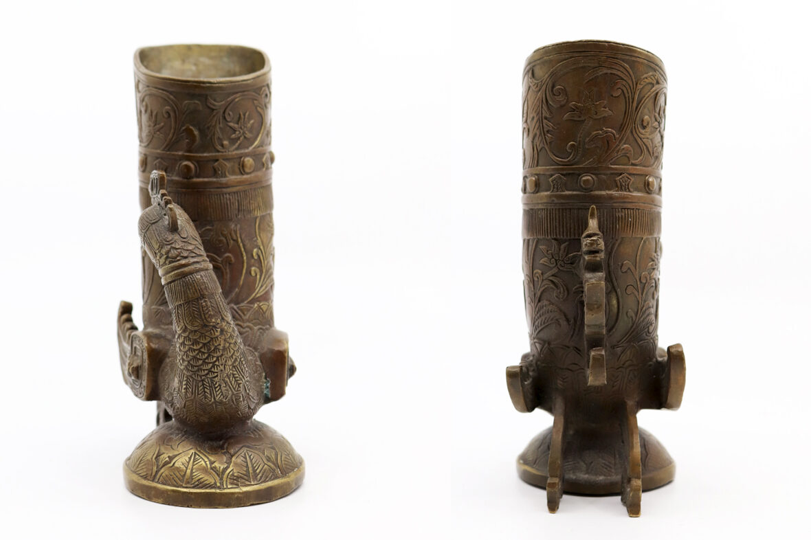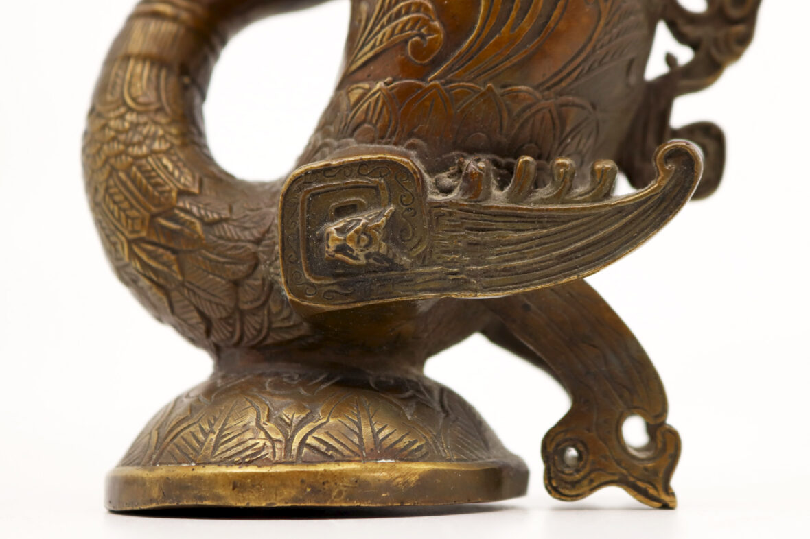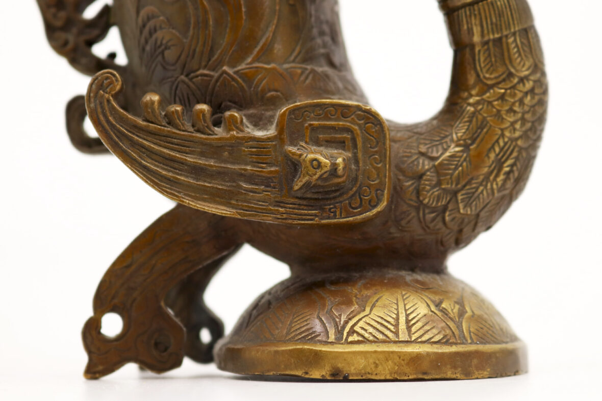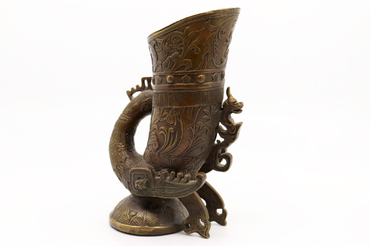 Rhyton en bronze à décor de phénix sur l’anse. Marque apocryphe sous la base « Khang Hy Nien Che » signifiant « Fait à l’époque de Kangxi ».
