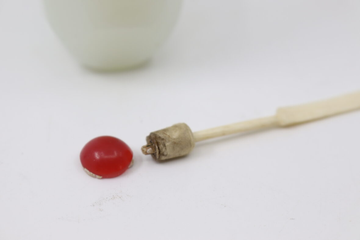 Tabatière à pans coupés en verre opalin, le bouchon en cabochon de pierre dure et verre. (Spatule décollée et manque au bouchon).